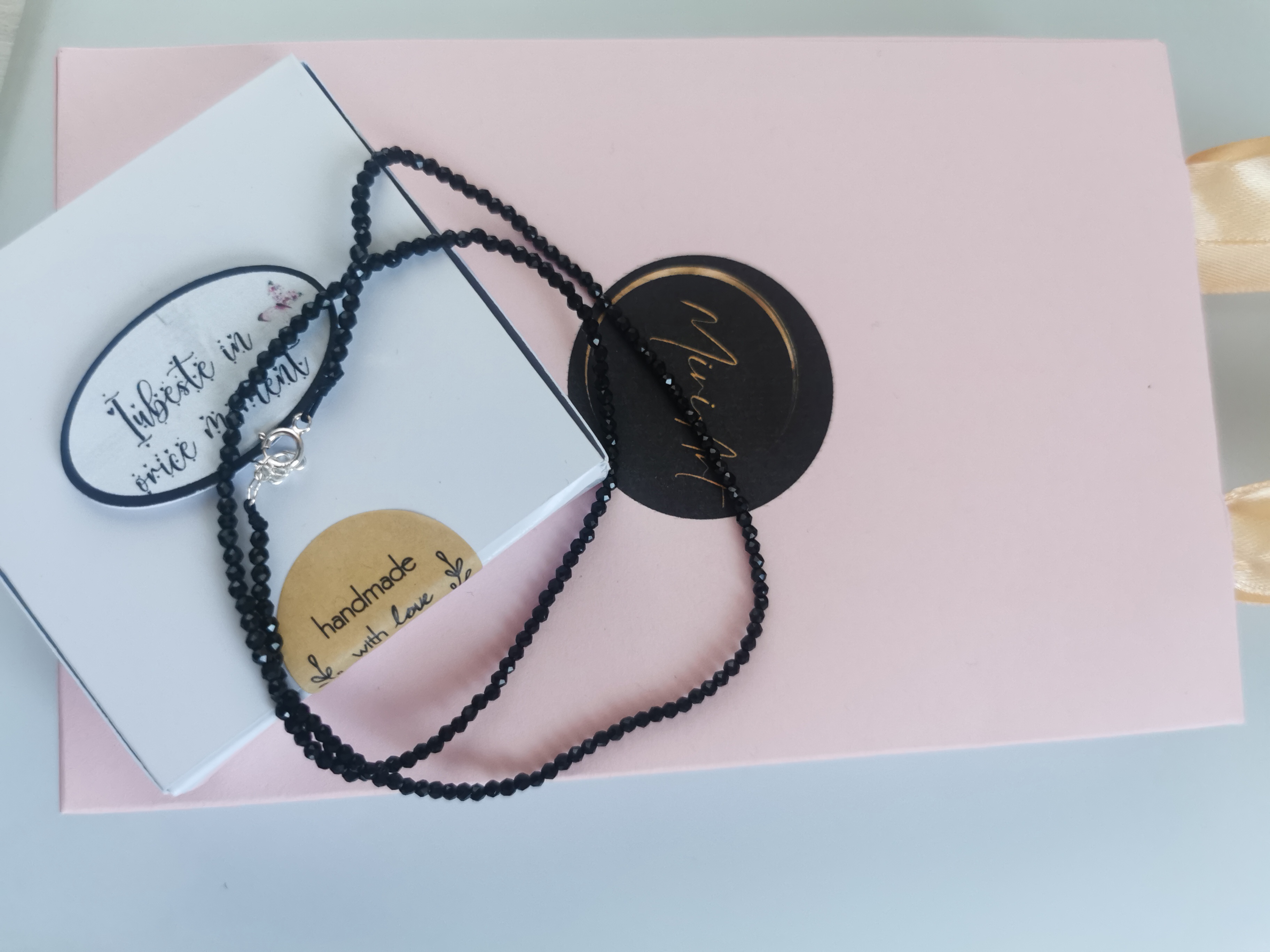 Colierul îmbină farmecul misterios al Spinelului de 2mm natural cu eleganța metalului prețios.