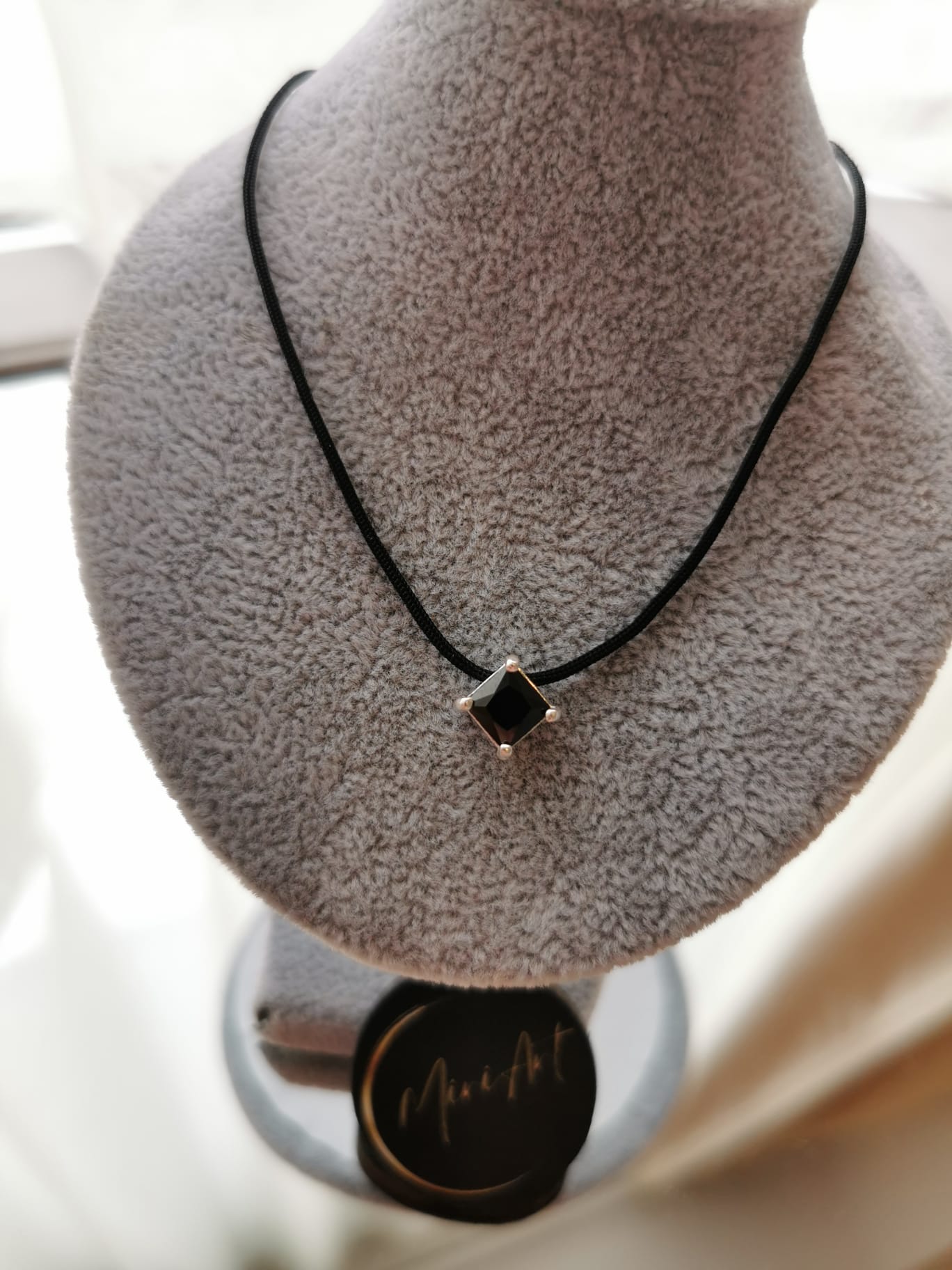 Montat pe un șnur negru gros, extrem de rezistent, colierul se remarcă prin durabilitate și versatilitate.