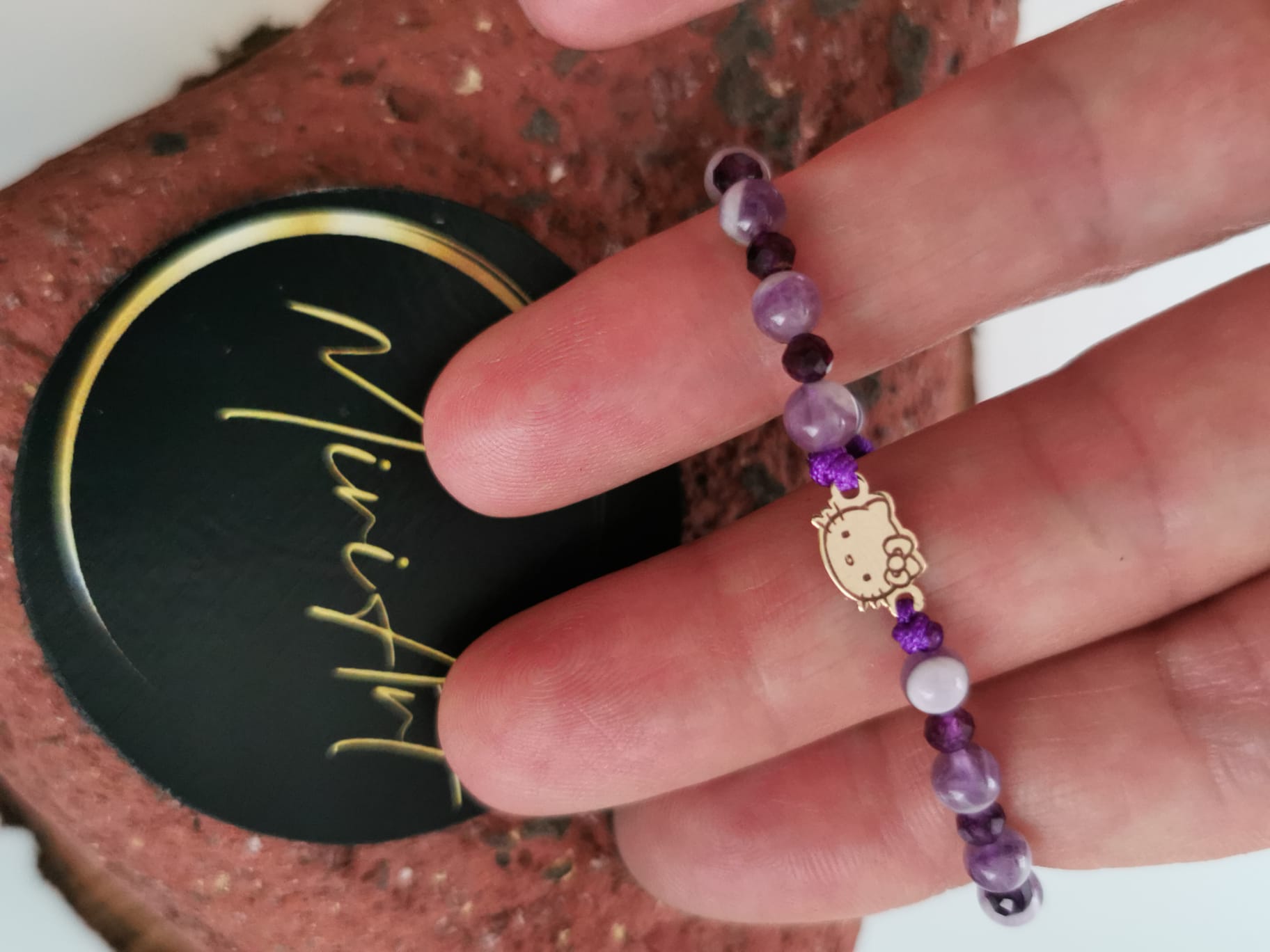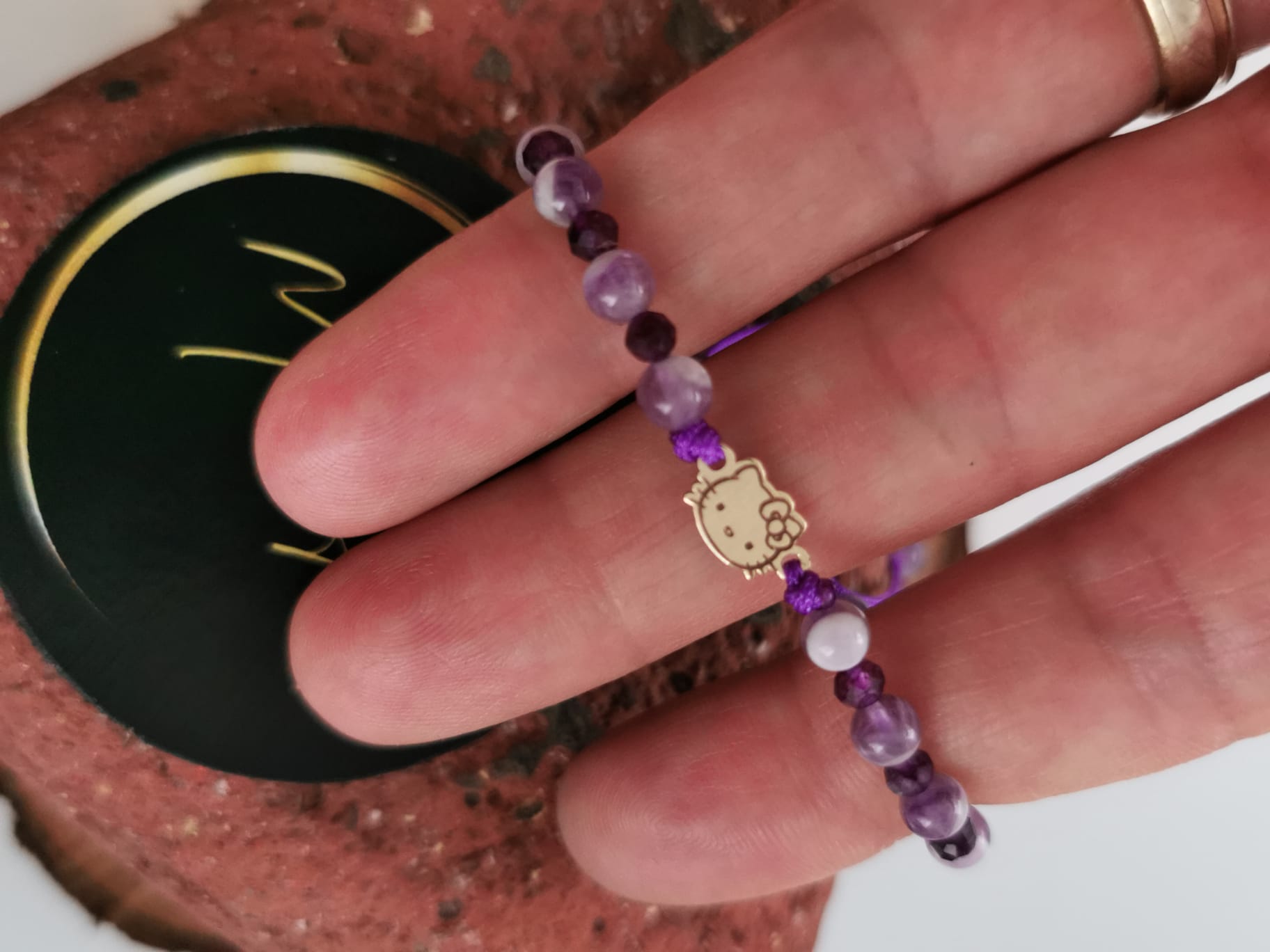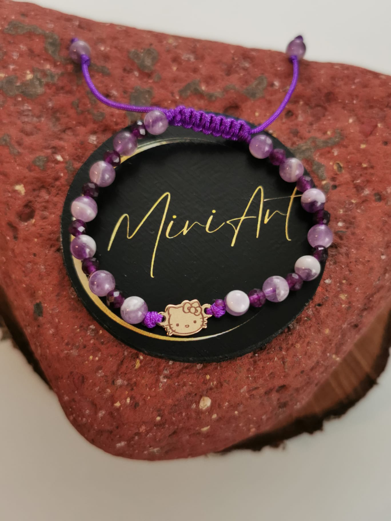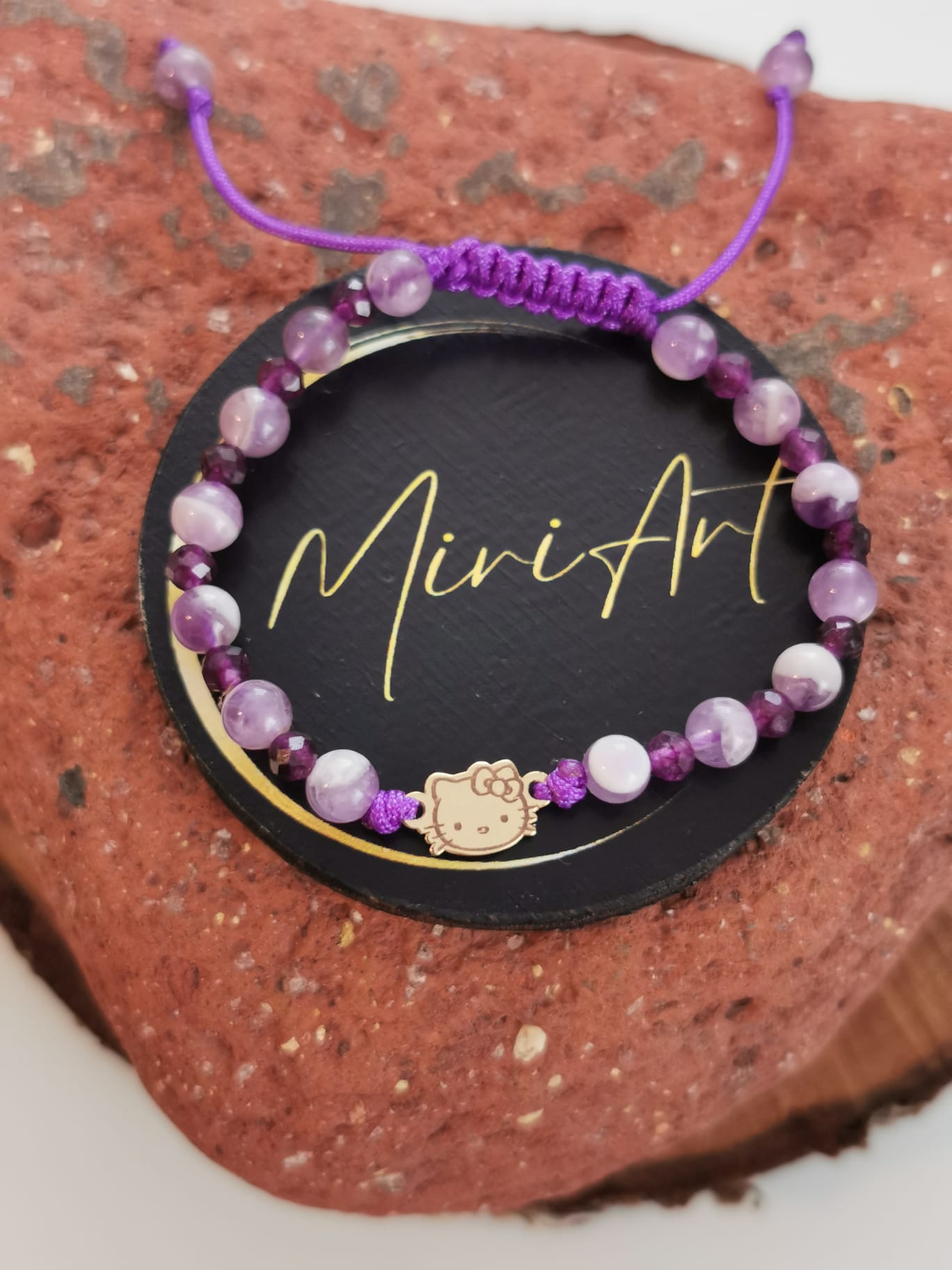 Bratara handmade cu pandantiv Hello Kitty de aur 14k, pietre semiprețioase și închidere împletită, reglabilă, ușor de ajustat și se potrivește oricărei încheieturi.