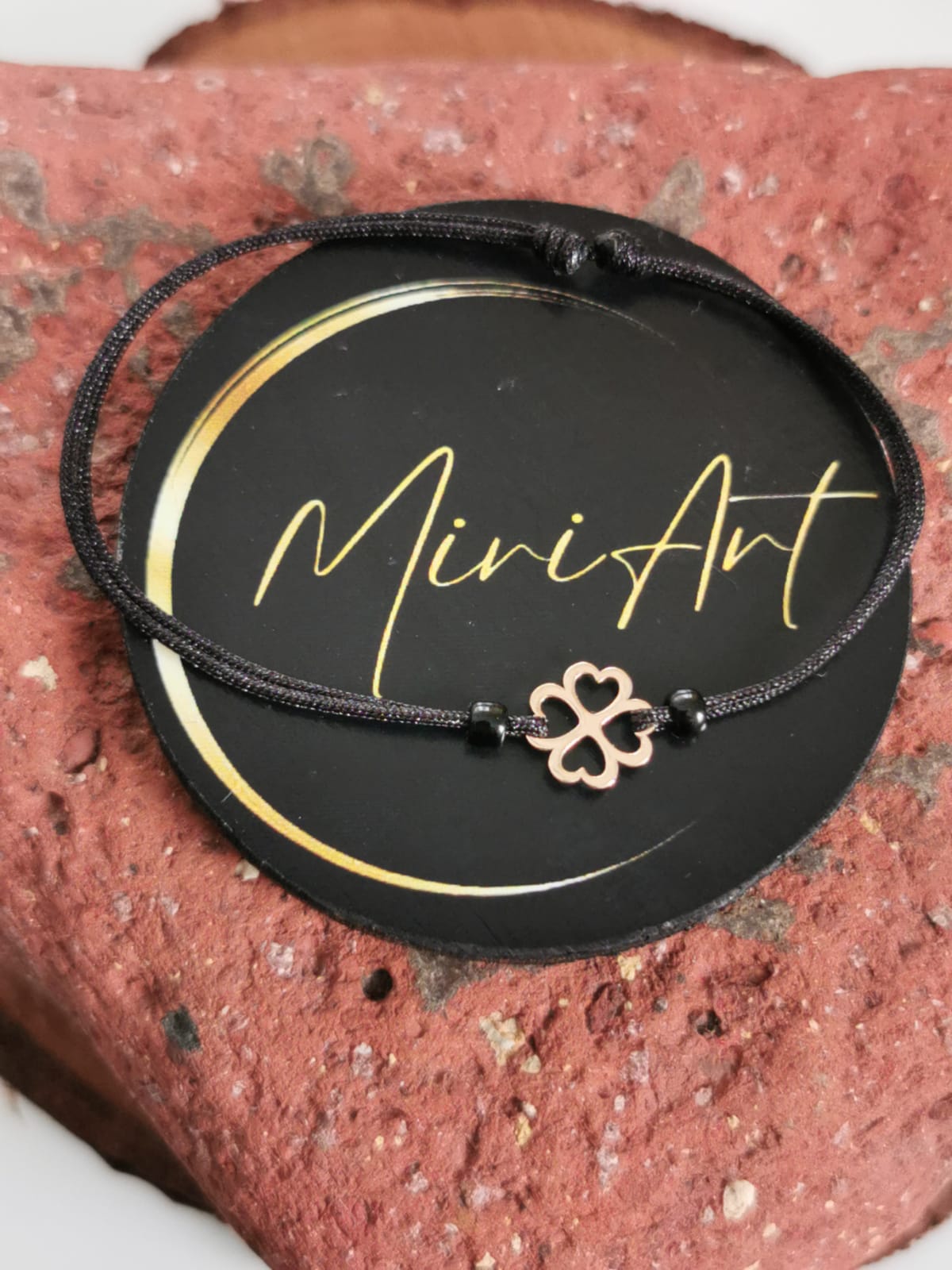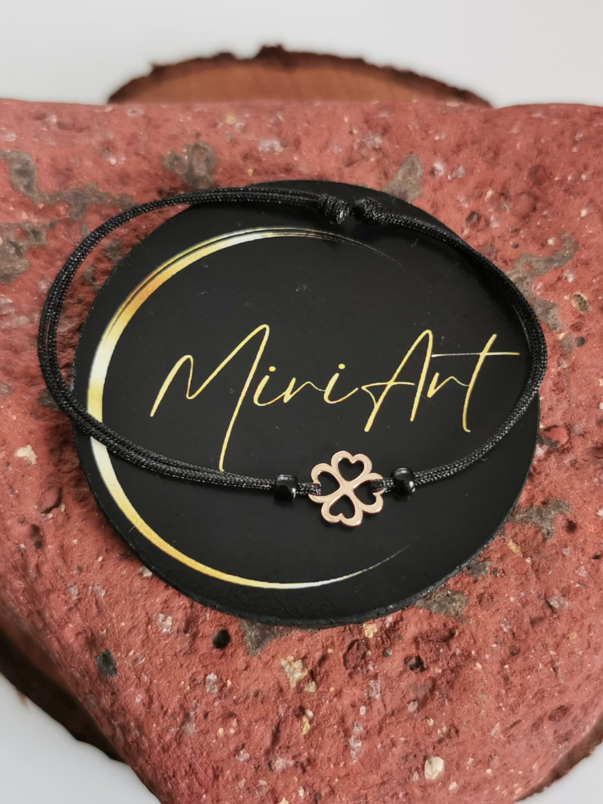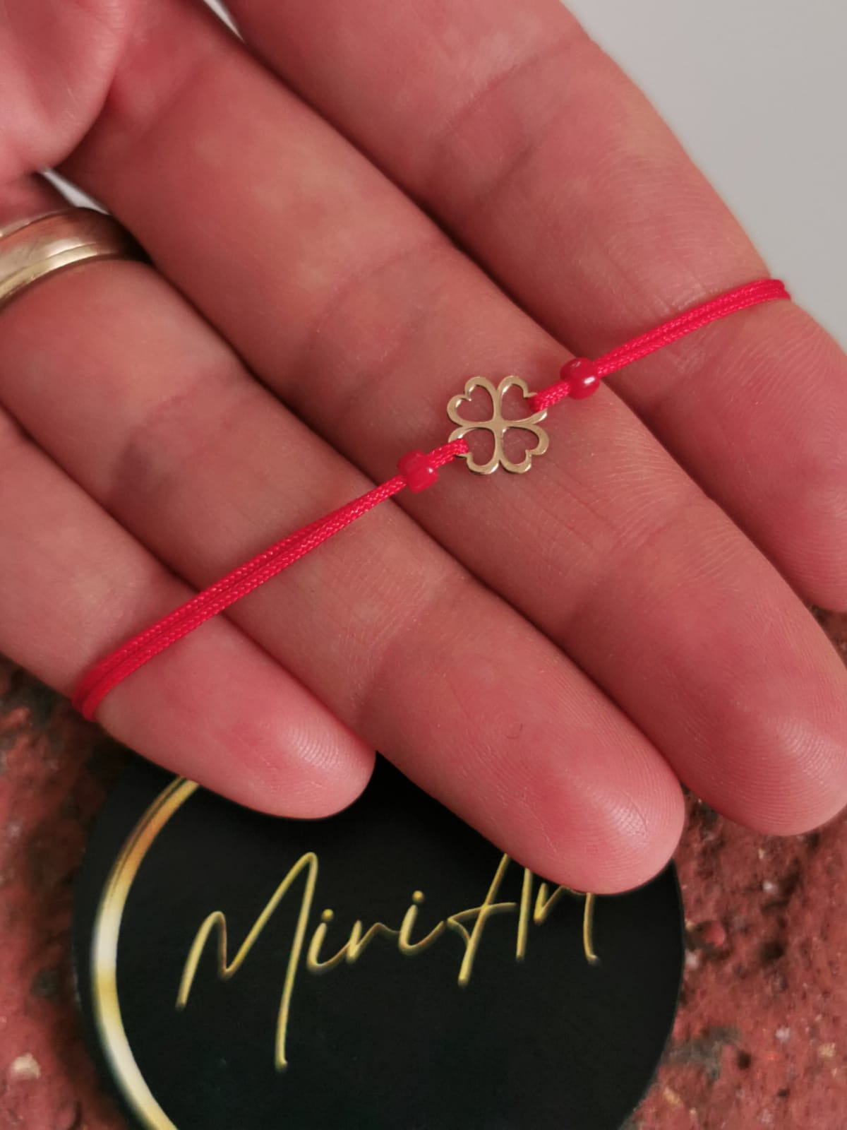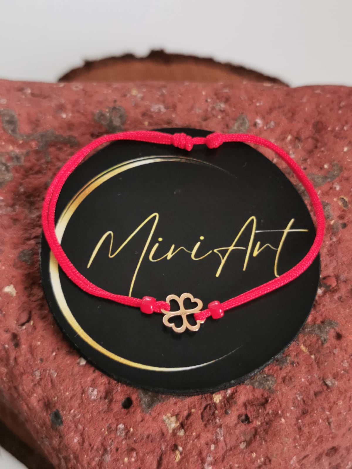 Brățară handmade cu pandantiv trifoi din aur 14k, montat pe un șnur rezistent, cu închidere reglabilă cu noduri, ușor de ajustat și potrivită oricărei încheieturi.