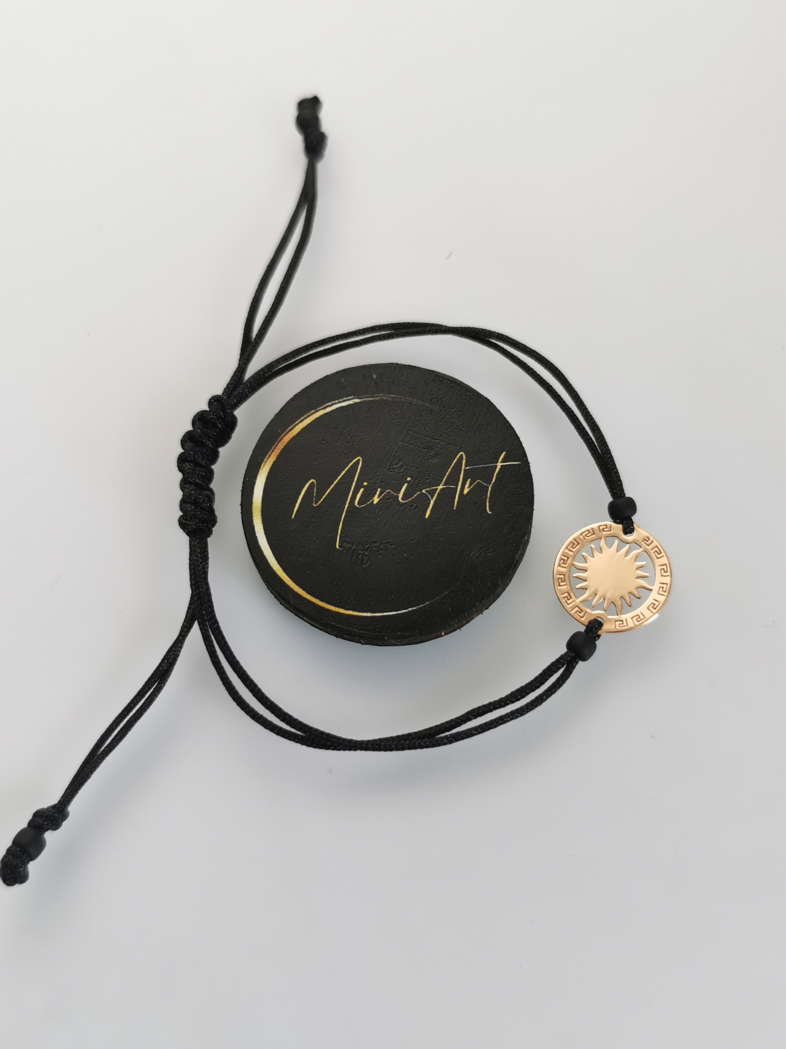 Brățară handmade cu pandantiv soare din aur 14k, montat pe un șnur rezistent, cu închidere împletită, reglabilă, ușor de ajustat și se potrivește oricărei încheieturi.