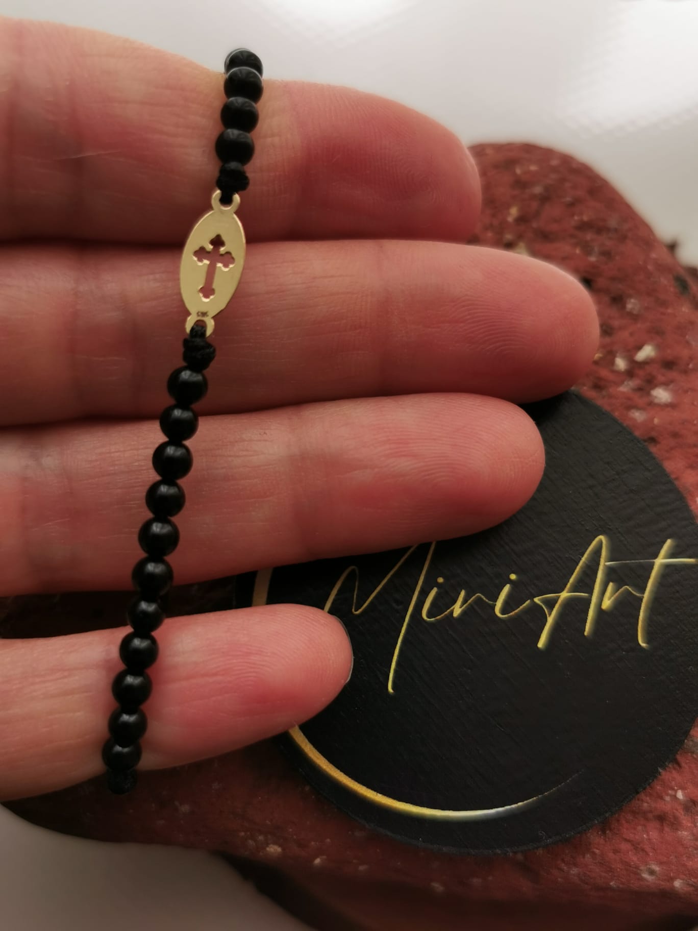 Brățară handmade cu pandantiv cruce în oval din aur 14k, pietre semiprețioase, montate pe un șnur rezistent, cu închidere reglabilă cu noduri, ușor de ajustat și se potrivește oricărei încheieturi.