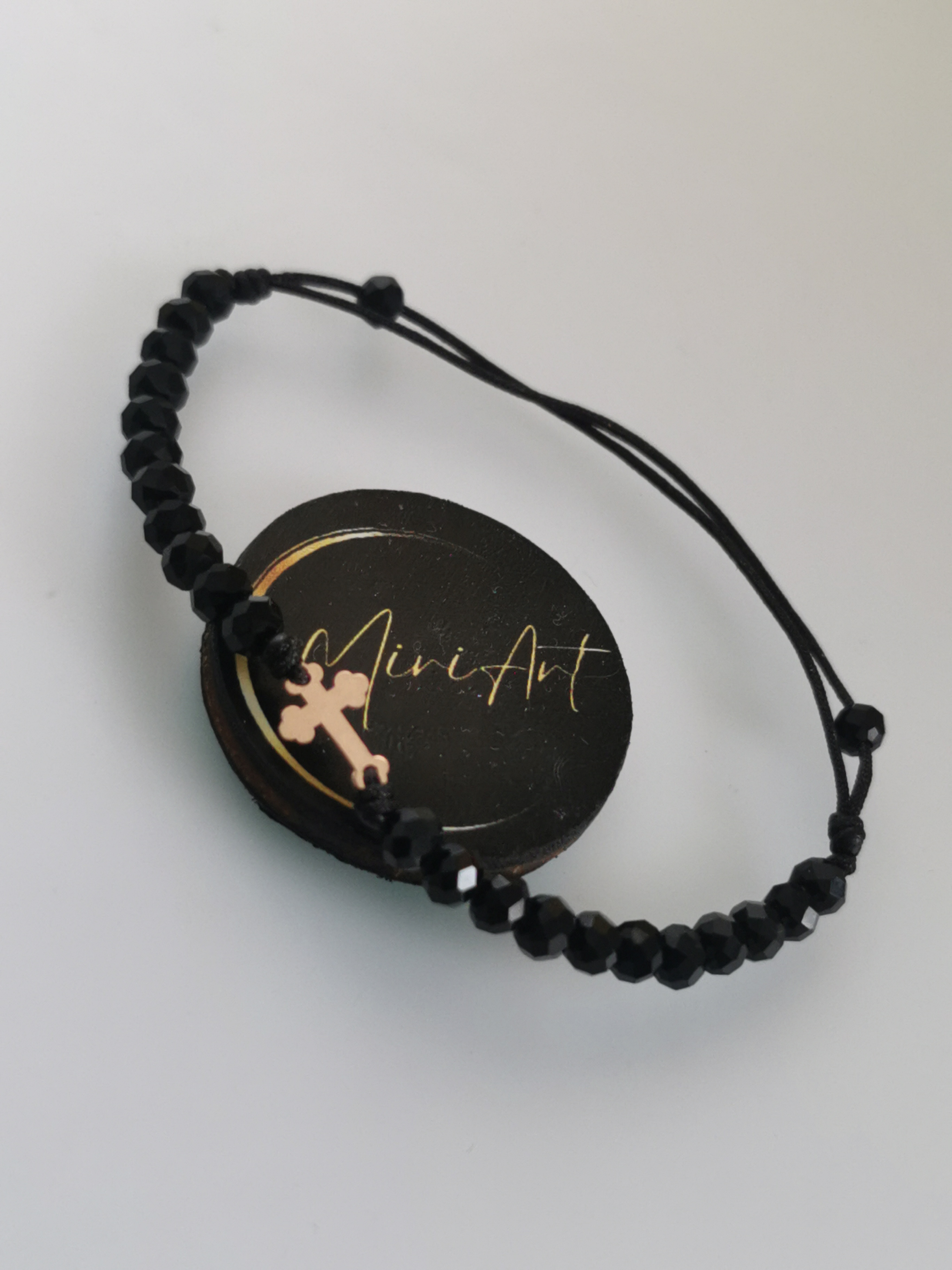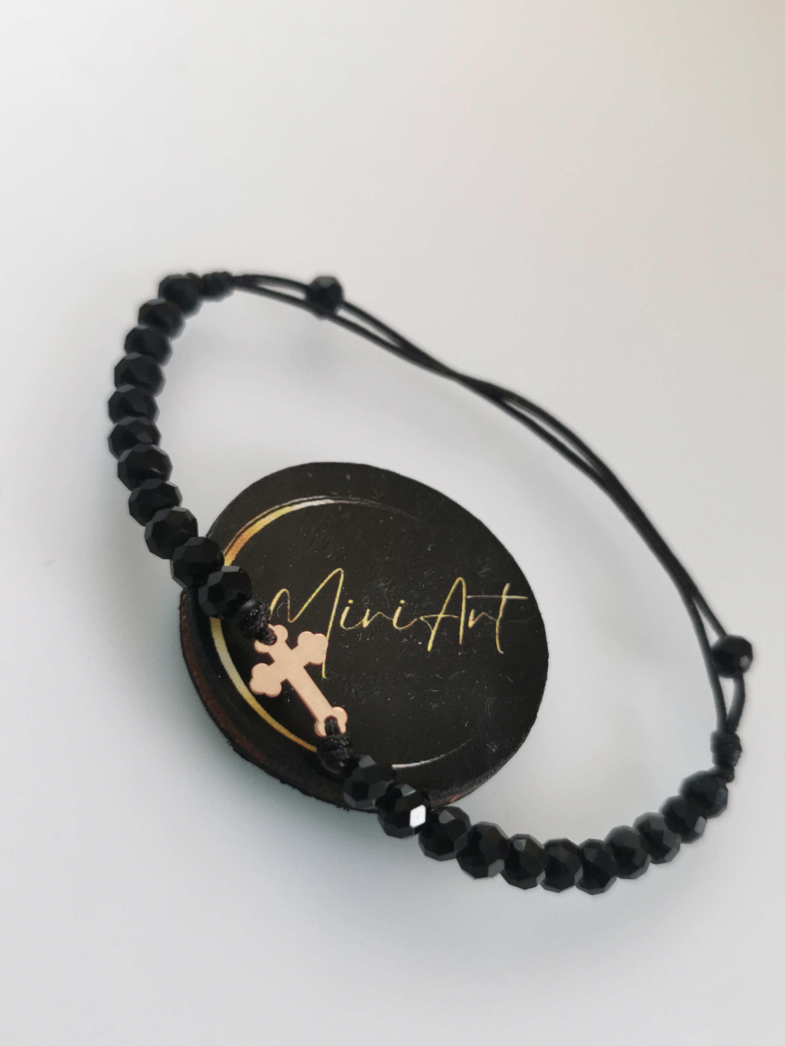 Brățară handmade cu pandantiv cruce mică din aur 14k, cristale de sticlă și închidere reglabilă cu noduri, ușor de ajustat și se potrivește oricărei încheieturi.