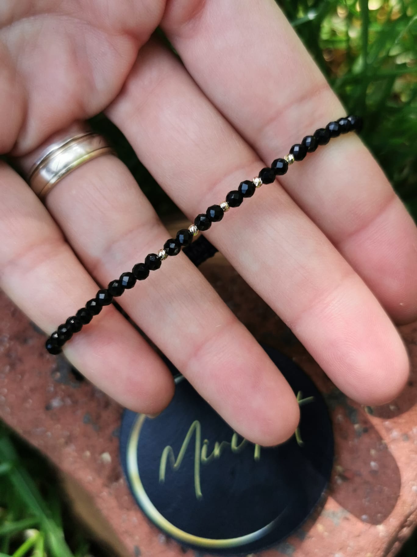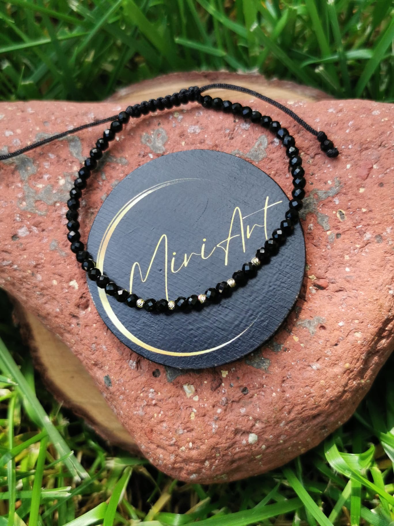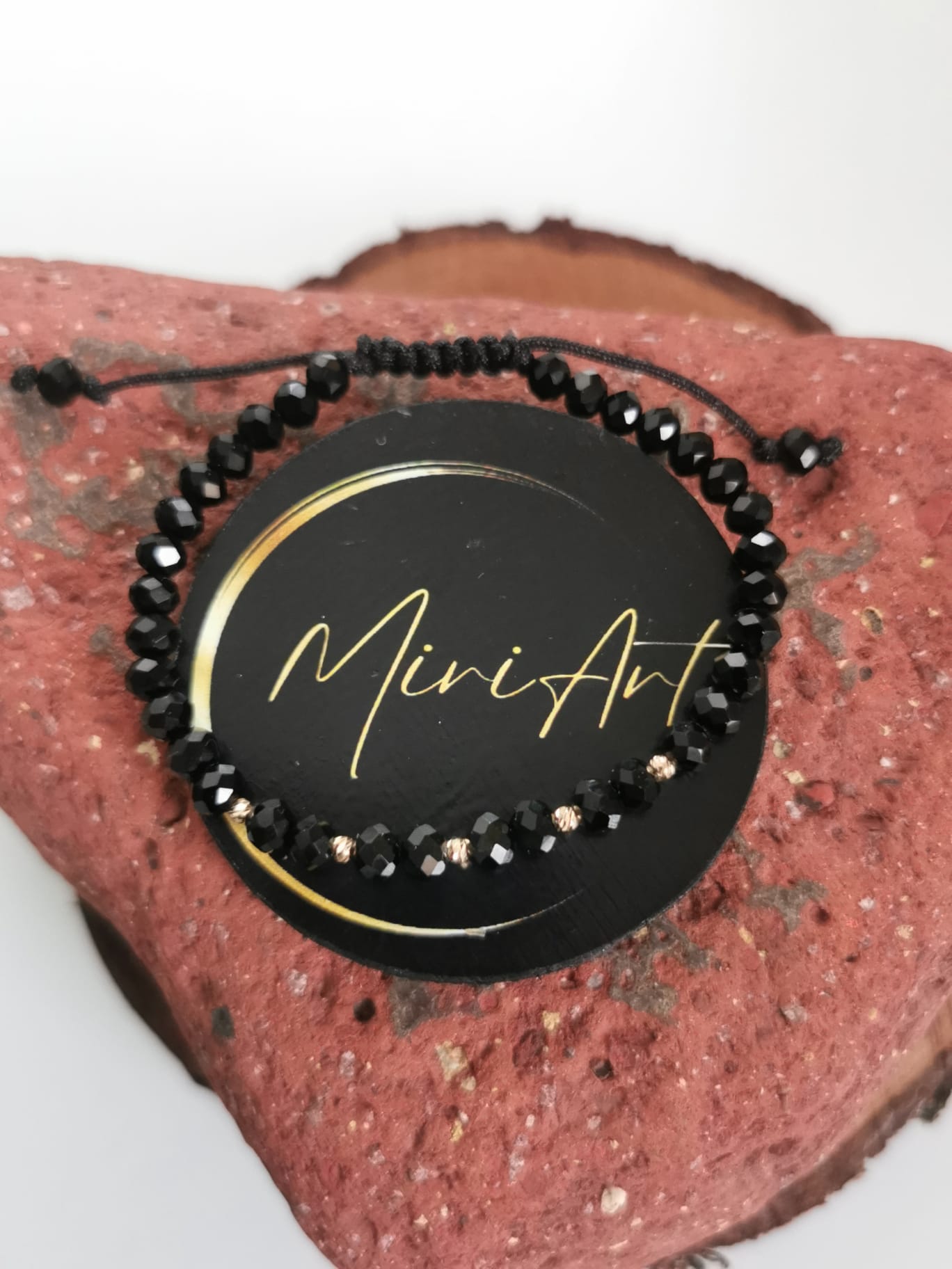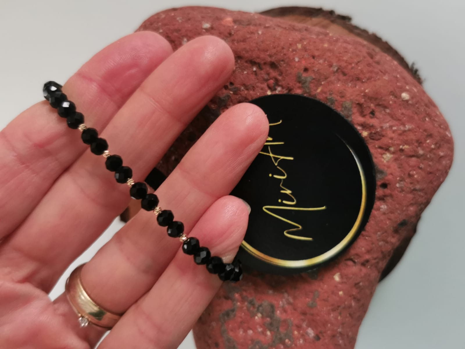 Brățara Eleganță Neagră este o interpretare modernă a stilului clasic, ce combină strălucirea discretă a cristalelor negre cu accentele prețioase ale aurului 14K.