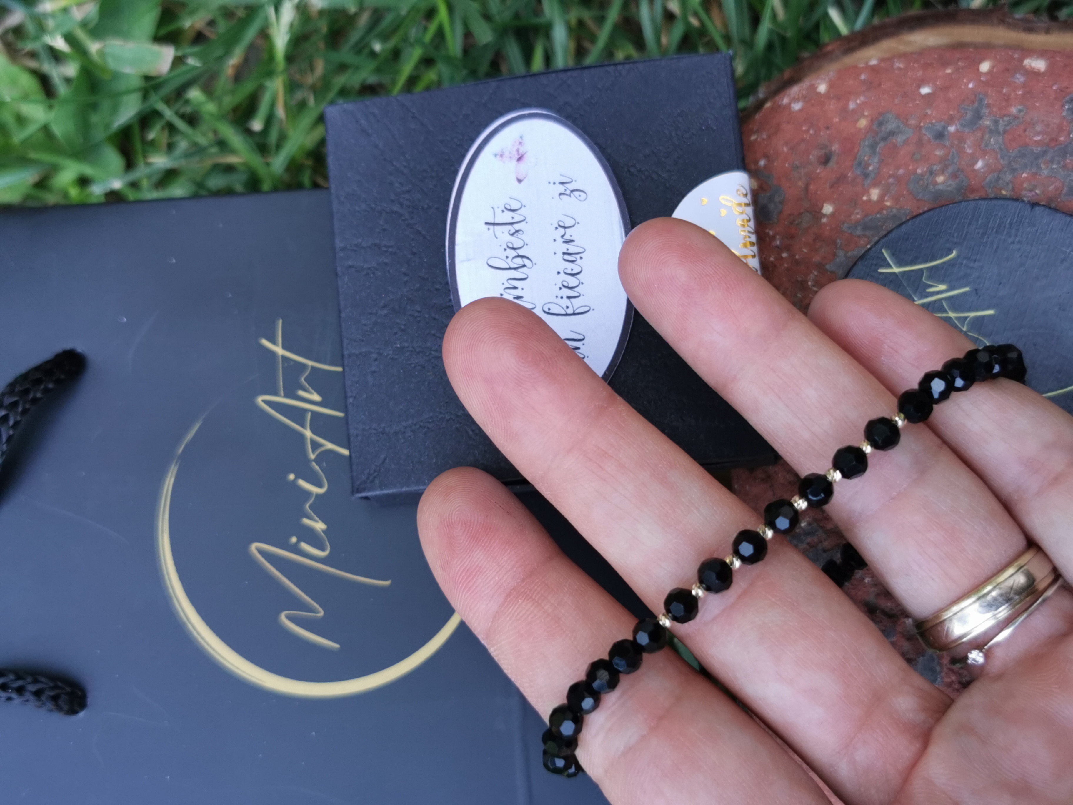 Brățara Esență de Cristal aduce în prim-plan cristale de sticlă de 3mm, în nuanțe intense de negru, cu tăieturi fine care captează subtil lumina.
