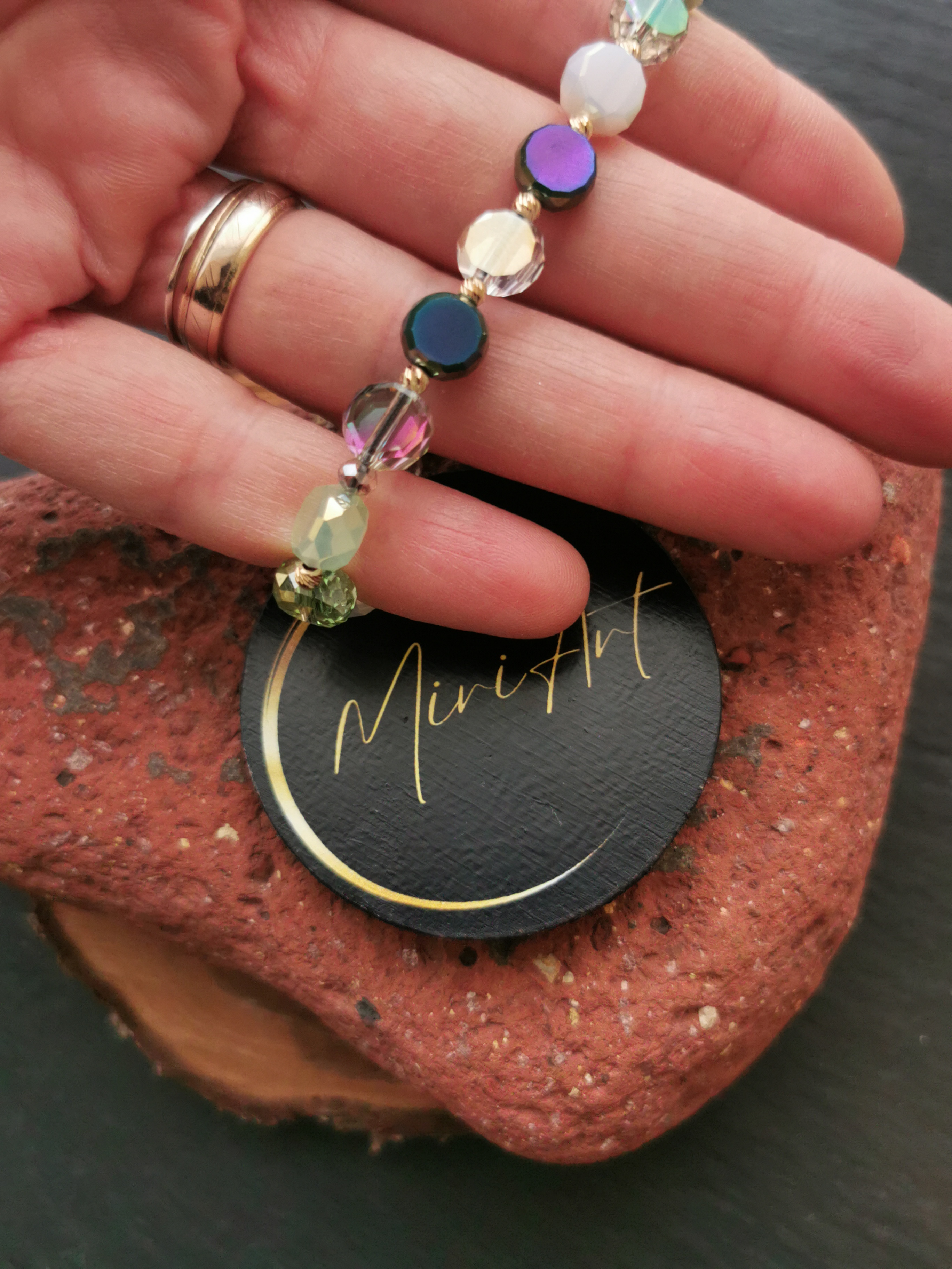 Cristalele fațetate plate de 6mm reflectă lumina cu o strălucire difuză și tandră, iar cele 9 sfere din aur 14K adaugă o prețiozitate discretă, potrivită atât pentru ținute de zi, cât și pentru momente speciale.