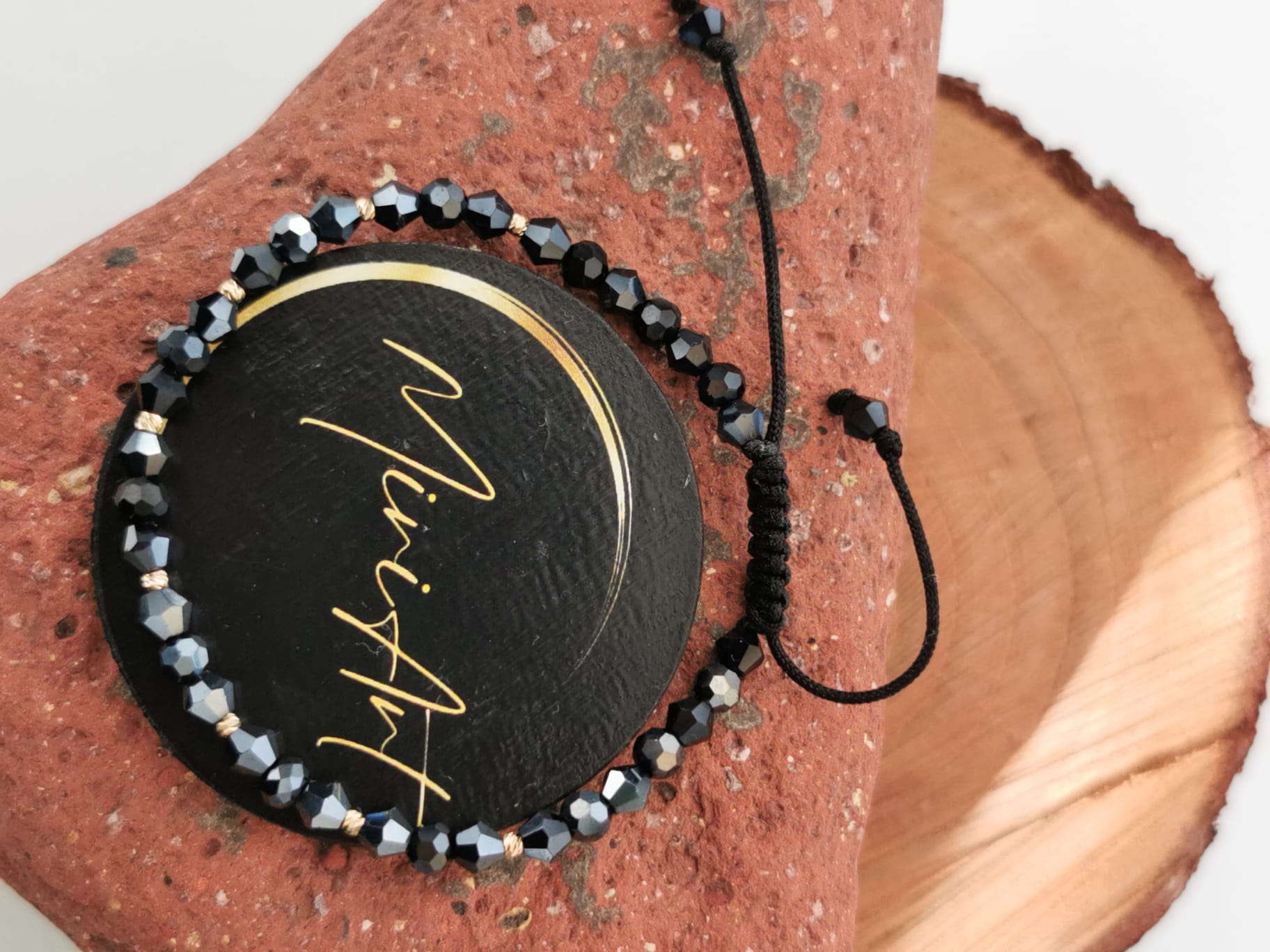 Brățara Noapte Aurie combină cristale biconice și fațetate de sticlă de 4mm, în nuanțe bleumarin adânc, cu reflexii aurii subtile ce oferă un efect vizual captivant.