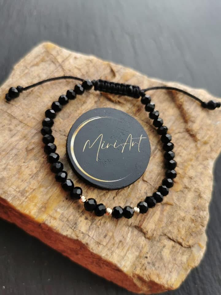 Brățara Noapte de Cristal este compusă din cristale negre de sticlă de 4mm, fațetate cu grijă pentru a crea o bijuterie discretă, dar vizibilă în orice lumină.