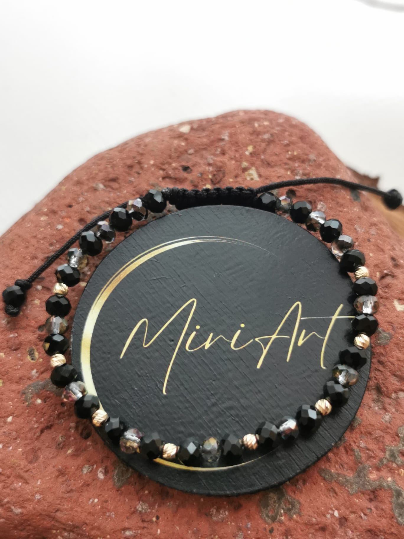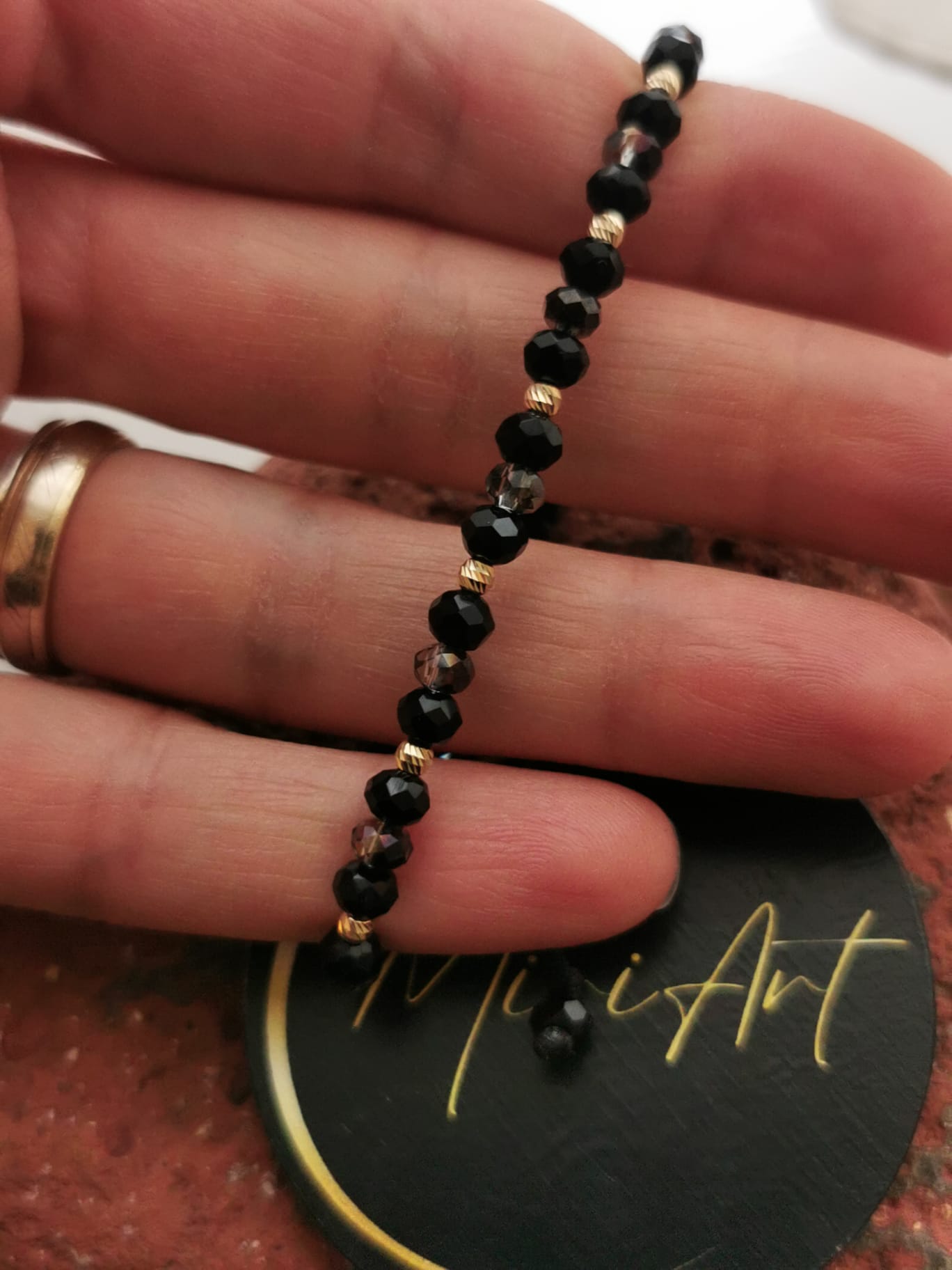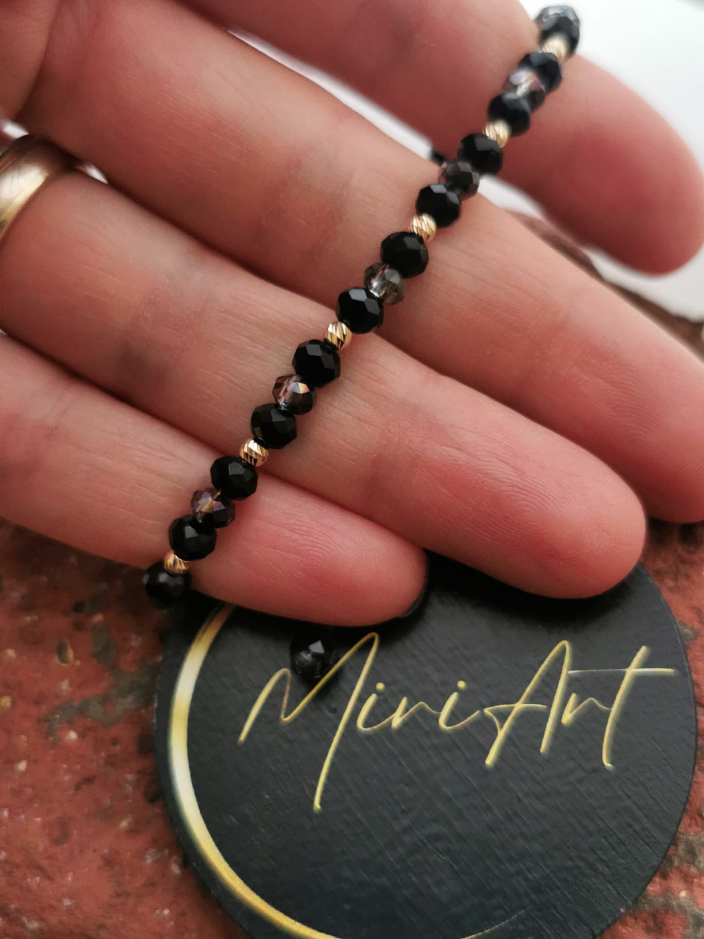Cristalele de 3mm negre și transparente reflectă lumina discret, evocând senzația de calm, profunzime și rafinament.