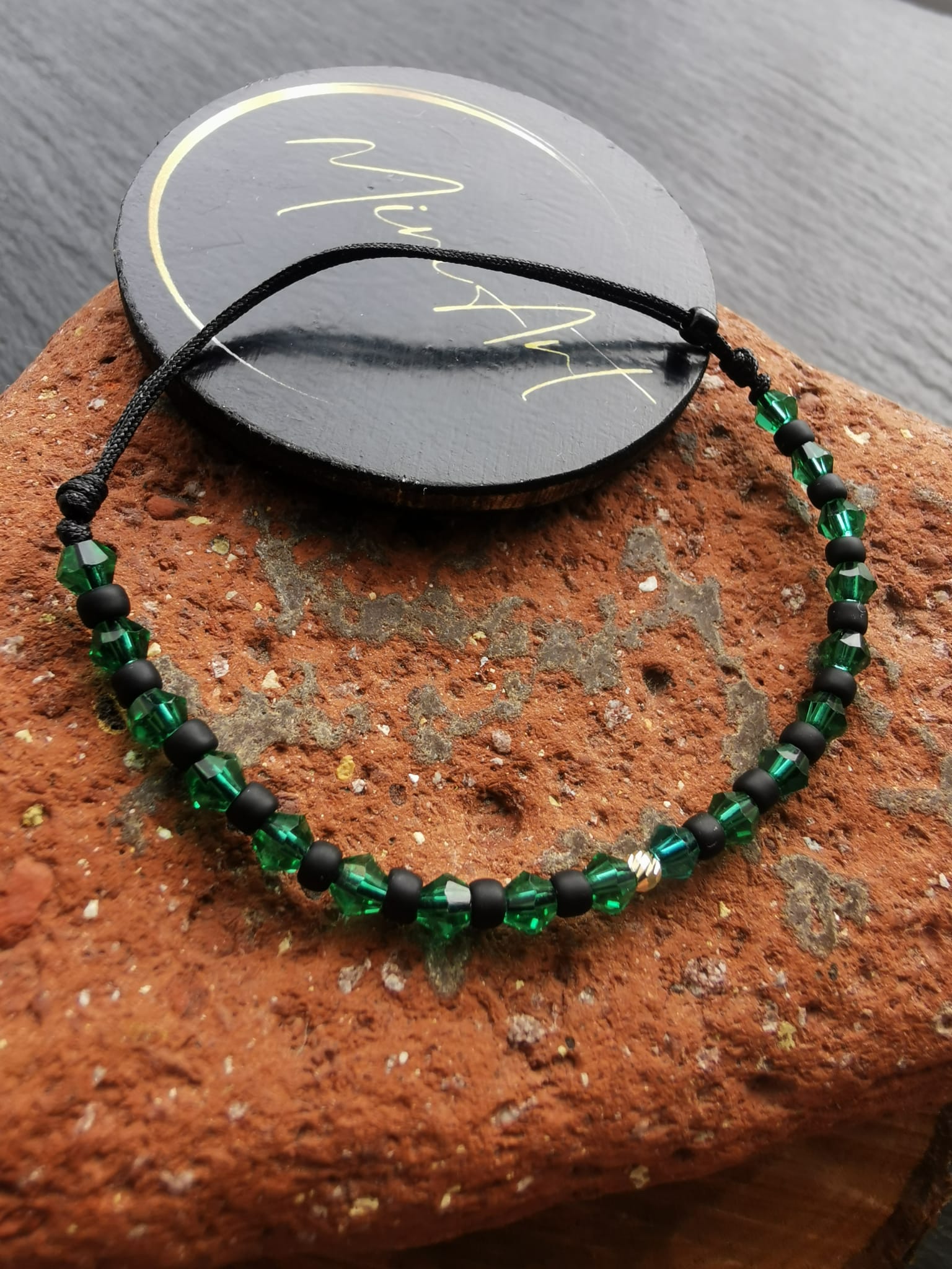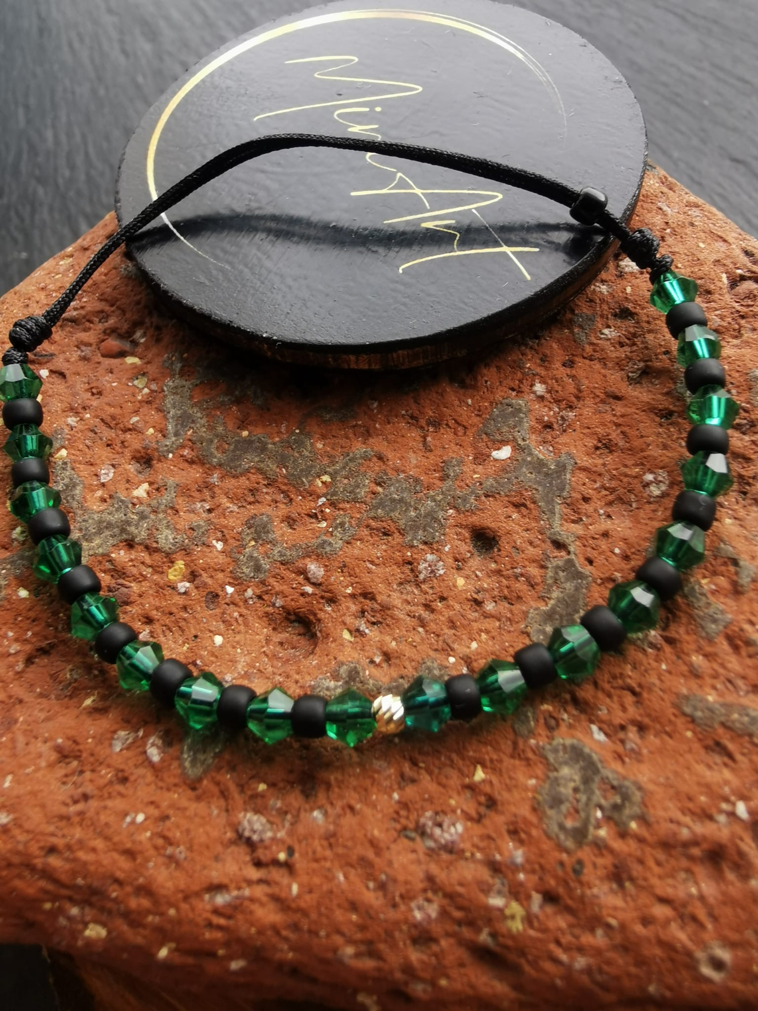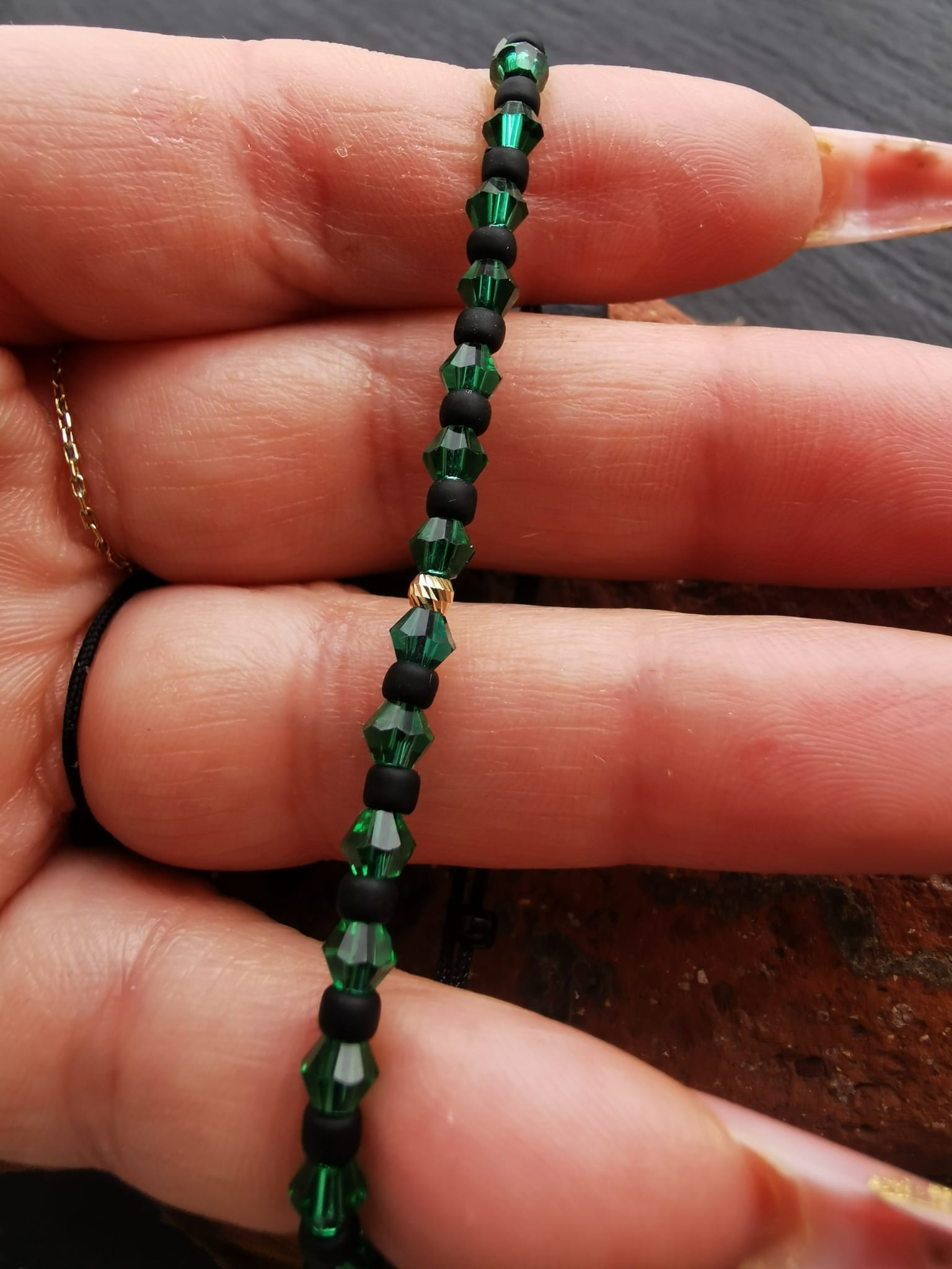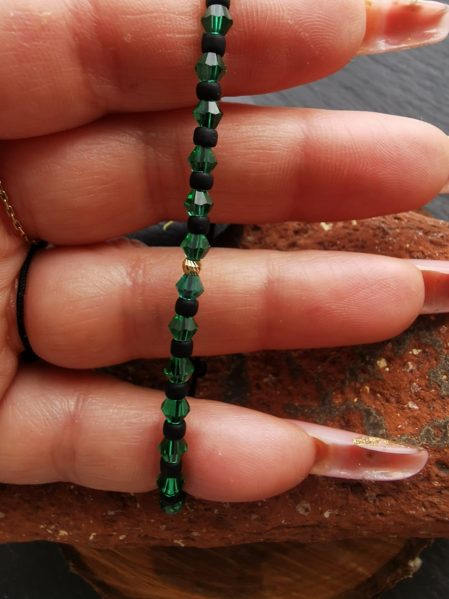 Verdele intens al cristalelor de 3mm evocă frunzele tinere, în timp ce mărgelele Toho negre oferă adâncime și un contrast modern.