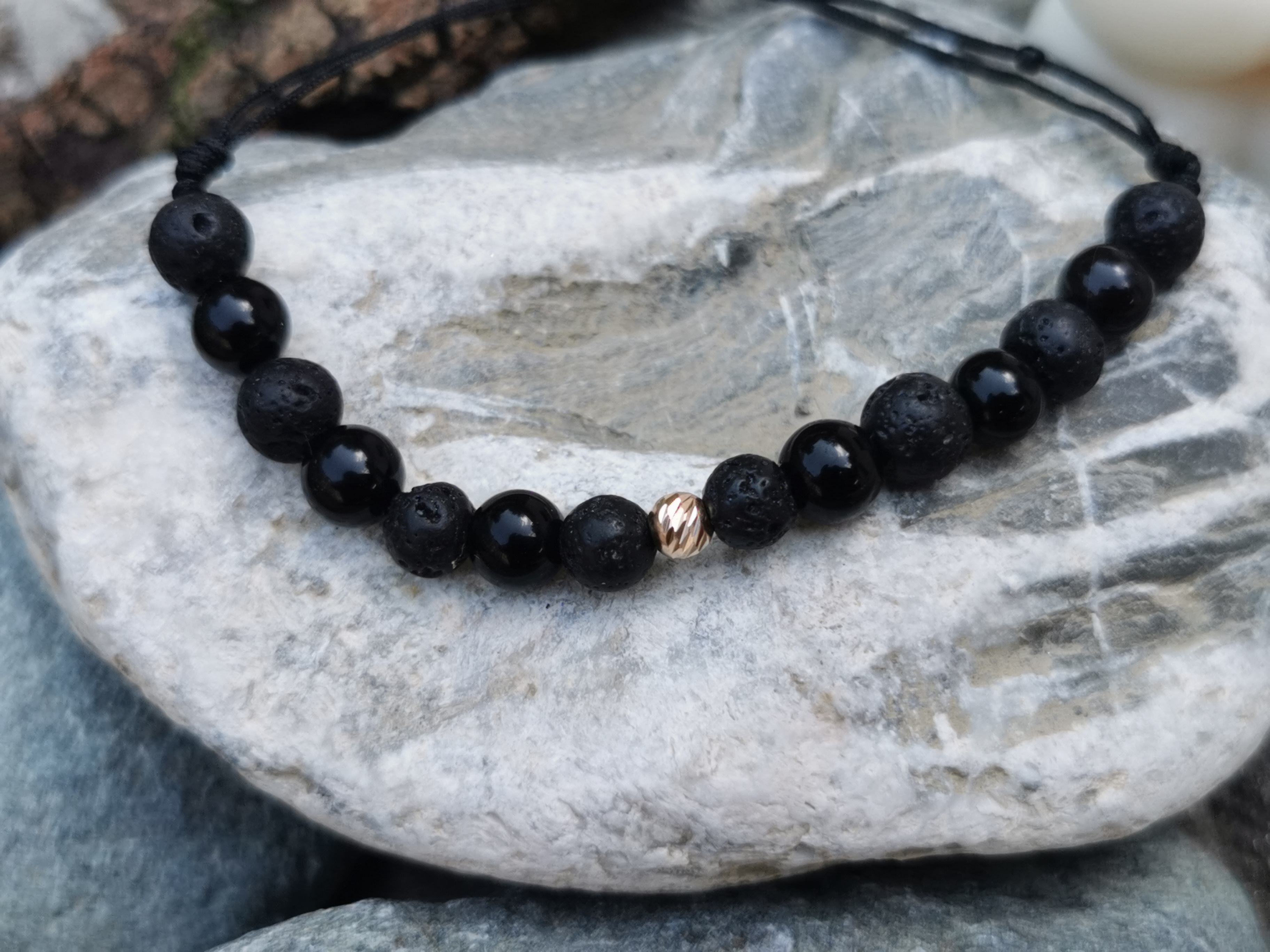 Brățara Vulcan Negru - combinația dintre Rocă Vulcanică de 6mm– piatra energiei brute și a transformării interioare – și Onix de 6mm – piatra protecției și a echilibrului – susține forța interioară, stabilitatea și calmul în fața provocărilor.