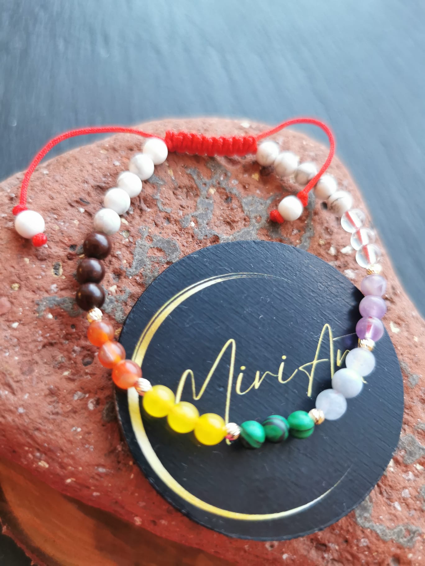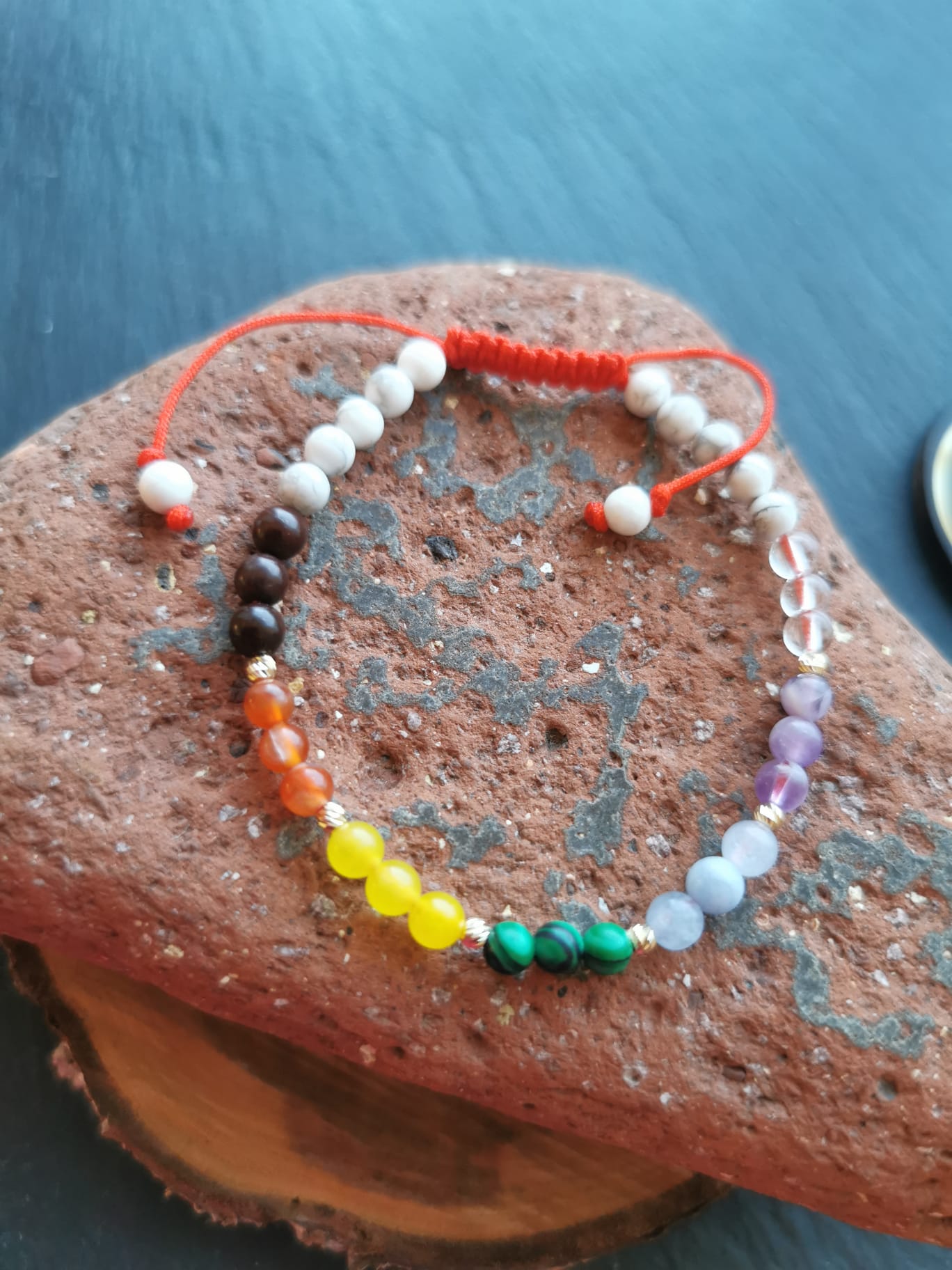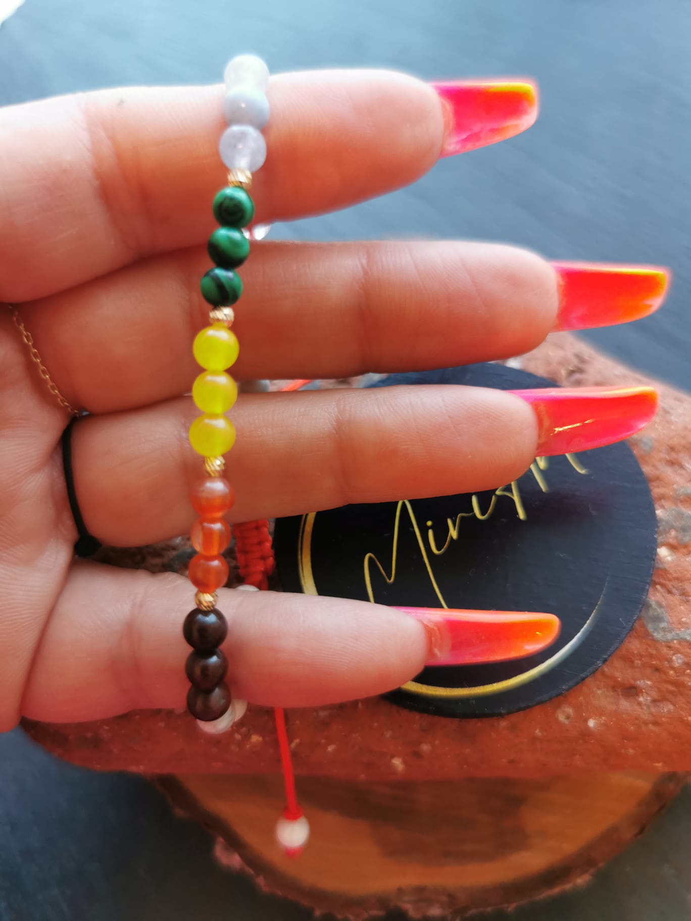Brățara 7 Chakre – Aur și Claritate realizată cu o selecție de pietre semiprețioase – Ochi de Taur de 4mm, Carneol de 4mm, Agat de 4mm, Malachit de 4mm, Acvamarin de 4mm, Ametist de 4mm, Cuarț de 4mm și Howlit de 4mm – această brățară susține armonia interioară, energia pozitivă și claritatea mentală.