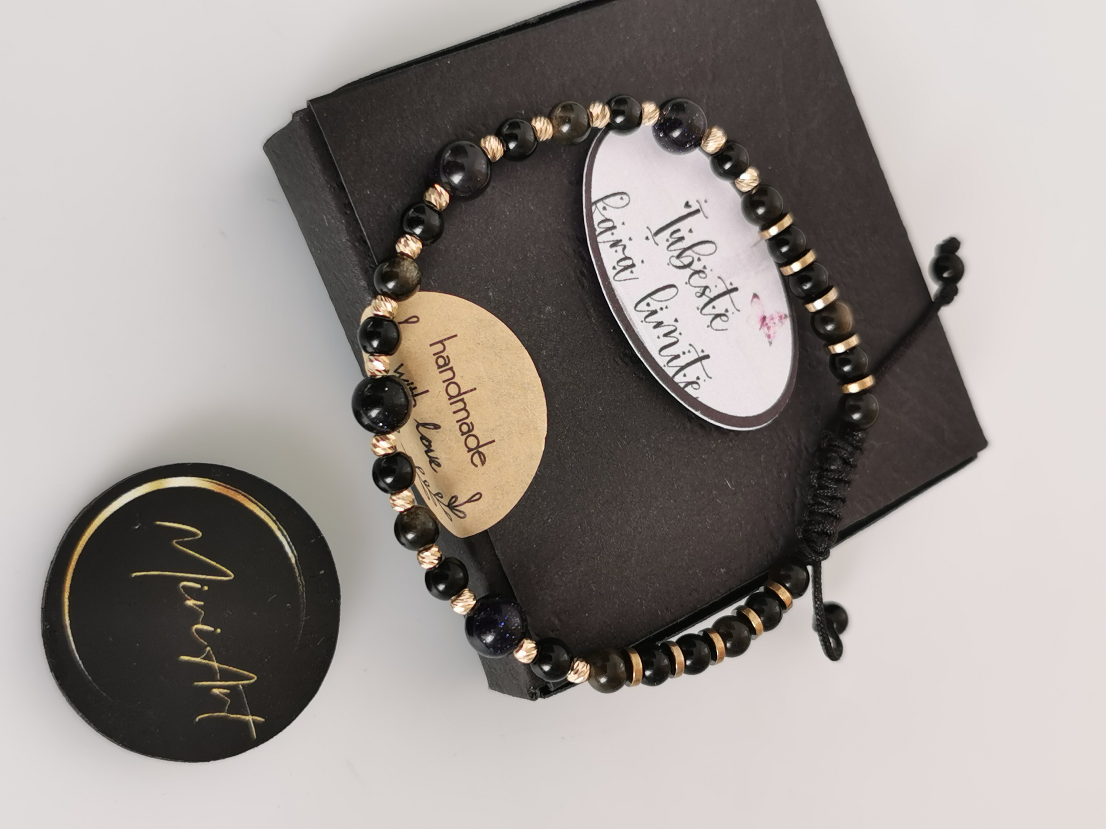 Brățara Cosmică este realizată dintr-o combinație de pietre cu vibrație profundă: Onix de 4mm oferă stabilitate și protecție, Obsidianul de 4mm curăță energiile negative și susține introspecția, Piatra Soarelui de 6mm aduce vitalitate și optimism, discurile Hematit ancorează și echilibrează, iar împreună, aceste pietre creează o conexiune simbolică între lumină și întuneric, forță și calm, vizibil și invizibil.