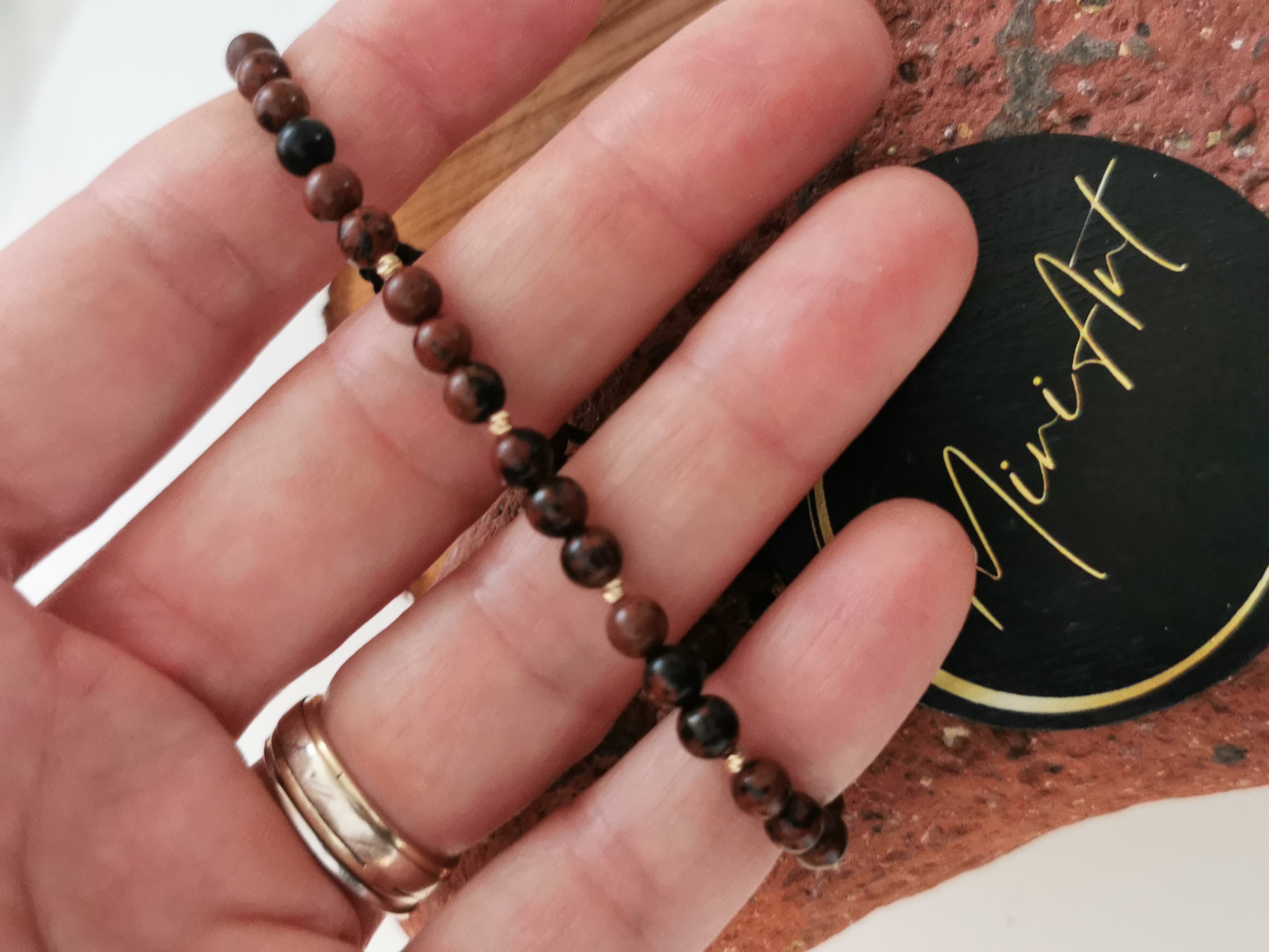 Brățara Puterea Pământului realizată din Obsidian Mahon de 4mm– piatra protecției absolute, a clarității și a eliberării de energii negative – această brățară transmite o forță liniștită, dar profundă. Obsidianul este asociat cu stabilitatea, ancorarea și curajul de a privi în interior.