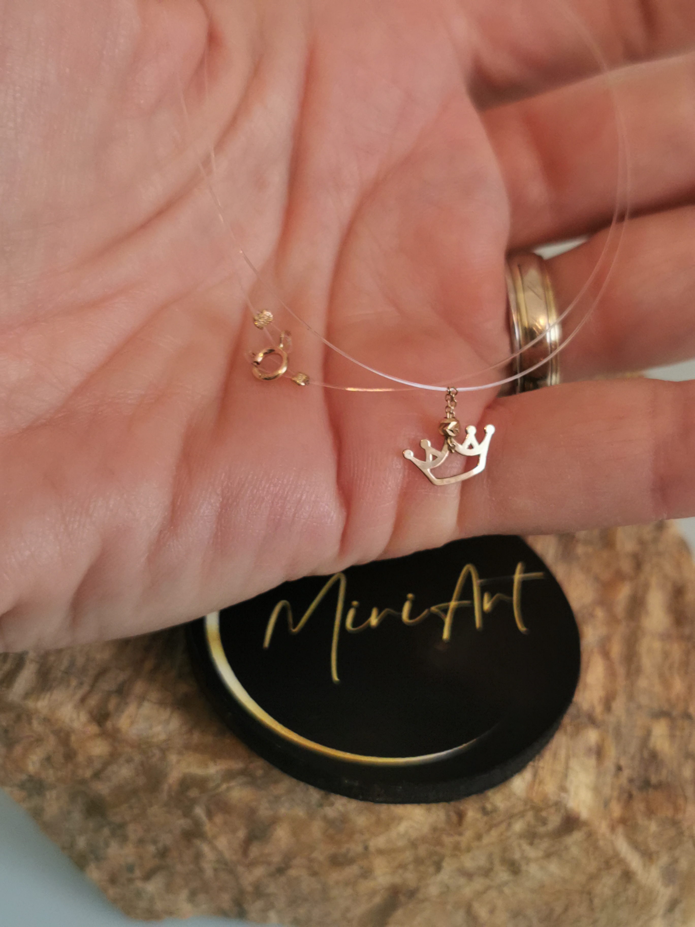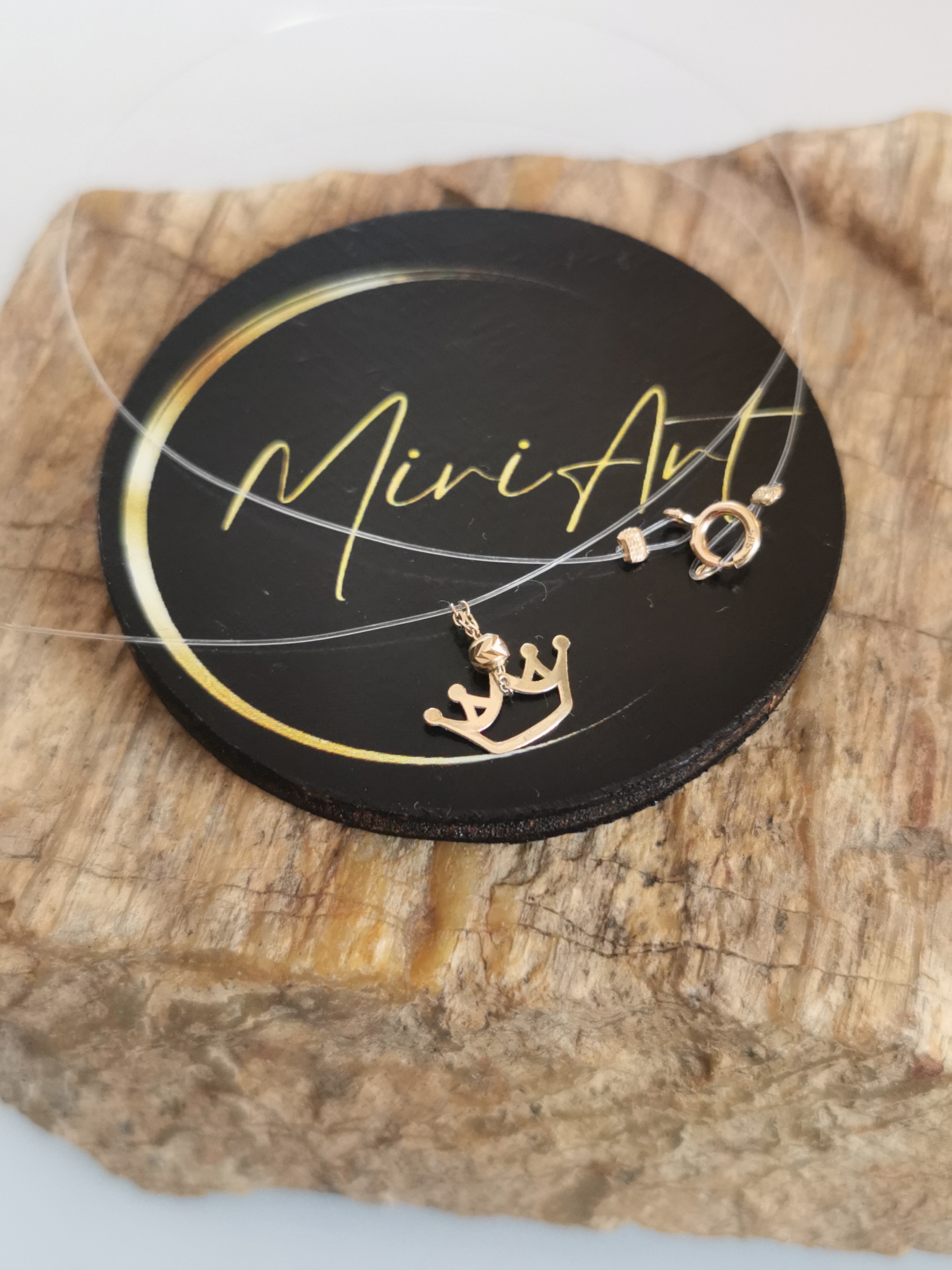 Realizat pe fir transparent, colierul aduce în prim-plan un pandantiv în formă de coroniță din aur 14k, completat de o închidere delicată din același metal prețios.