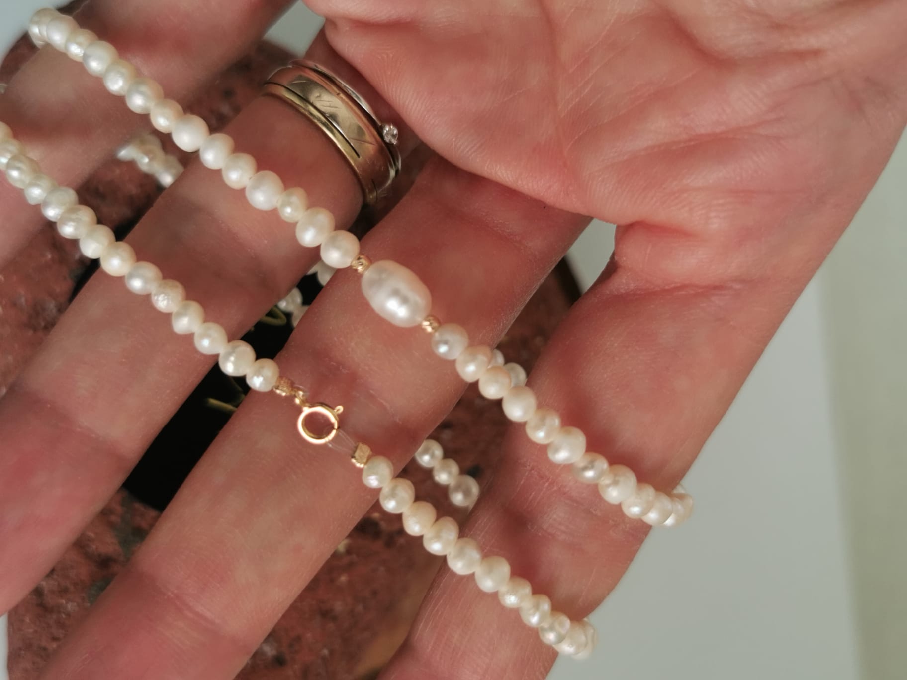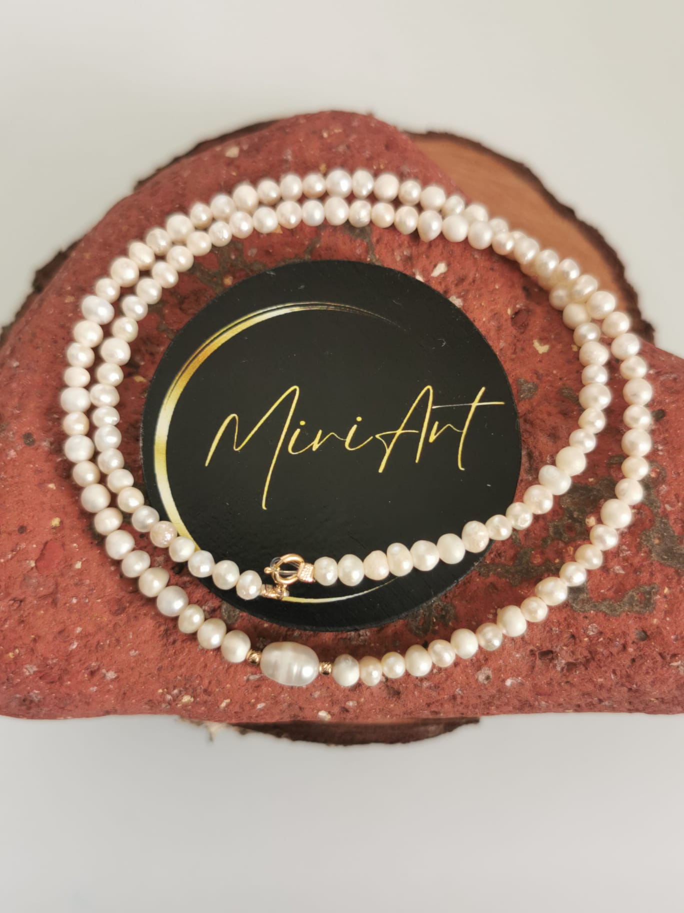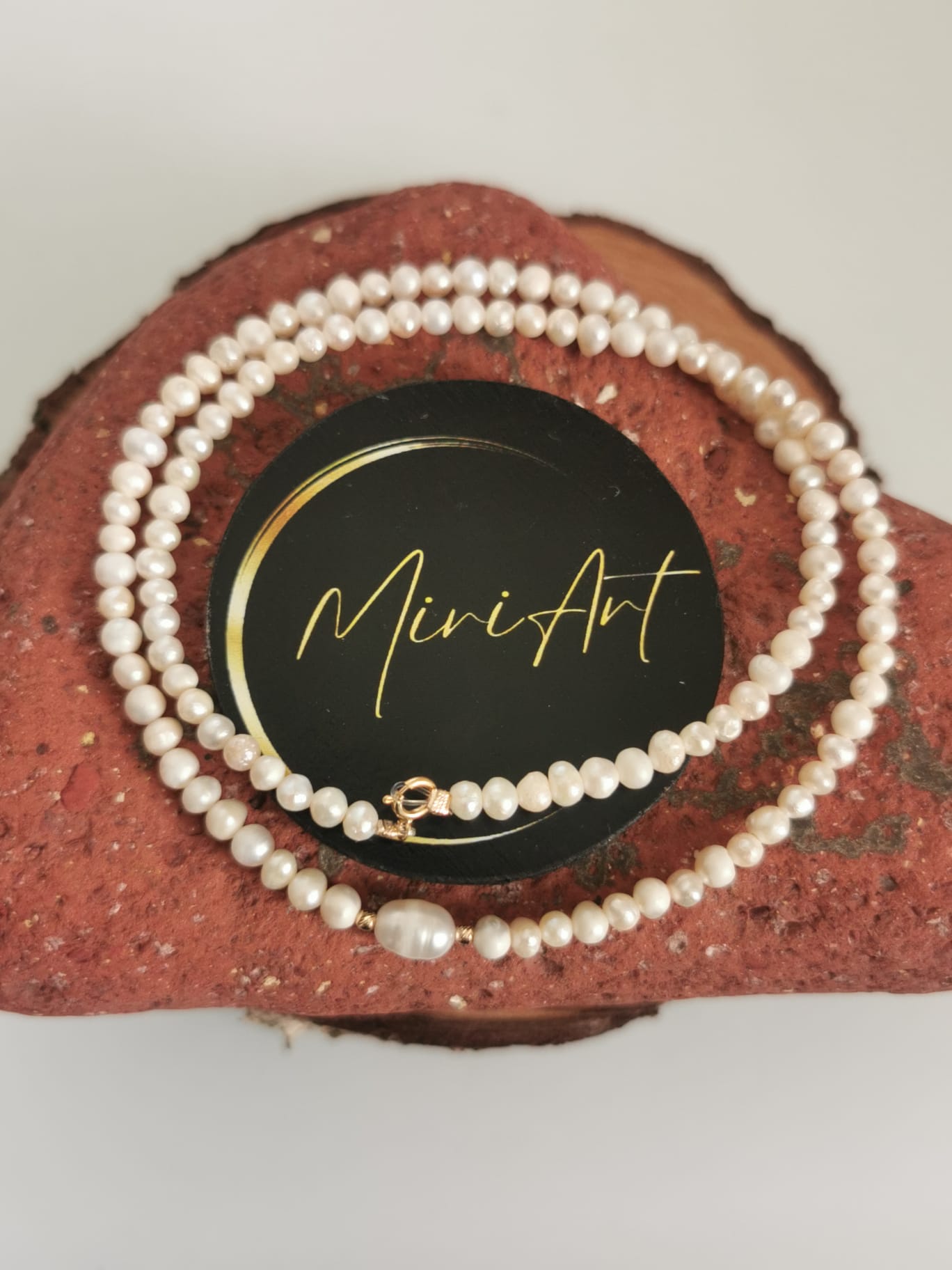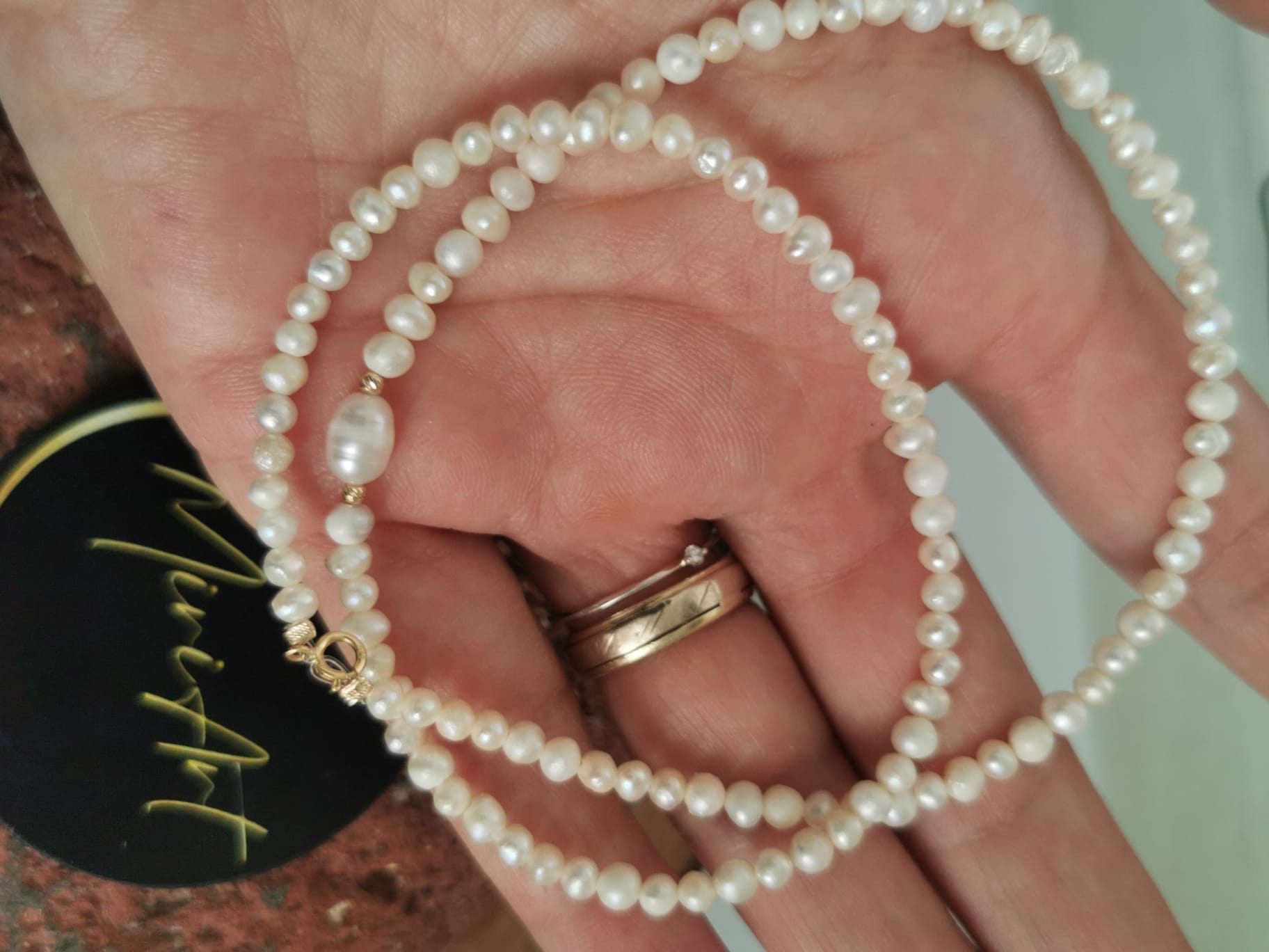 Perlele de cultură 3-4mm / 5-7mm, în nuanțe delicate și dimensiuni variate, aduc un aer clasic și rafinat, în timp ce firul transparent creează impresia unei bijuterii plutitoare, fine și luminoase.