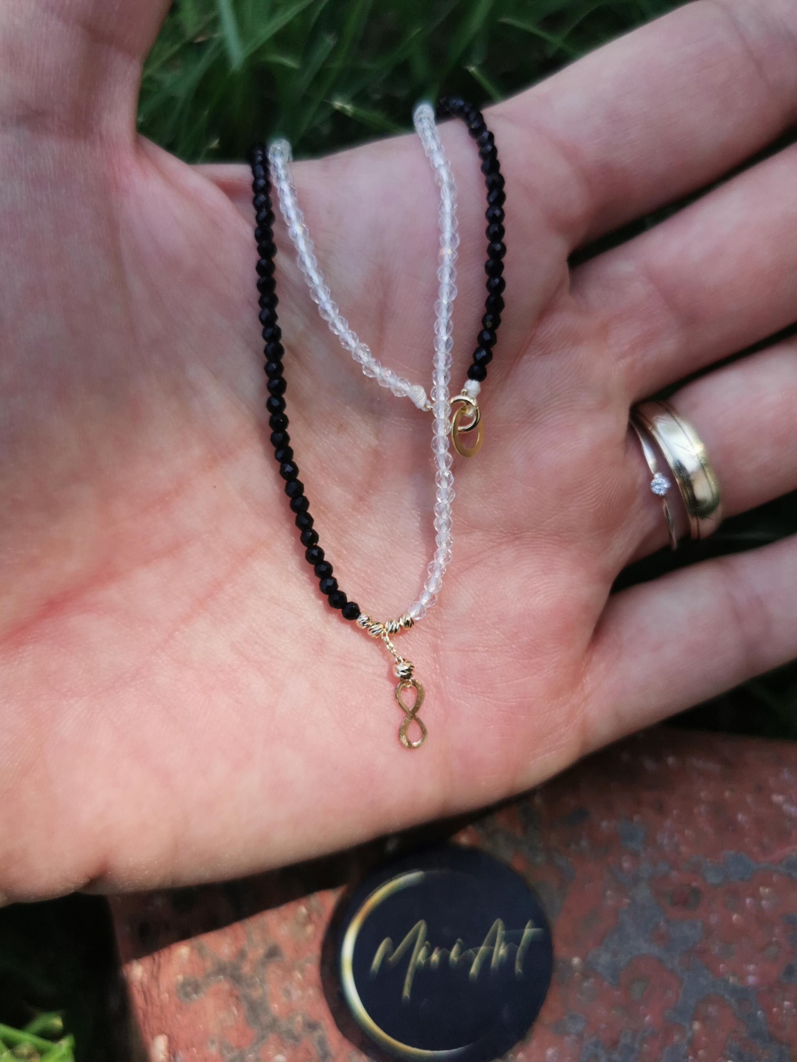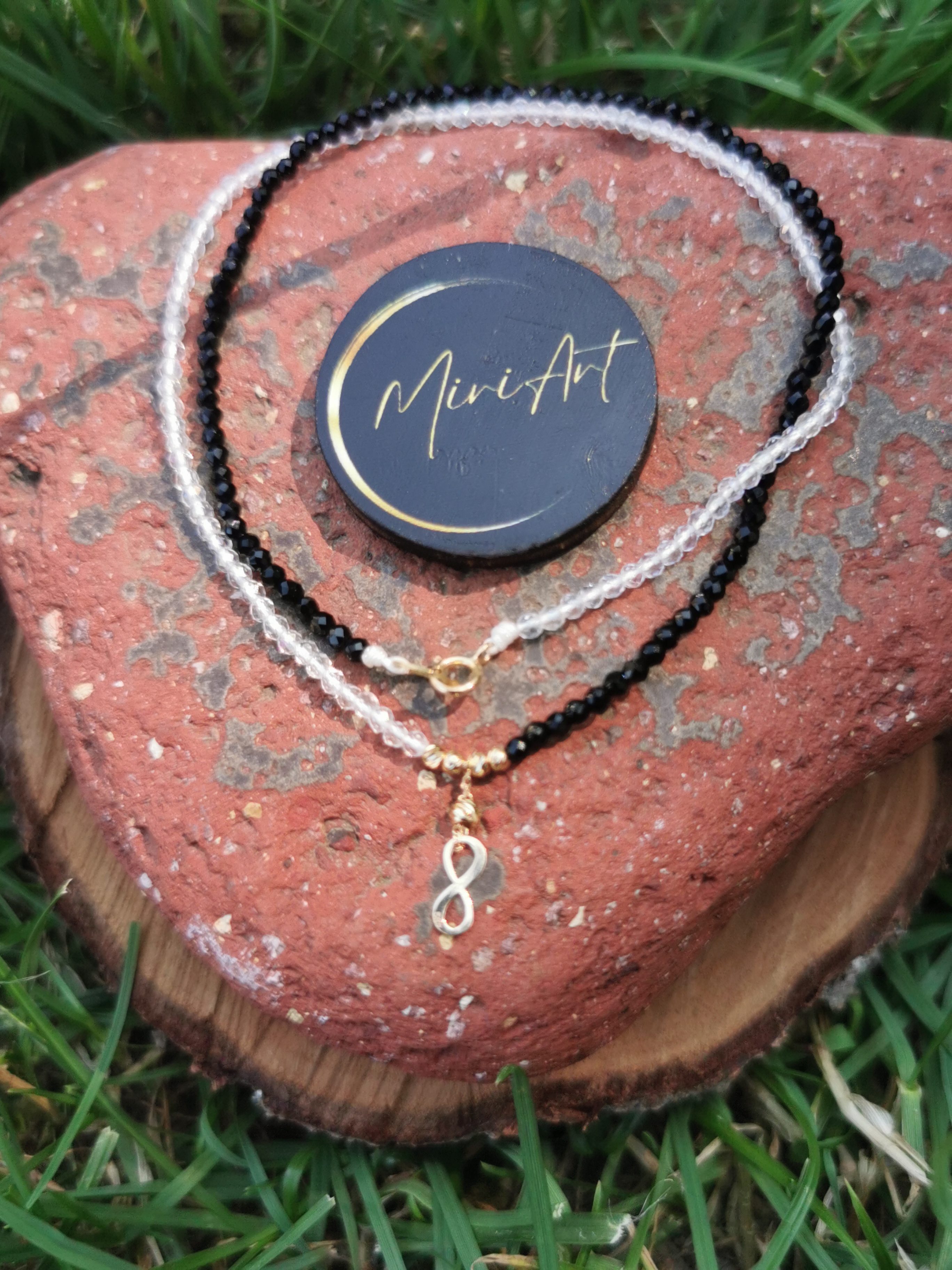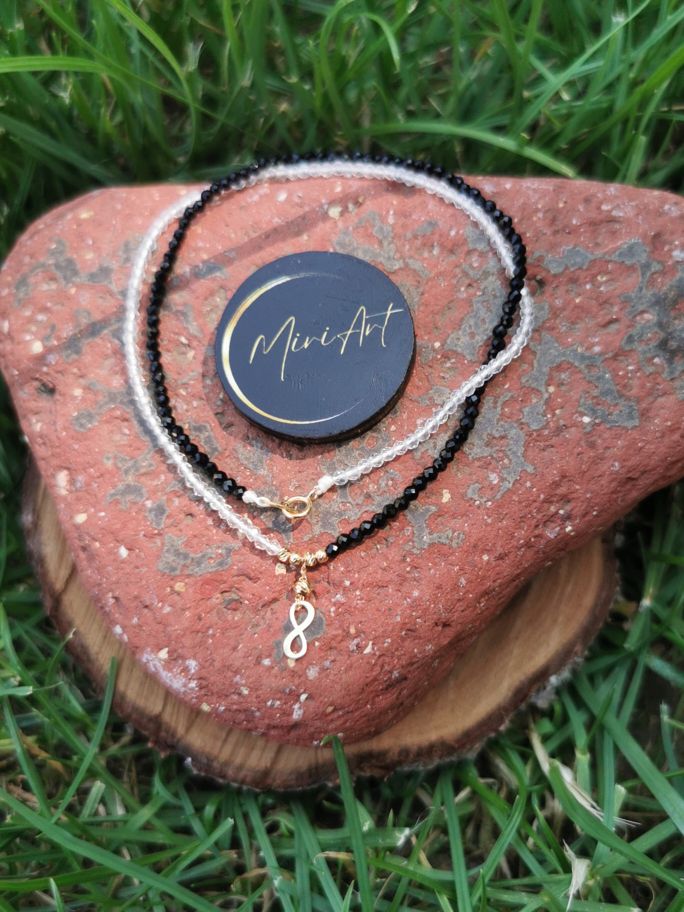 Realizat din Spinel de 2mm – piatra care oferă protecție și claritate – și Cuarț de 2mm , cunoscut pentru puritate și amplificarea energiei pozitive, colierul îmbină eleganța clasică cu armonia naturală.