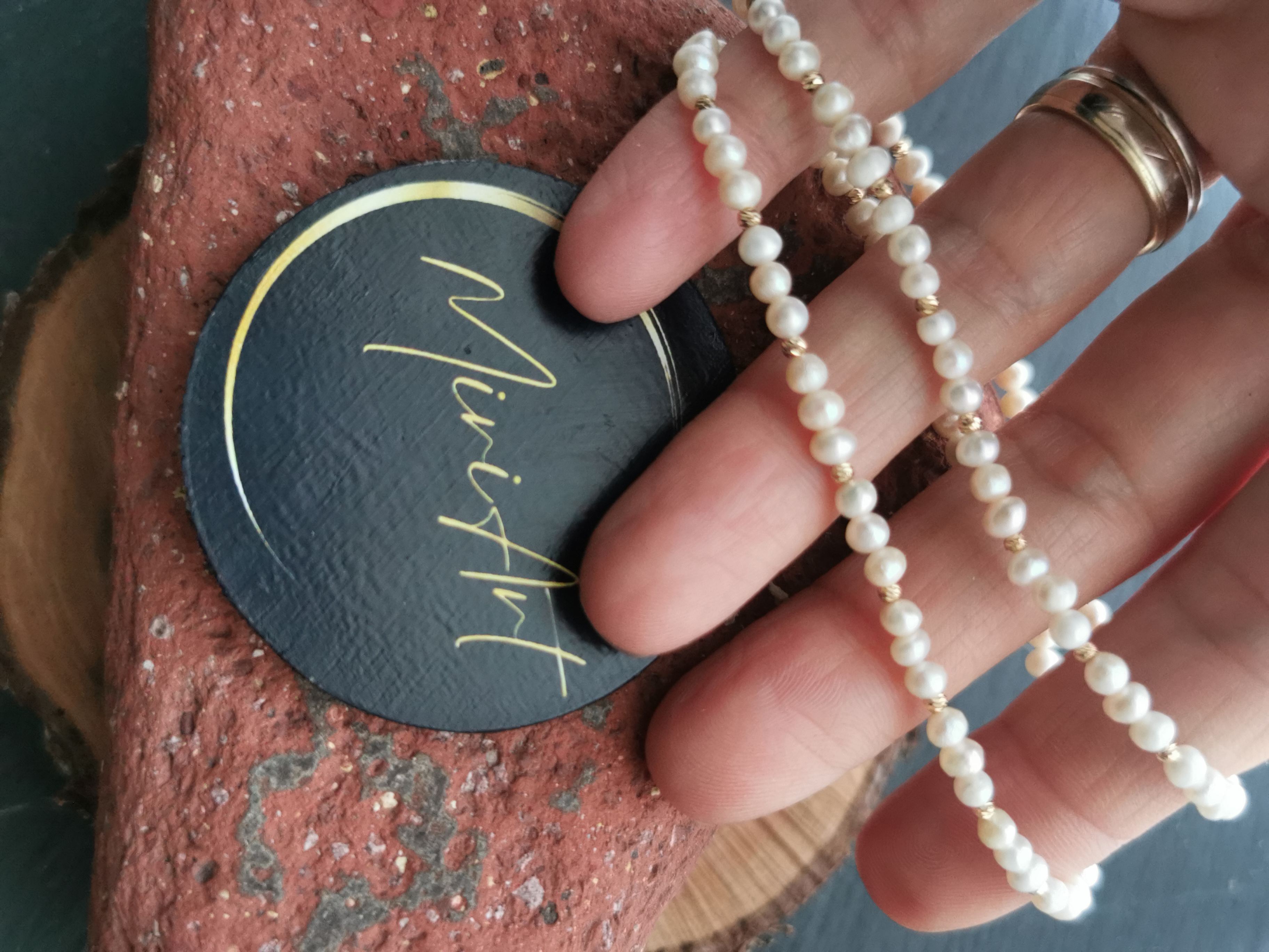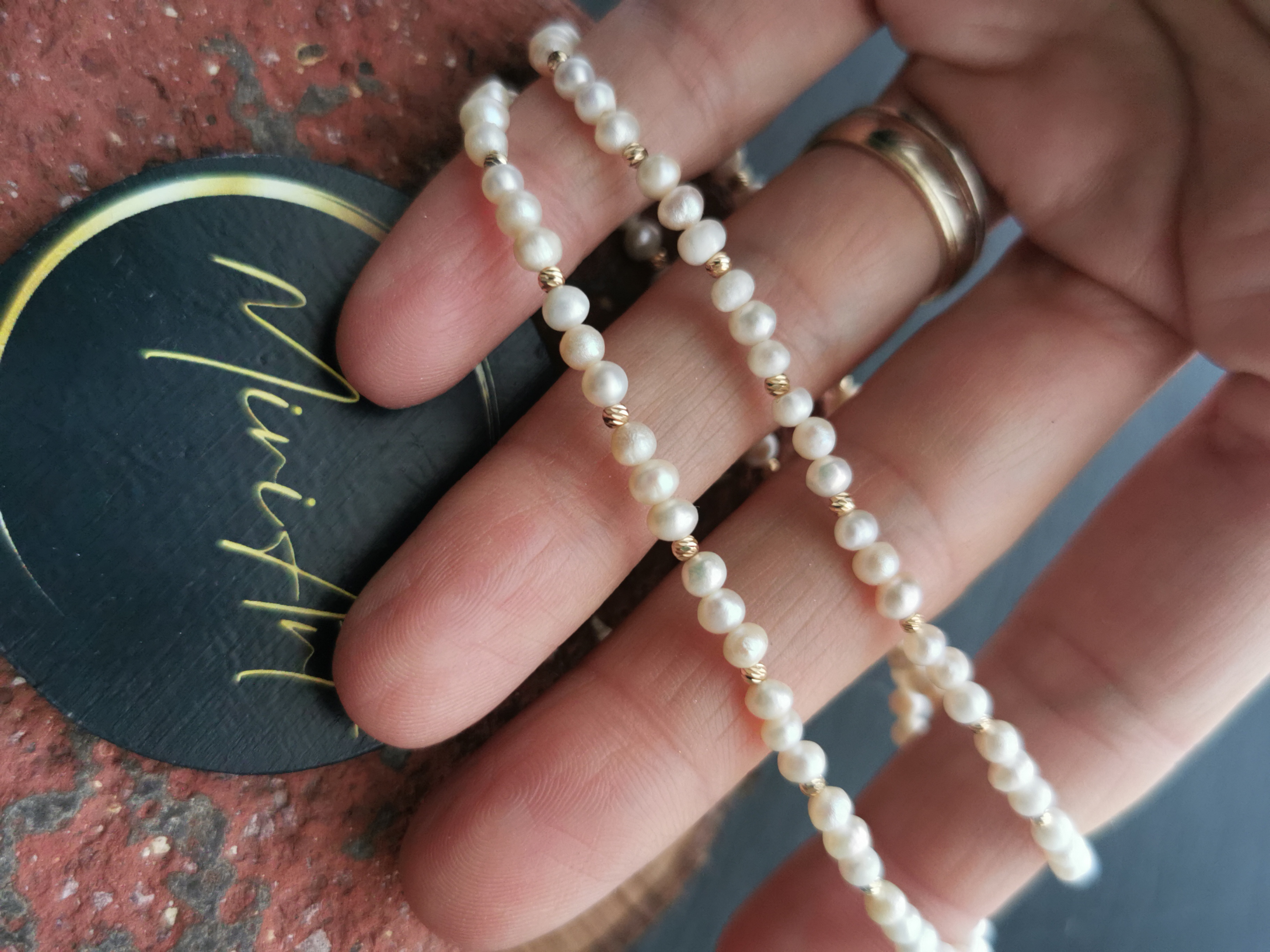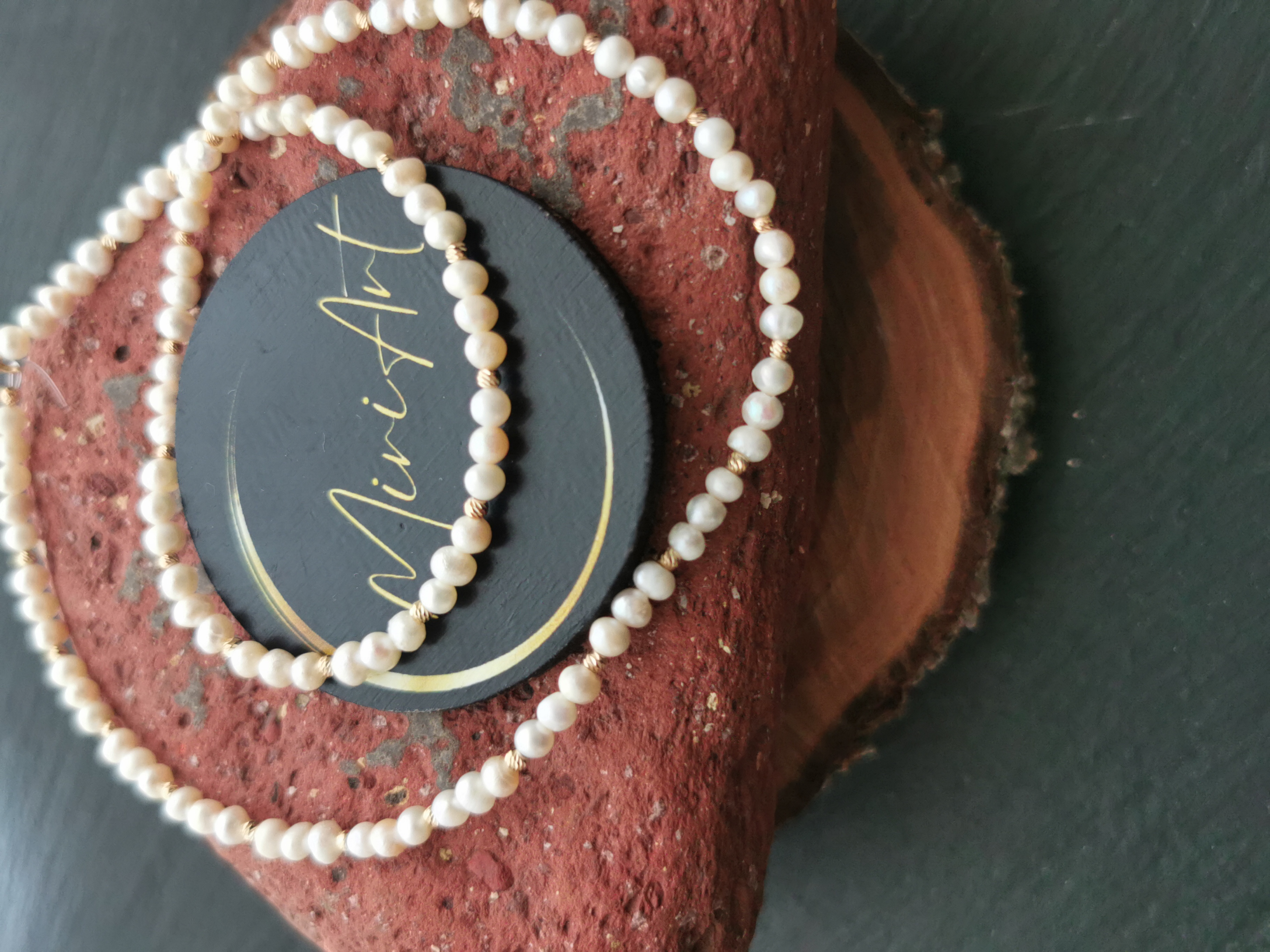 Colier handmade cu 34 sfere de 2mm de aur 14k, pietre semiprețioase și închidere din aur 14k.