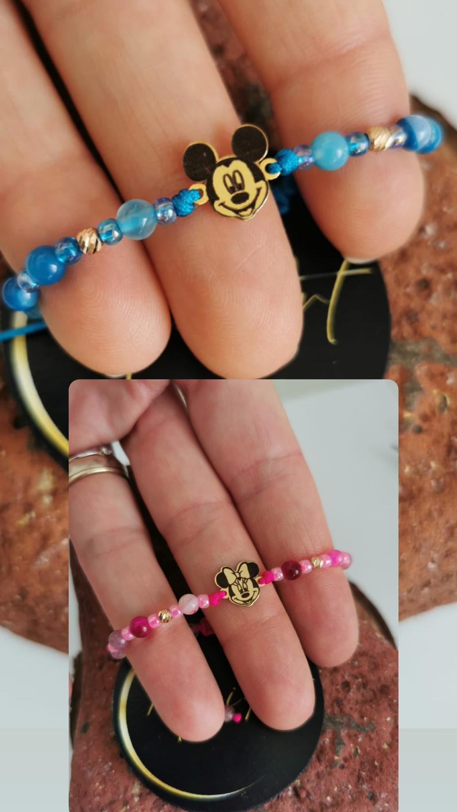 Setul conține două brățări handmade 2 sfere de 3mm aur 14k cu pandantiv Mickey / Minnie aur 14k, pietre semiprețioase, mărgele toho și închidere împletită, reglabilă.