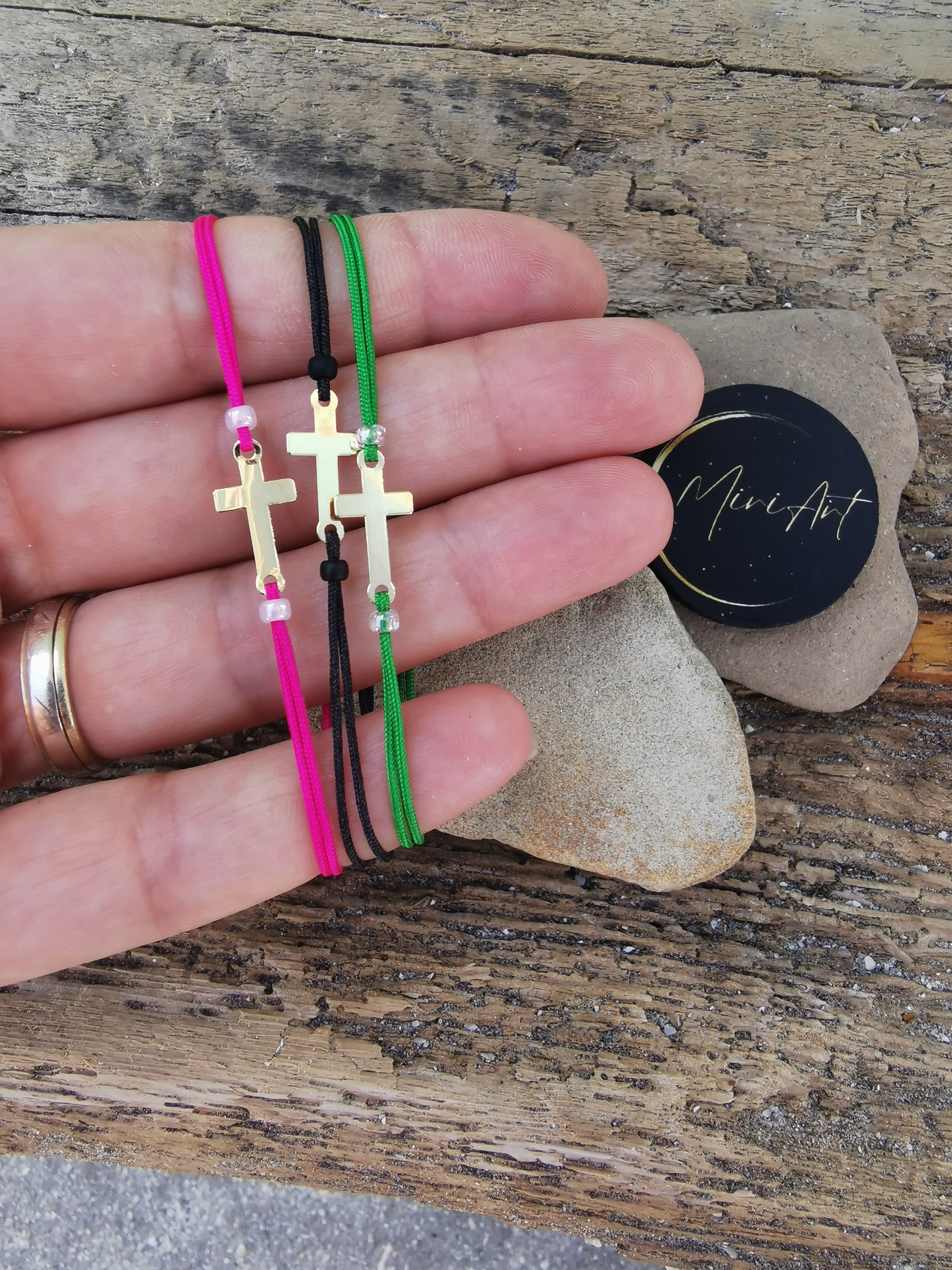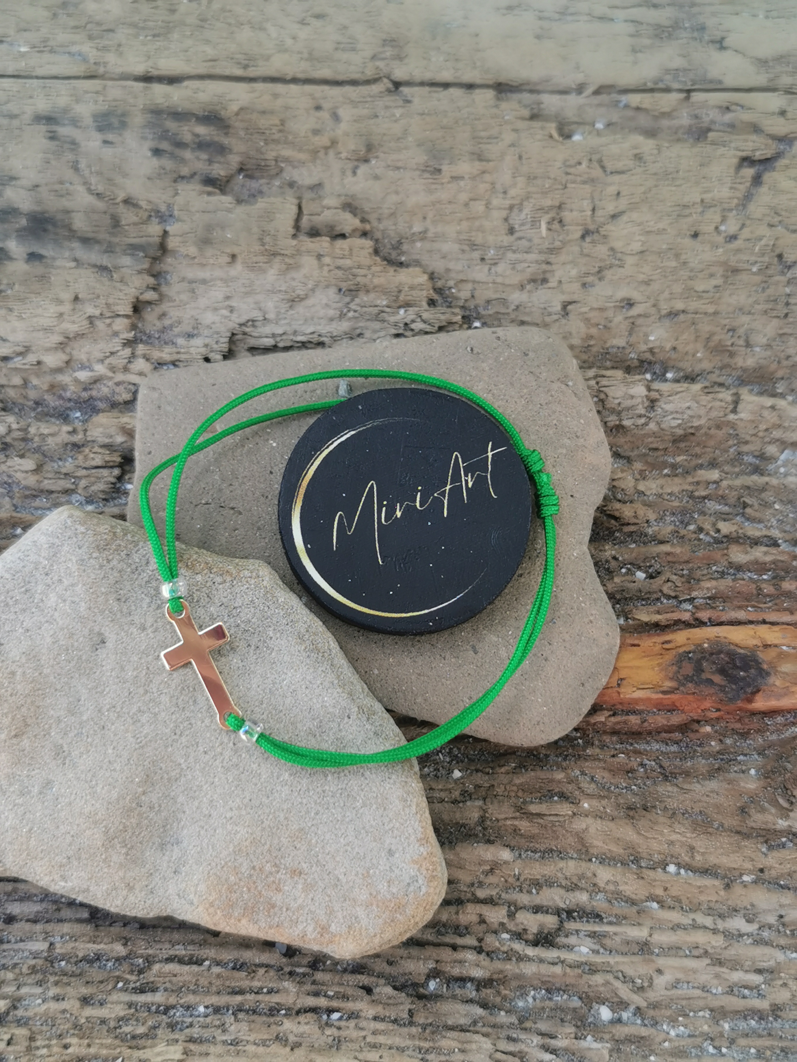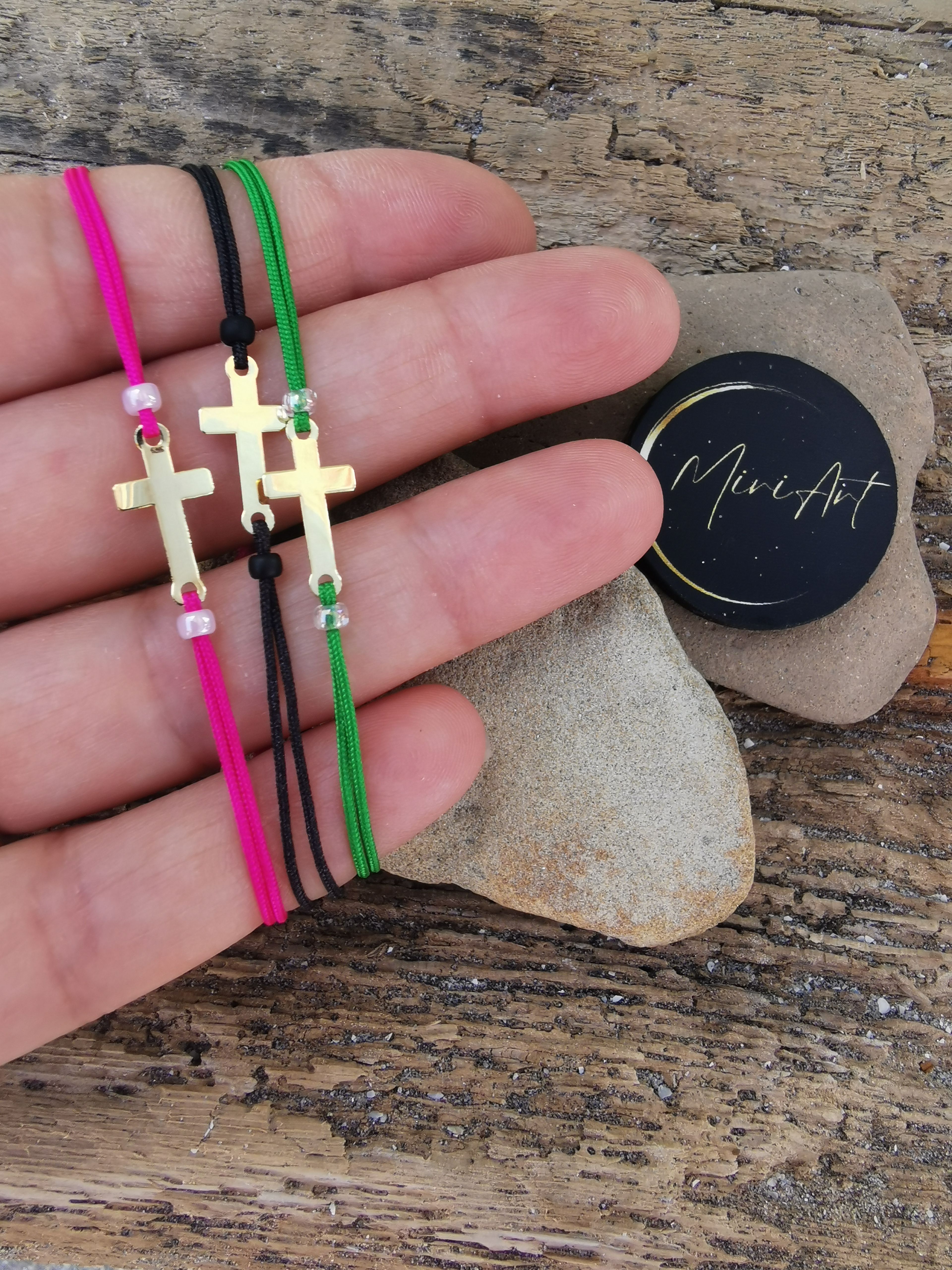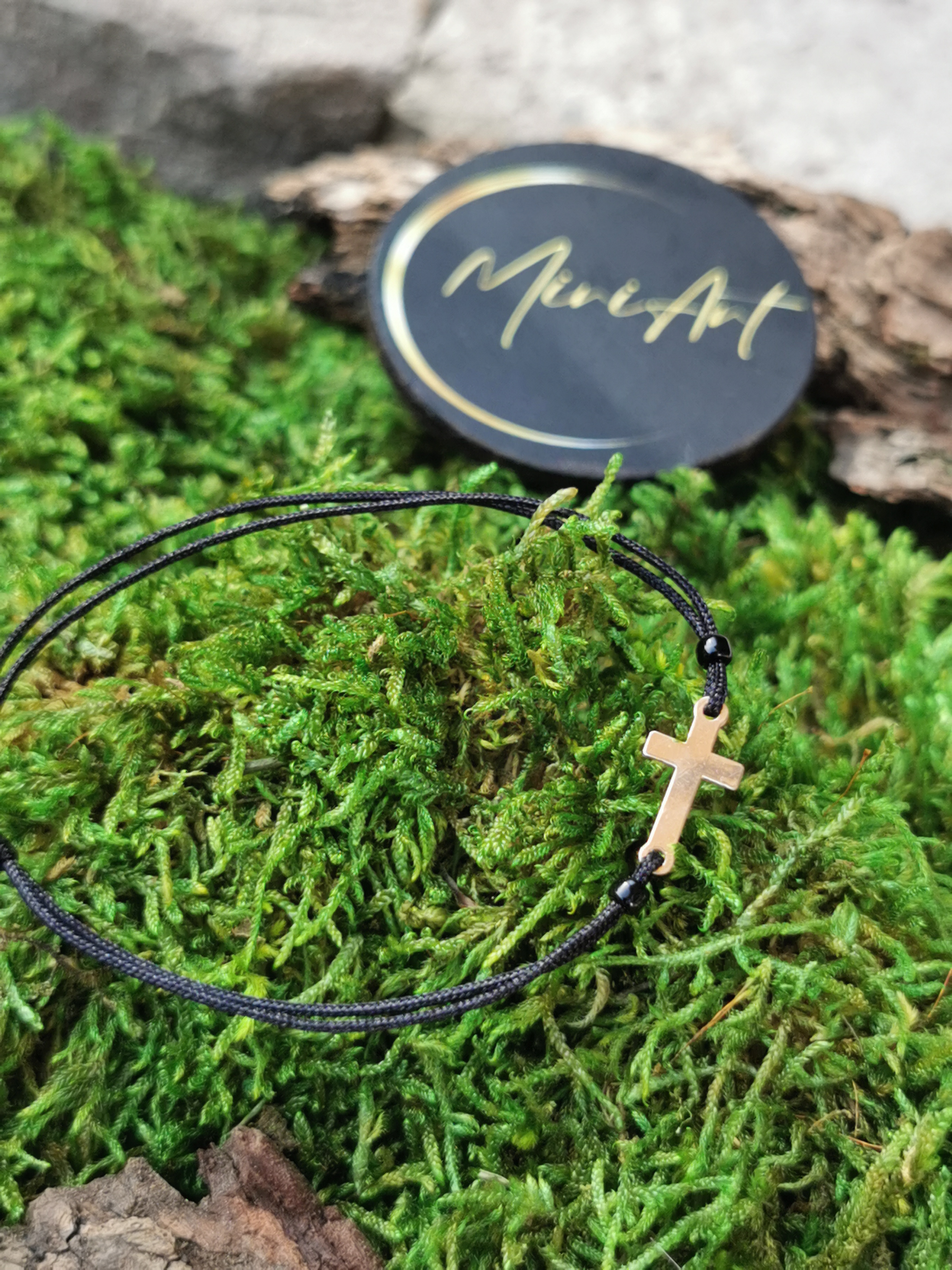 Brățară handmade cu pandantiv cruce din aur 14k, montat pe un șnur rezistent, cu închidere reglabilă cu noduri, ușor de ajustat și se potrivește oricărei încheieturi.