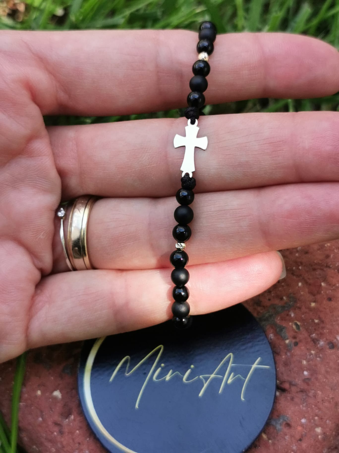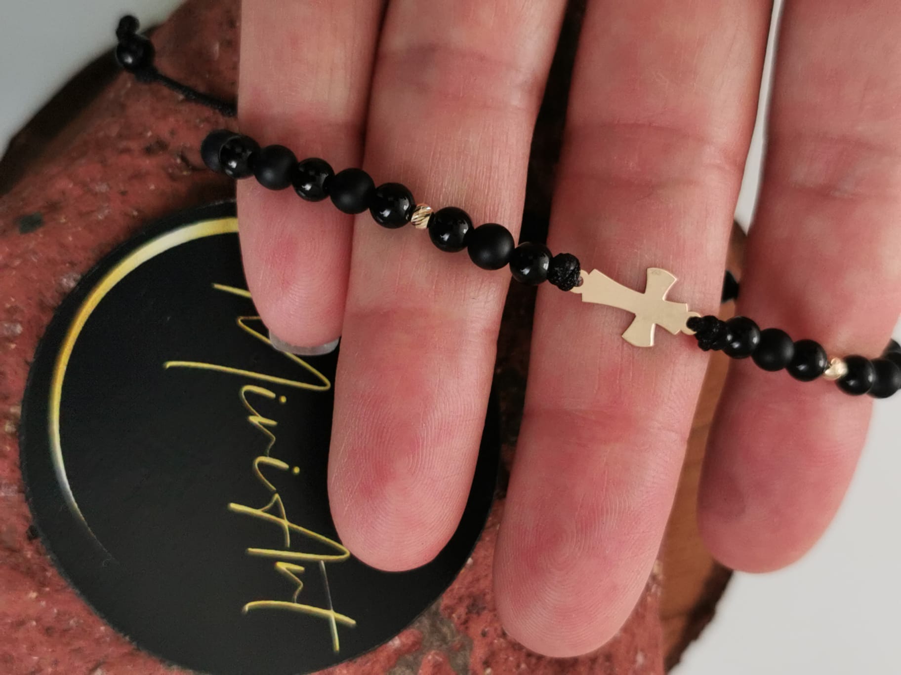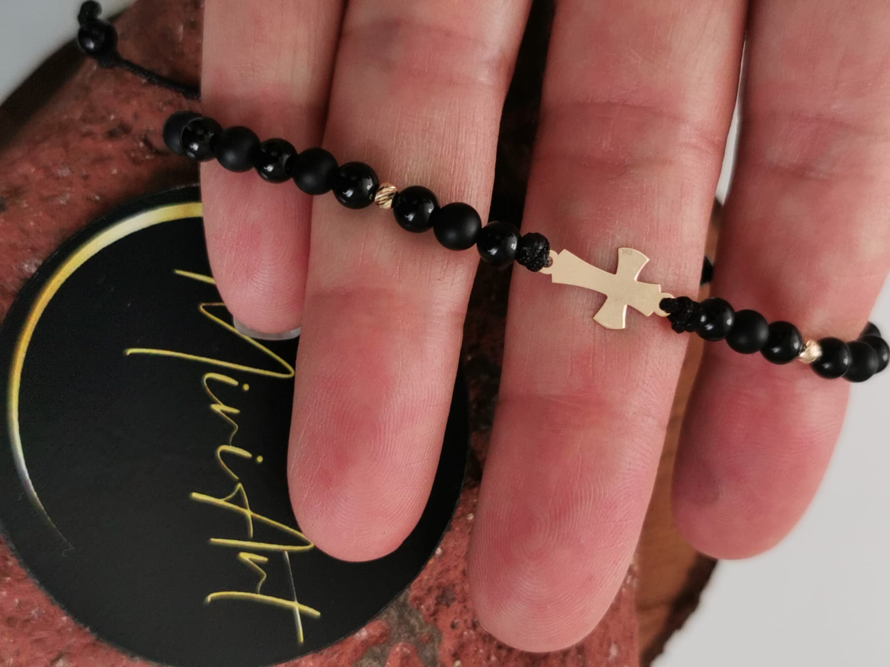 Brățară handmade cu 2 sfere de 2,5mm aur 14k, pandantiv cruce 15mm din aur 14k, pietre semiprețioase, montate pe un șnur rezistent, cu închidere împletită, reglabilă, ușor de ajustat și se potrivește oricărei încheieturi.
