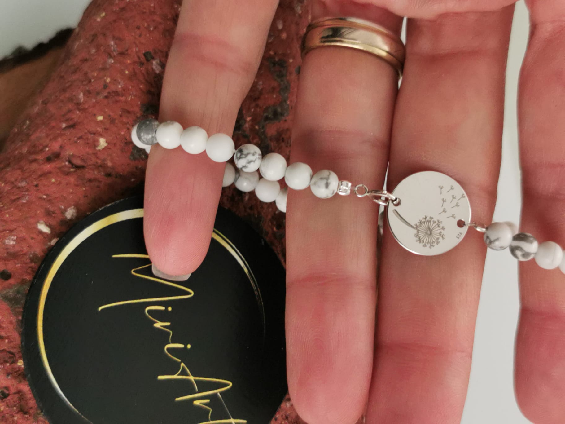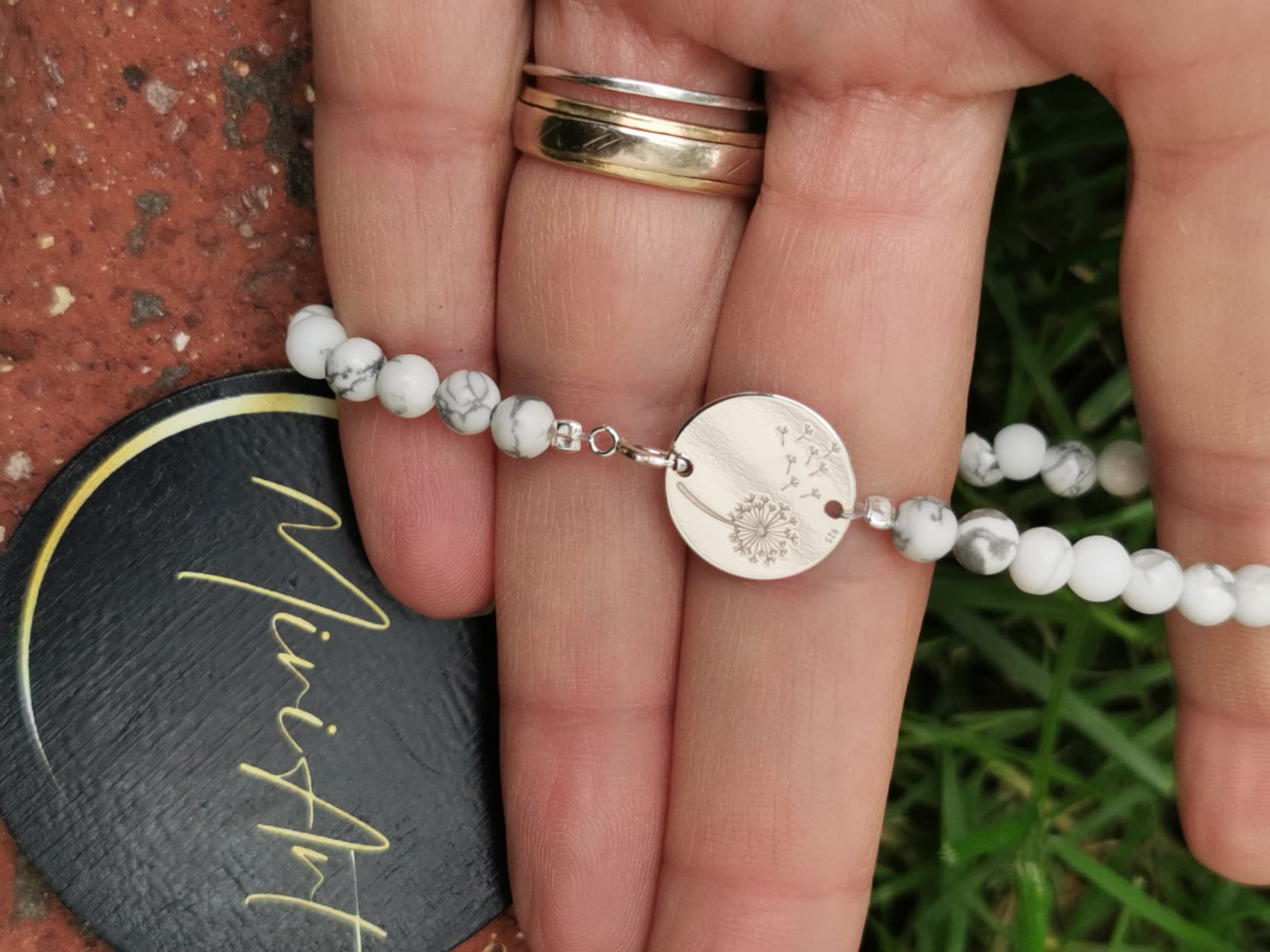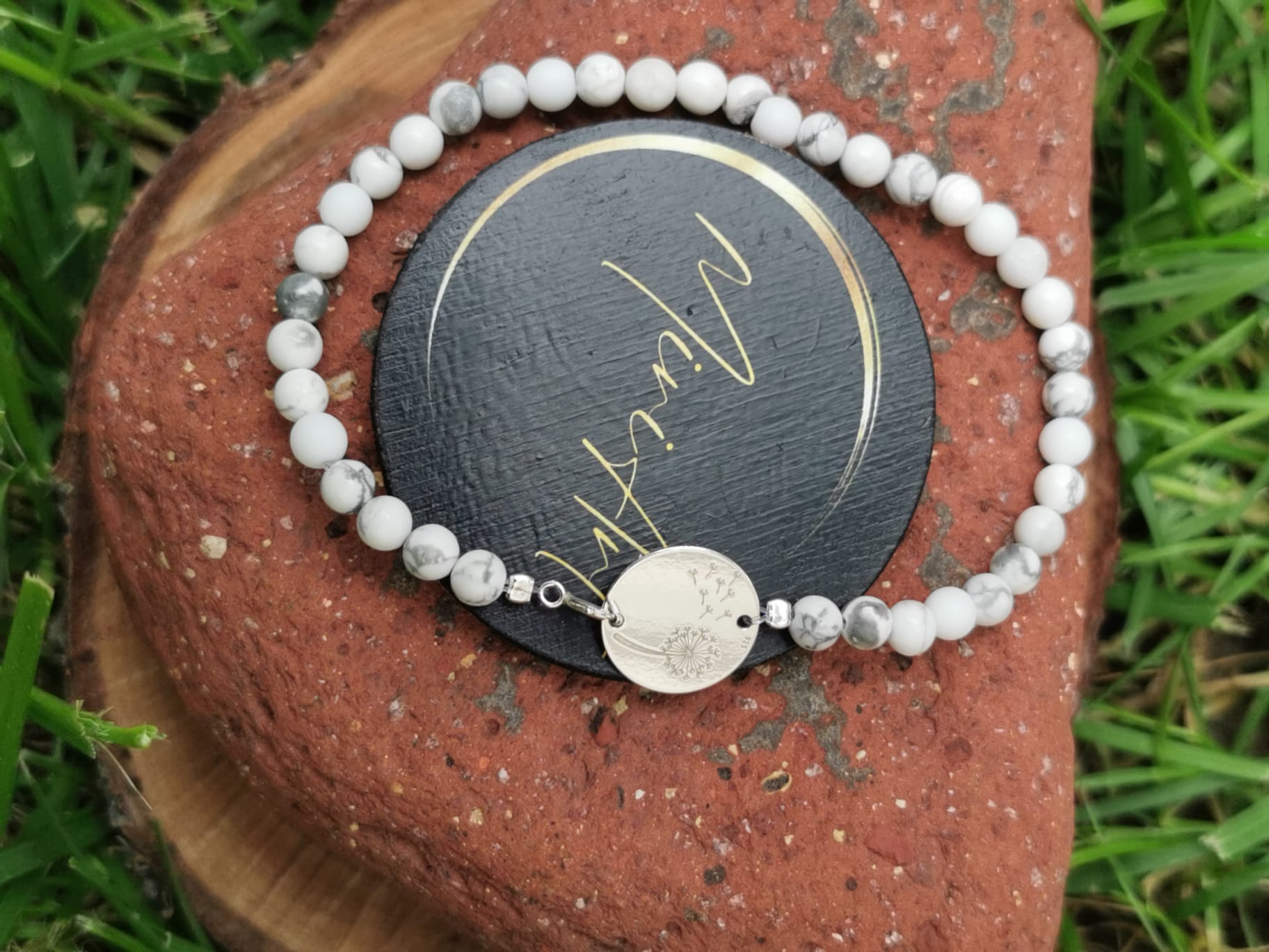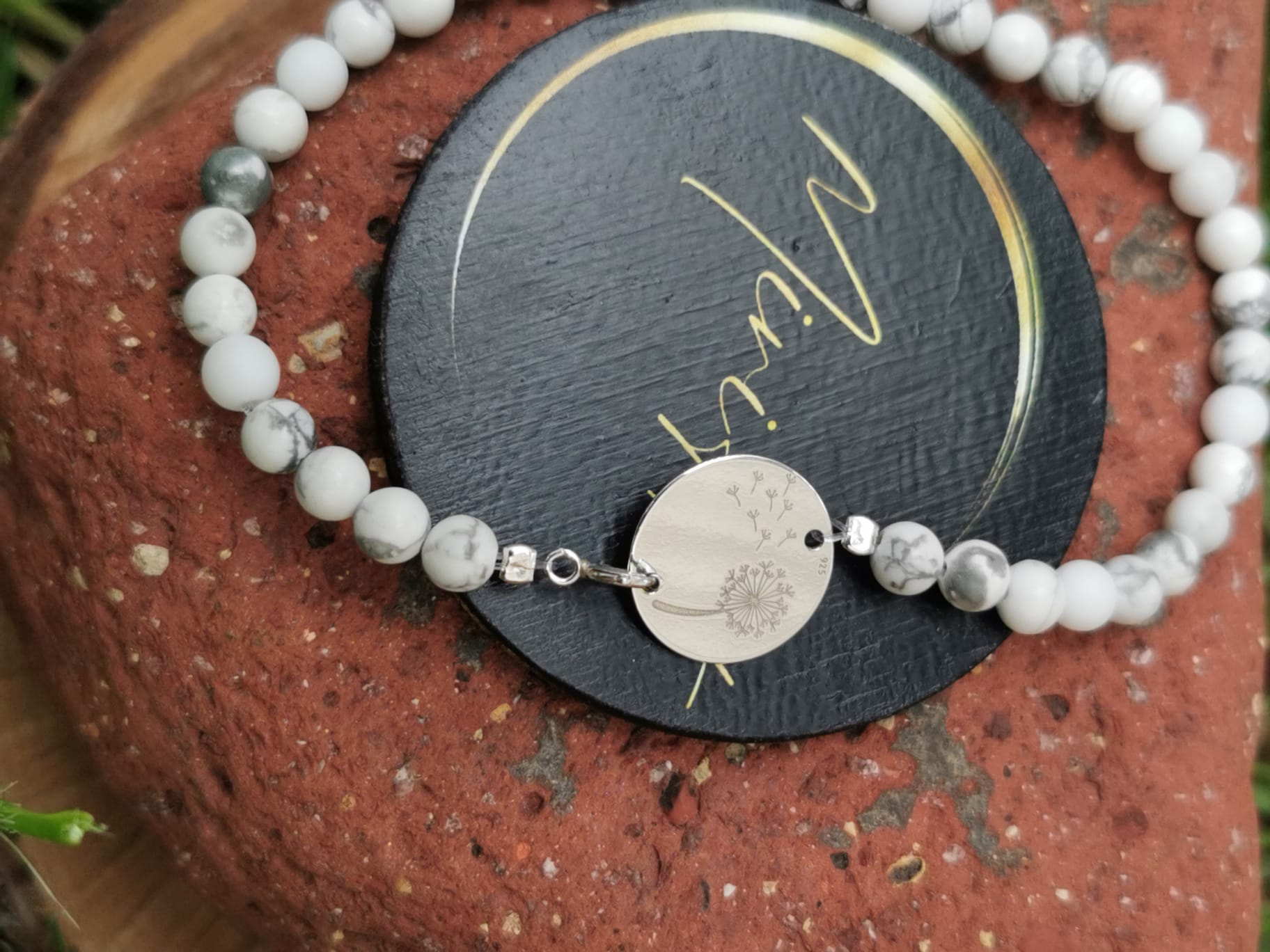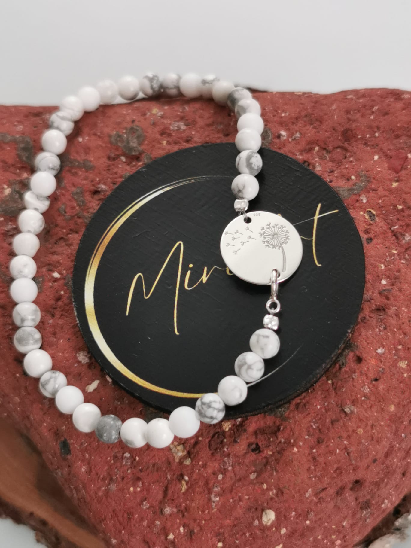 Pietrele semiprețioase de Agat de 4mm și Howlit de 4mm montate pe fir transparent, aduc echilibru, liniște și o energie blândă, iar pandantivul din argint în formă de păpădie adaugă o notă poetică și personală. Închiderea din argint completează bijuteria cu un accent de eleganță discretă.