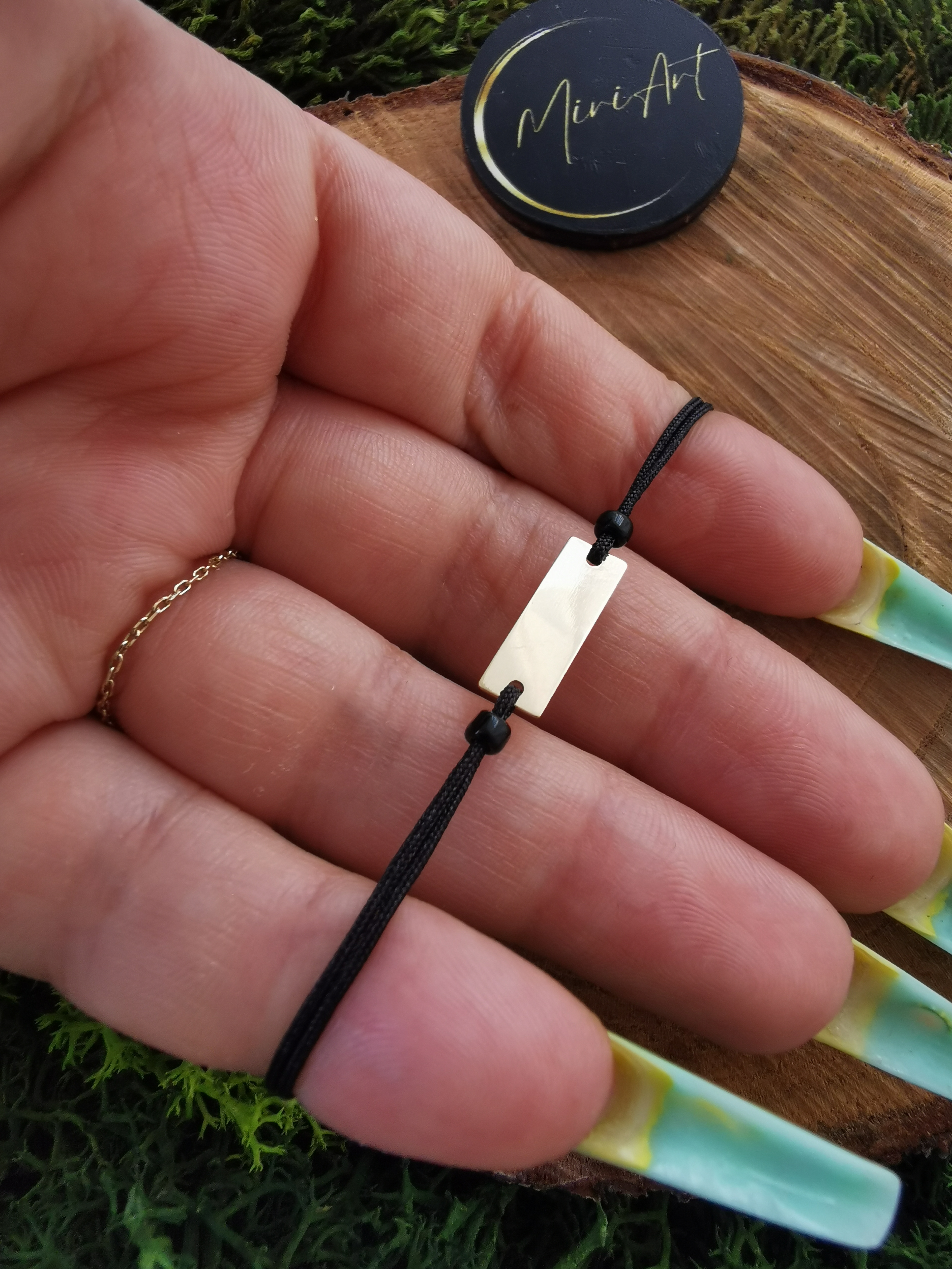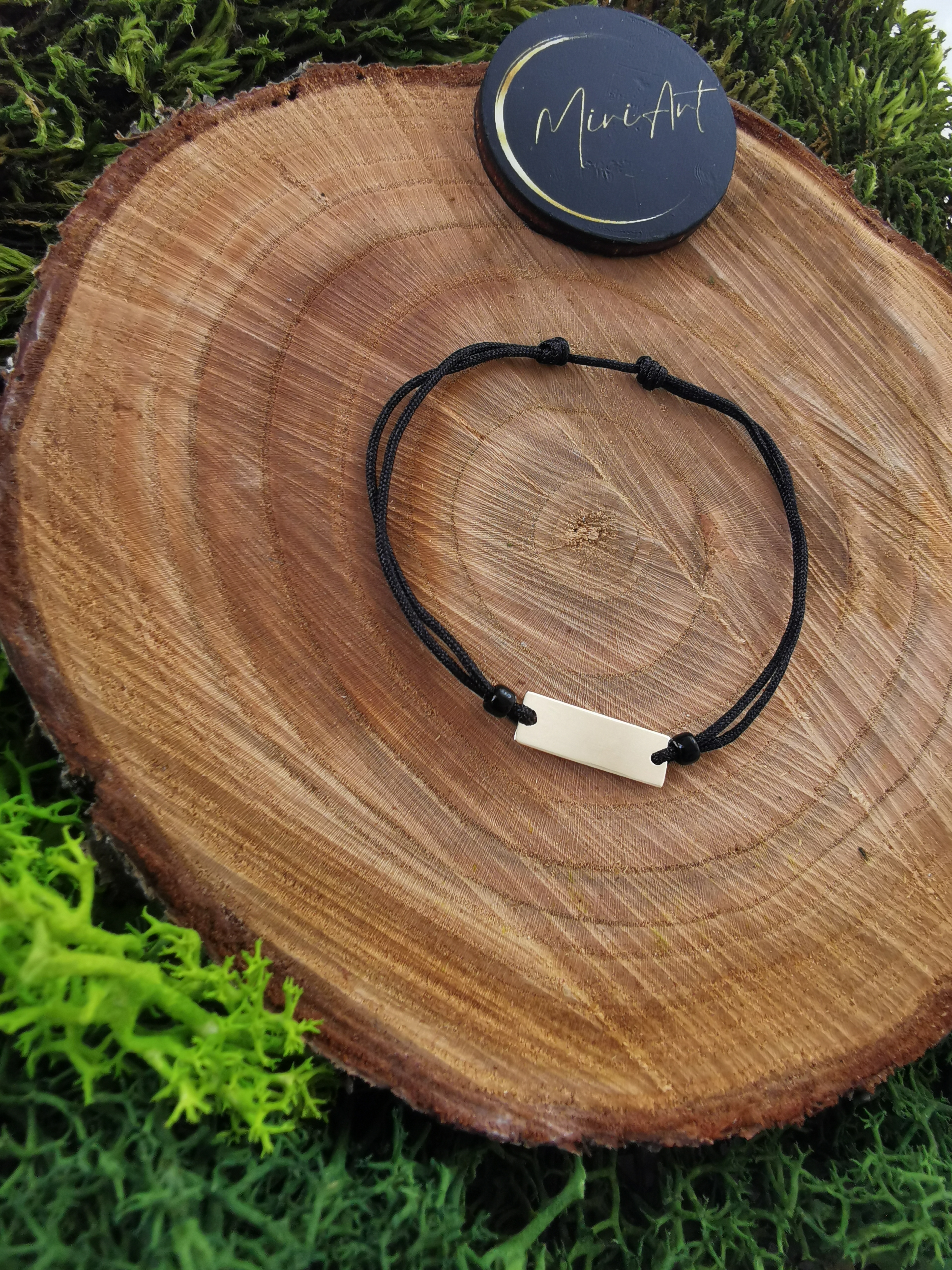 Brățară handmade cu pandantiv plăcuță 15mm din aur 14k, montat pe un șnur rezistent, cu închidere reglabilă cu noduri, ușor de ajustat și se potrivește oricărei încheieturi.