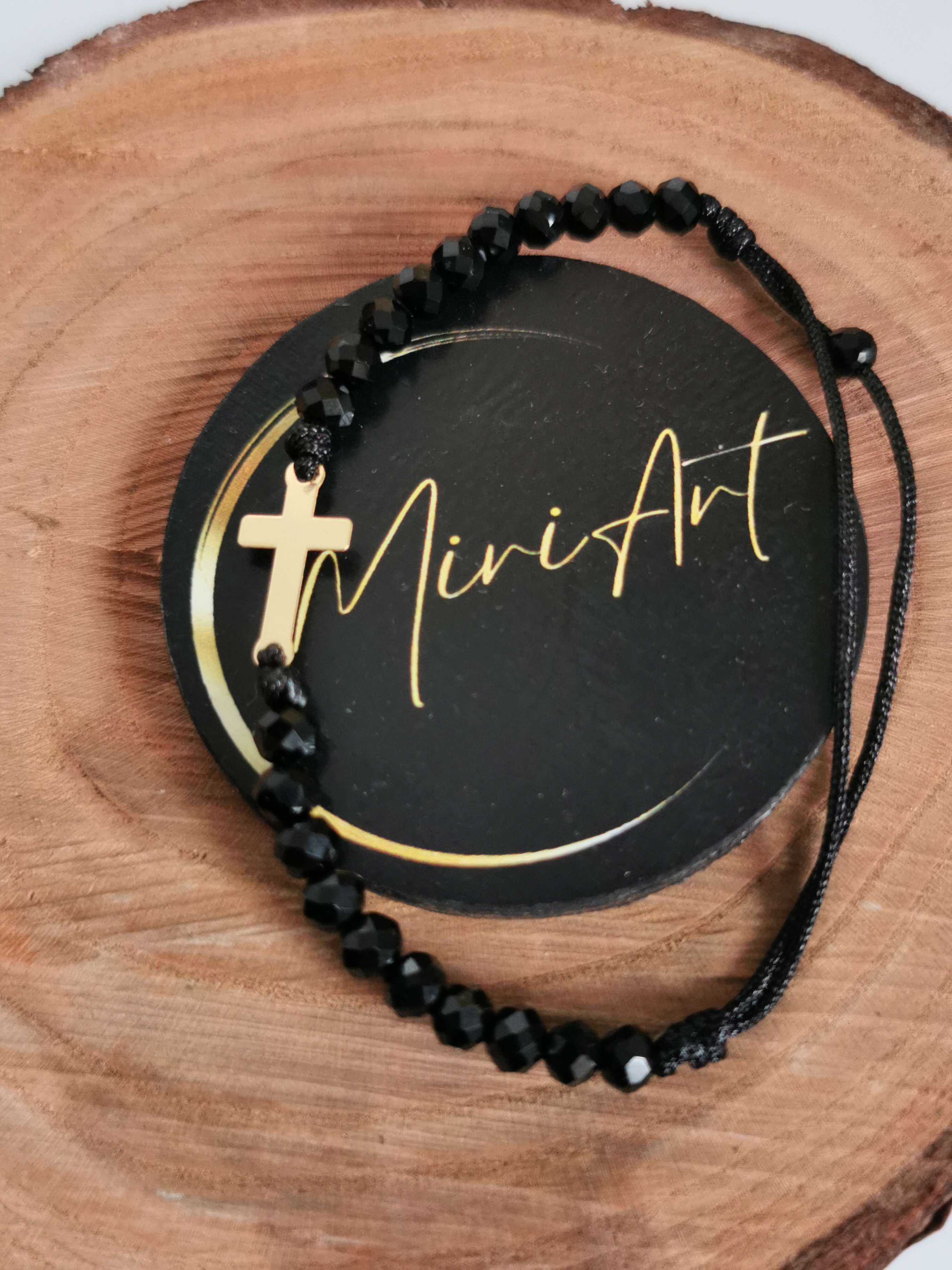 Brățară handmade cu pandantiv cruce din aur 14k, cristale de sticlă și închidere reglabilă cu noduri, ușor de ajustat și se potrivește oricărei încheieturi.