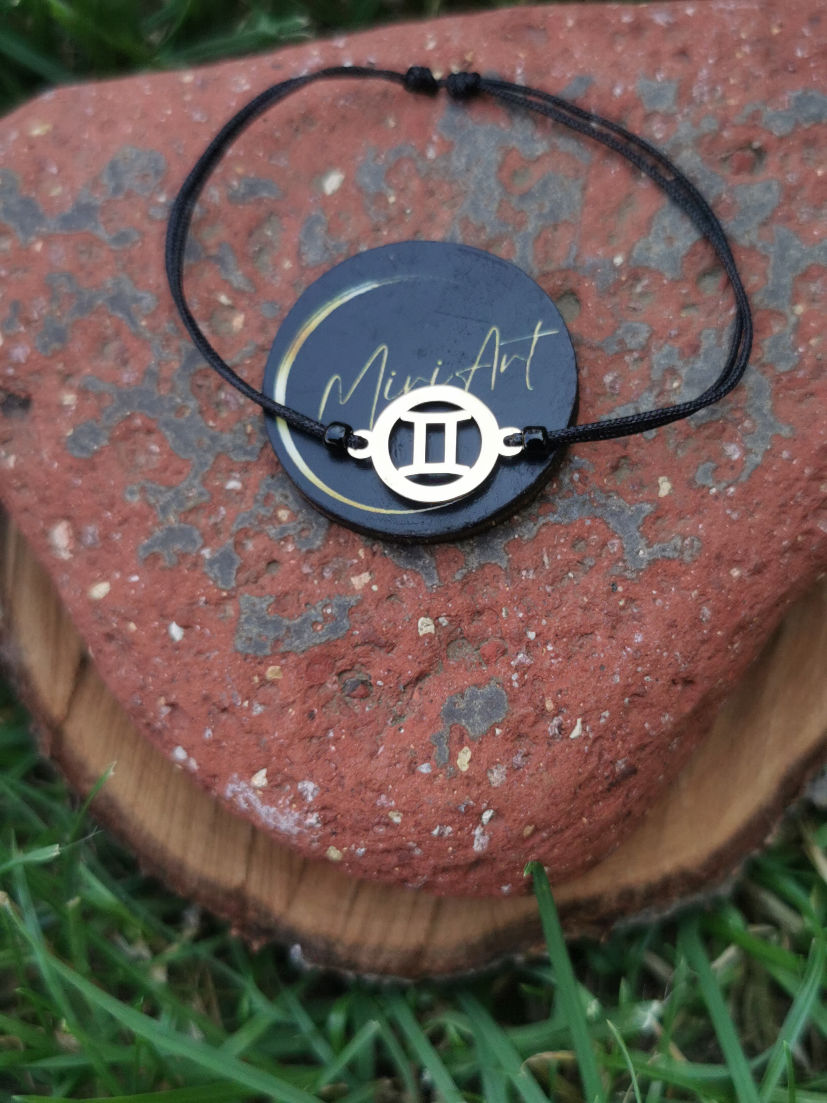Brățară handmade cu pandantiv zodia Gemeni din aur 14k, cu diametru 12mm, montat pe un șnur rezistent, cu închidere reglabilă cu noduri, ușor de ajustat și se potrivește oricărei încheieturi.