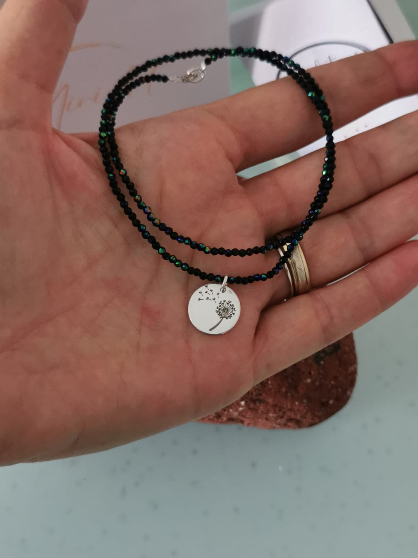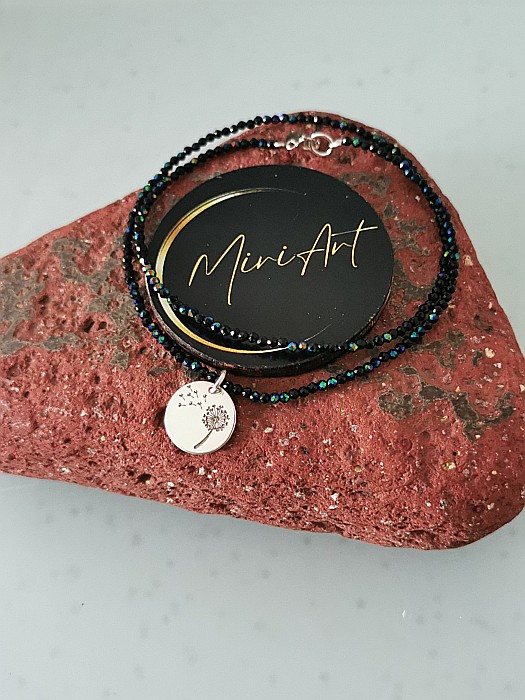 Colierul Dorință de Păpădie montat pe fir transparent, colierul aduce în prim-plan un pandantiv gravat cu o păpădie – simbol al viselor, al speranței și al libertății.