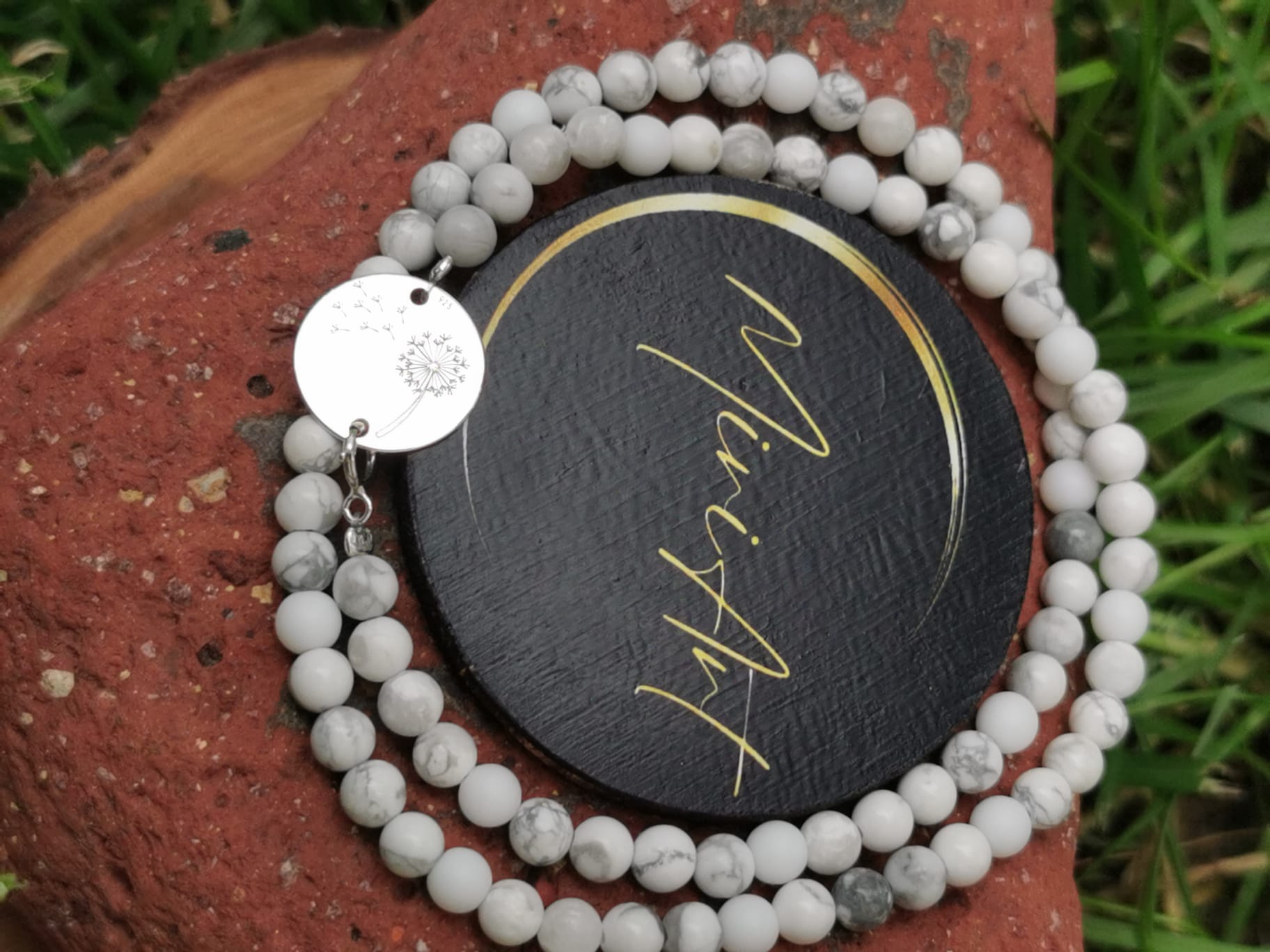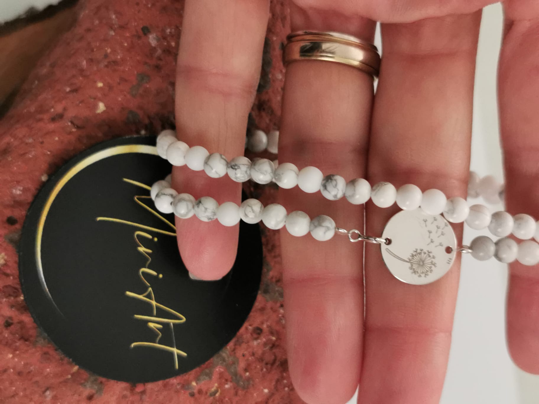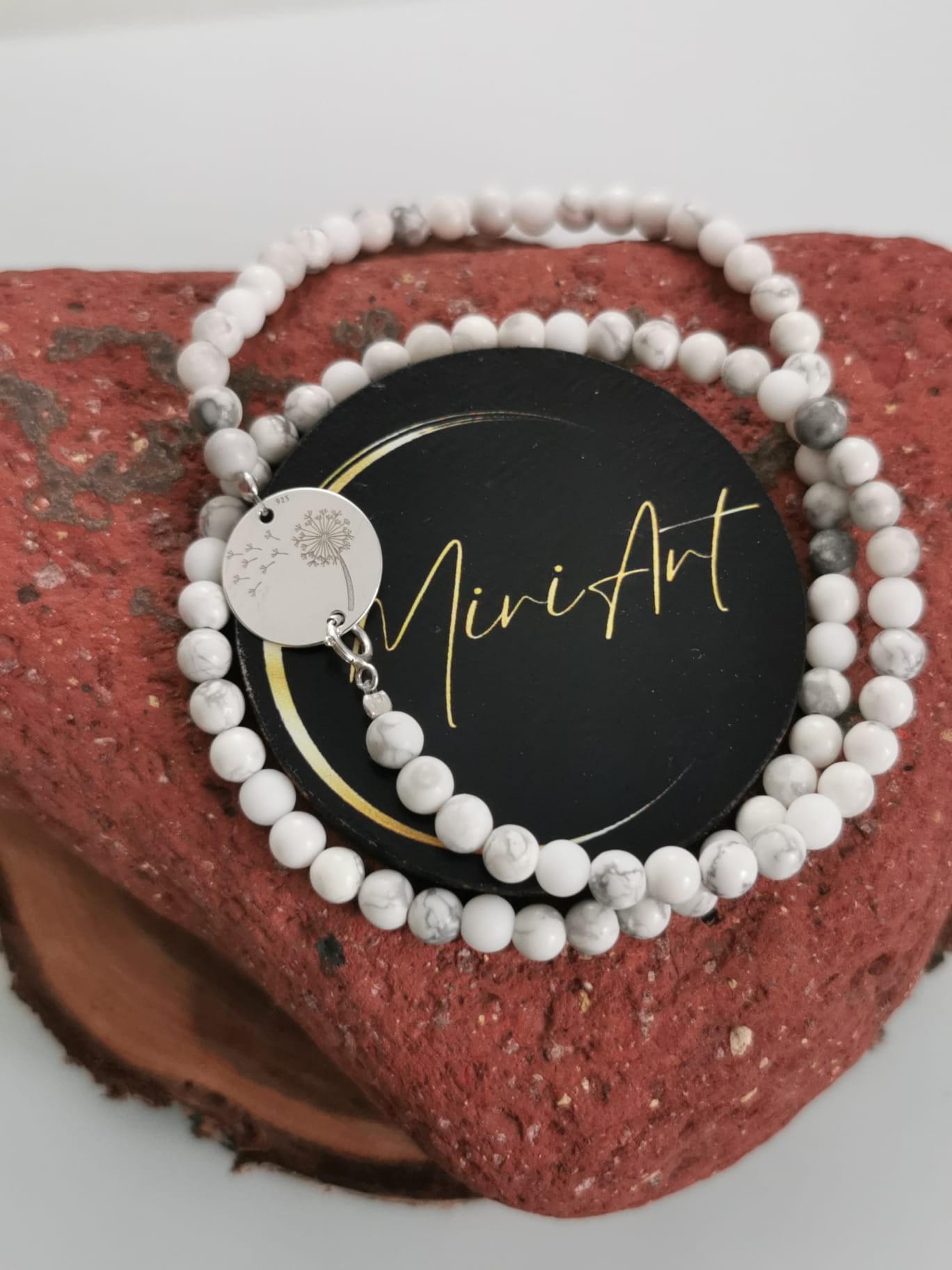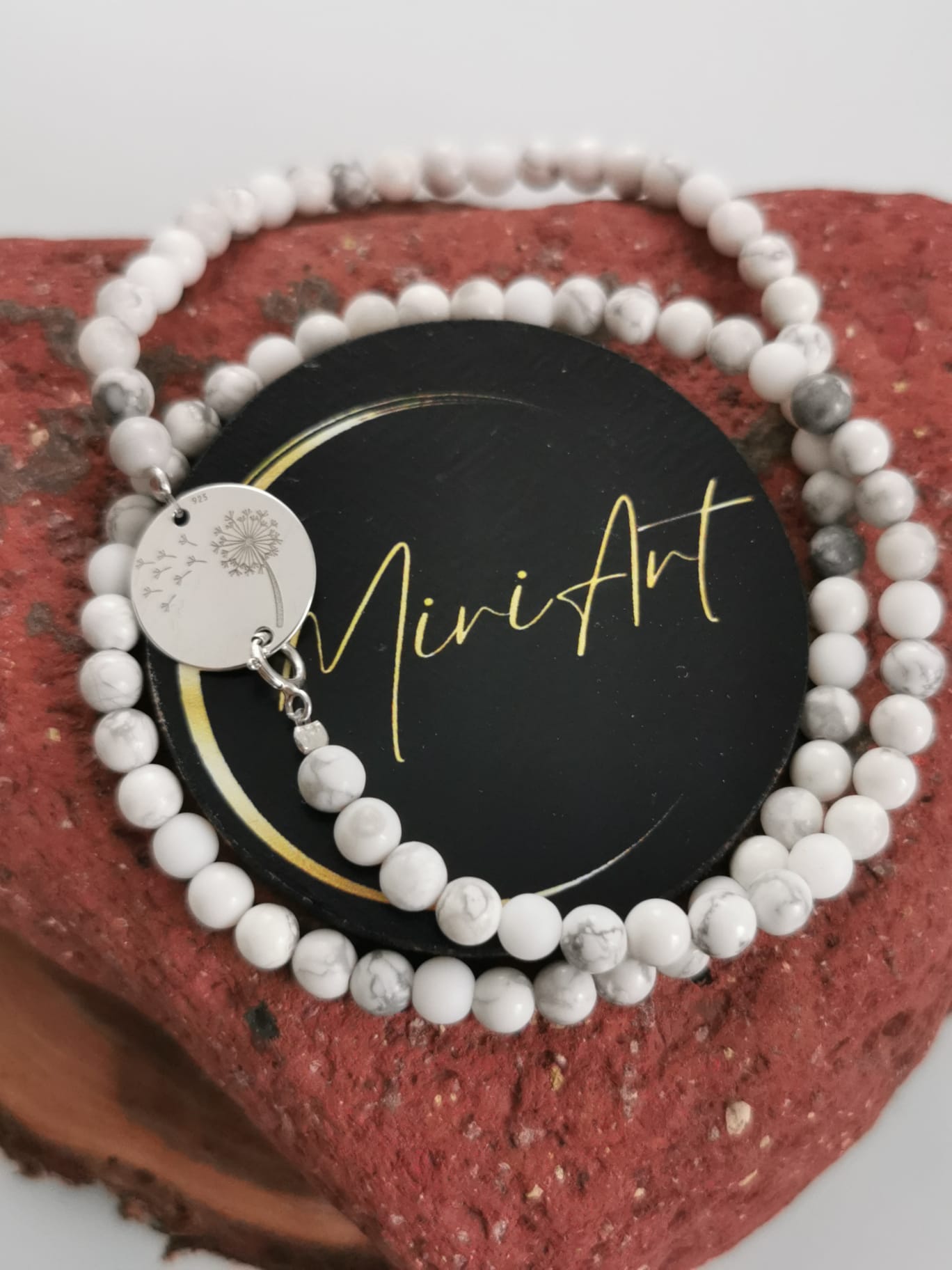 Pietrele semiprețioase de Agat de 4mm și Howlit de 4mm, alese pentru energia lor calmă și echilibrată, completează designul cu o notă naturală și subtilă.
