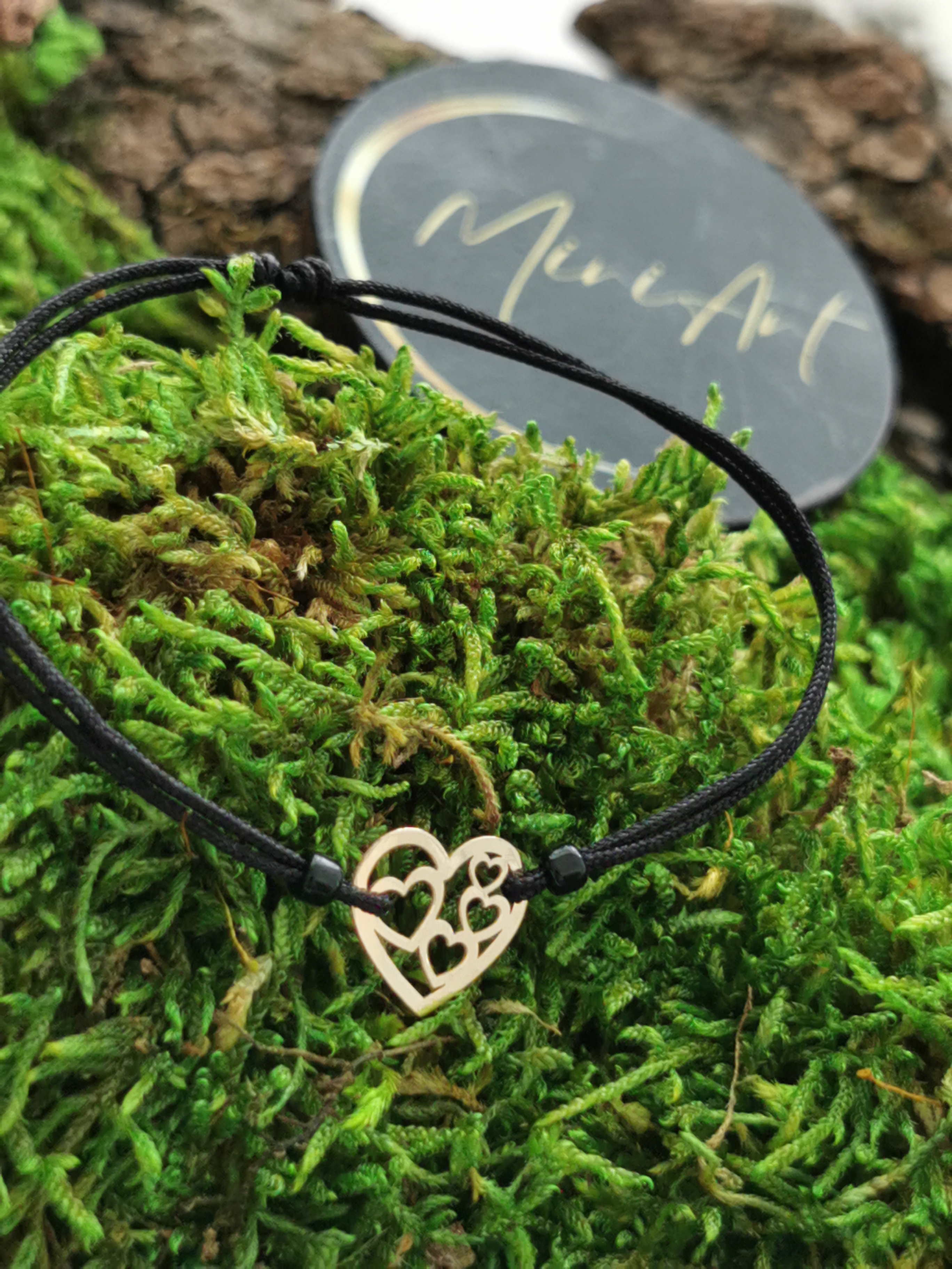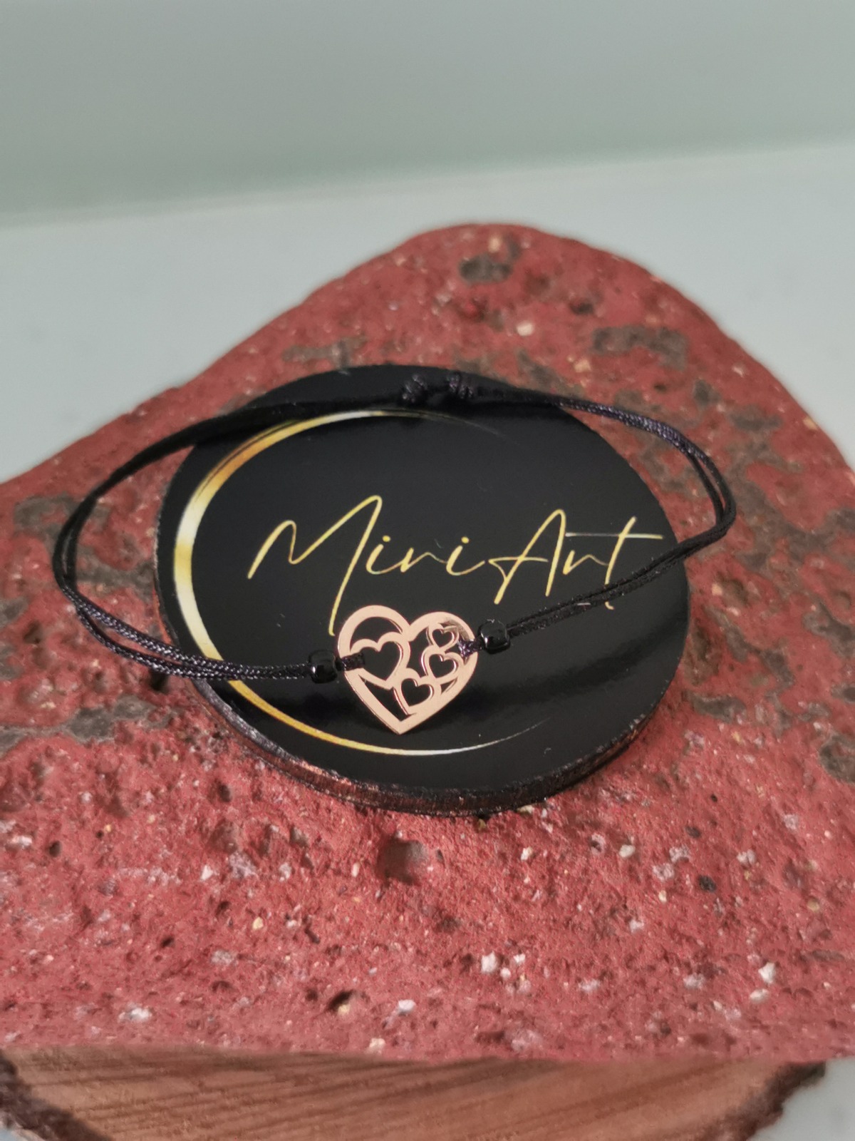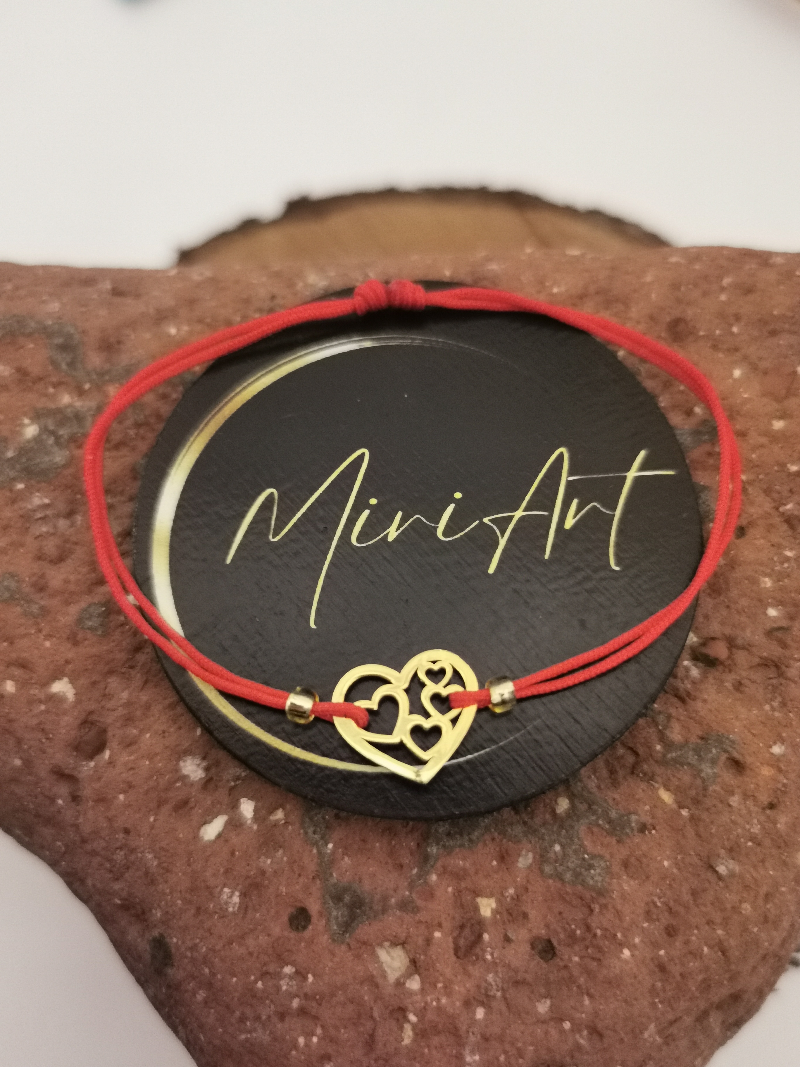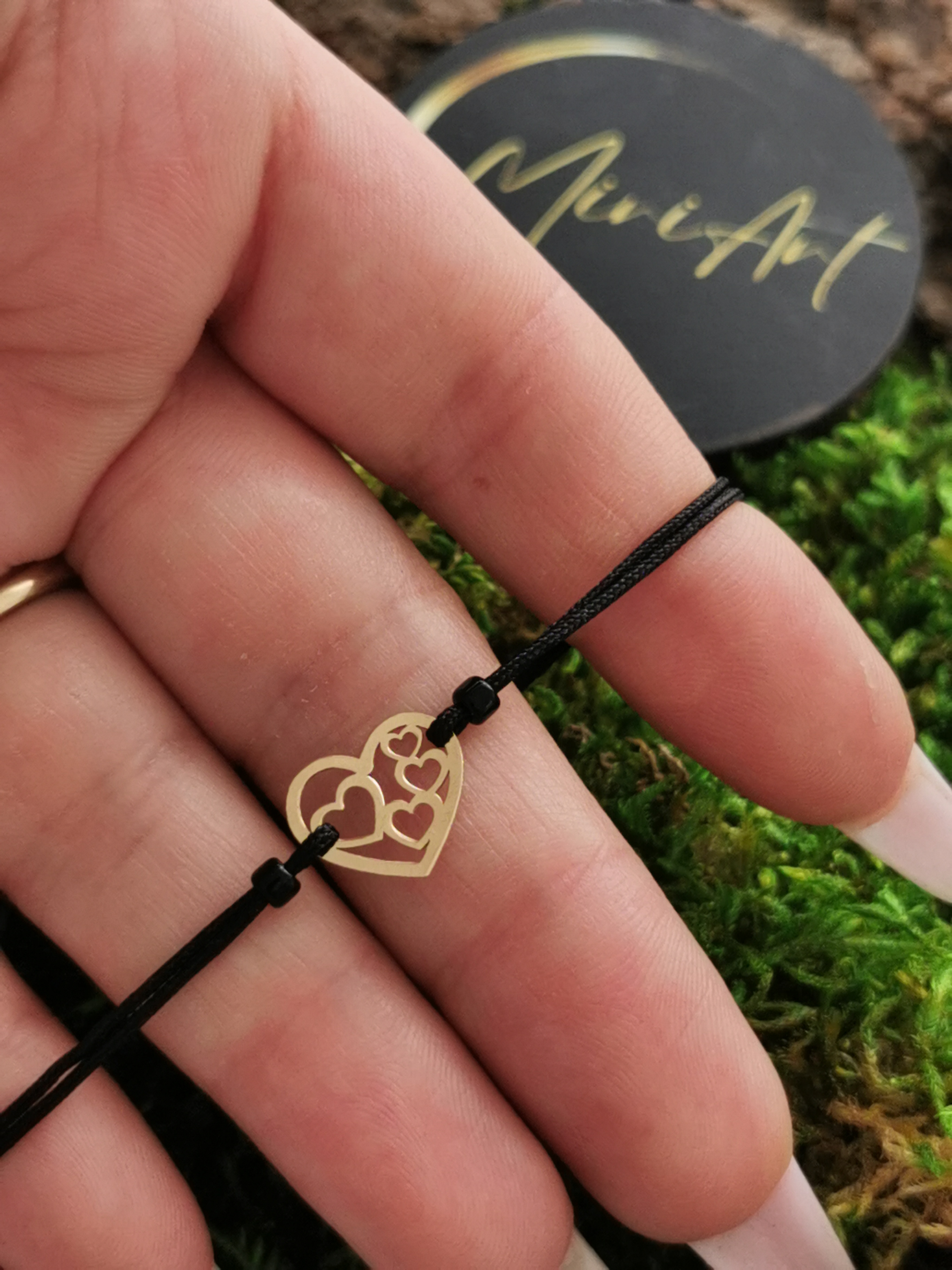 Brățară handmade cu pandantiv inimă cu inimi din aur 14k, montat pe un șnur rezistent, cu închidere reglabilă cu noduri, ușor de ajustat și se potrivește oricărei încheieturi.