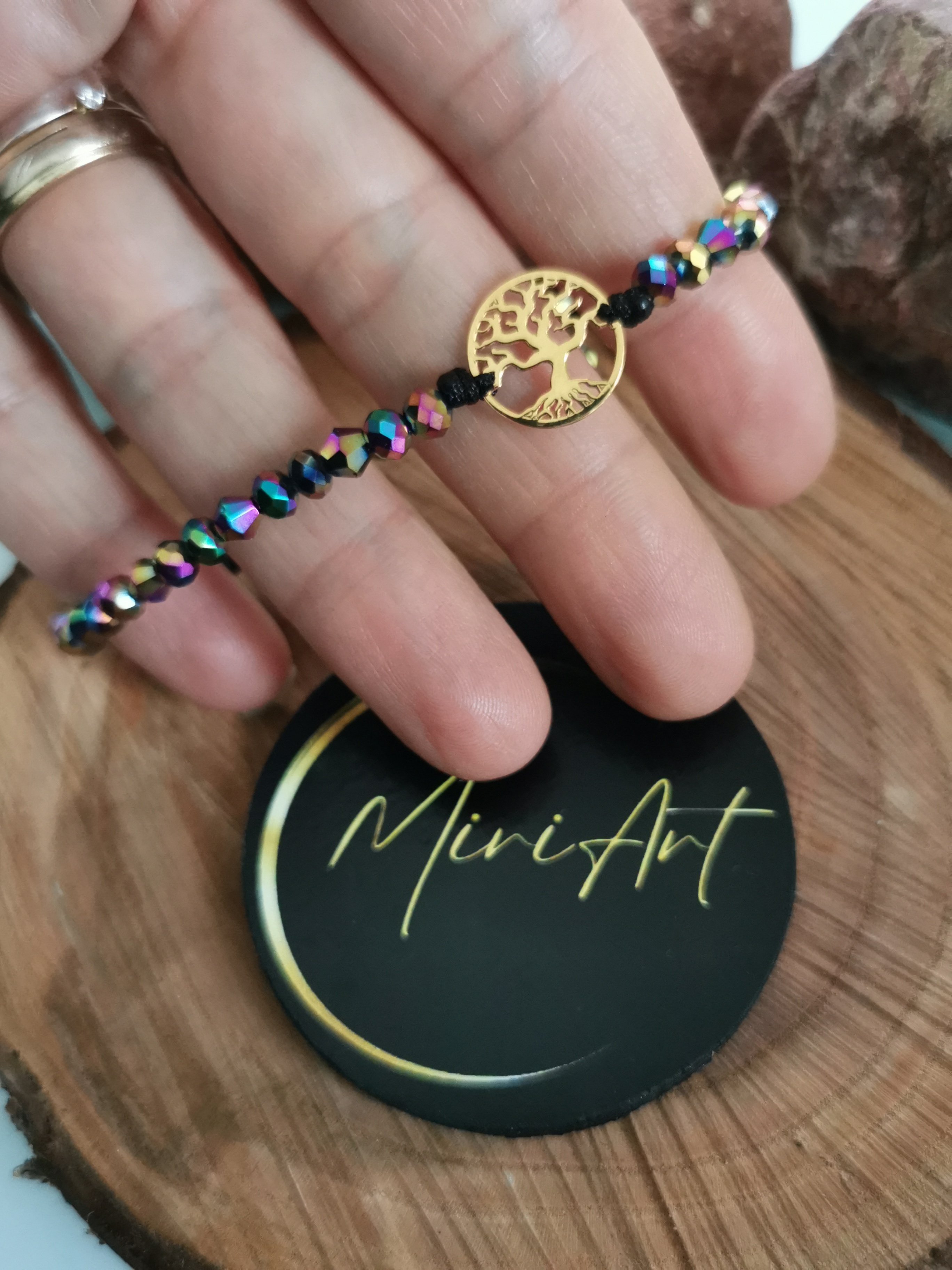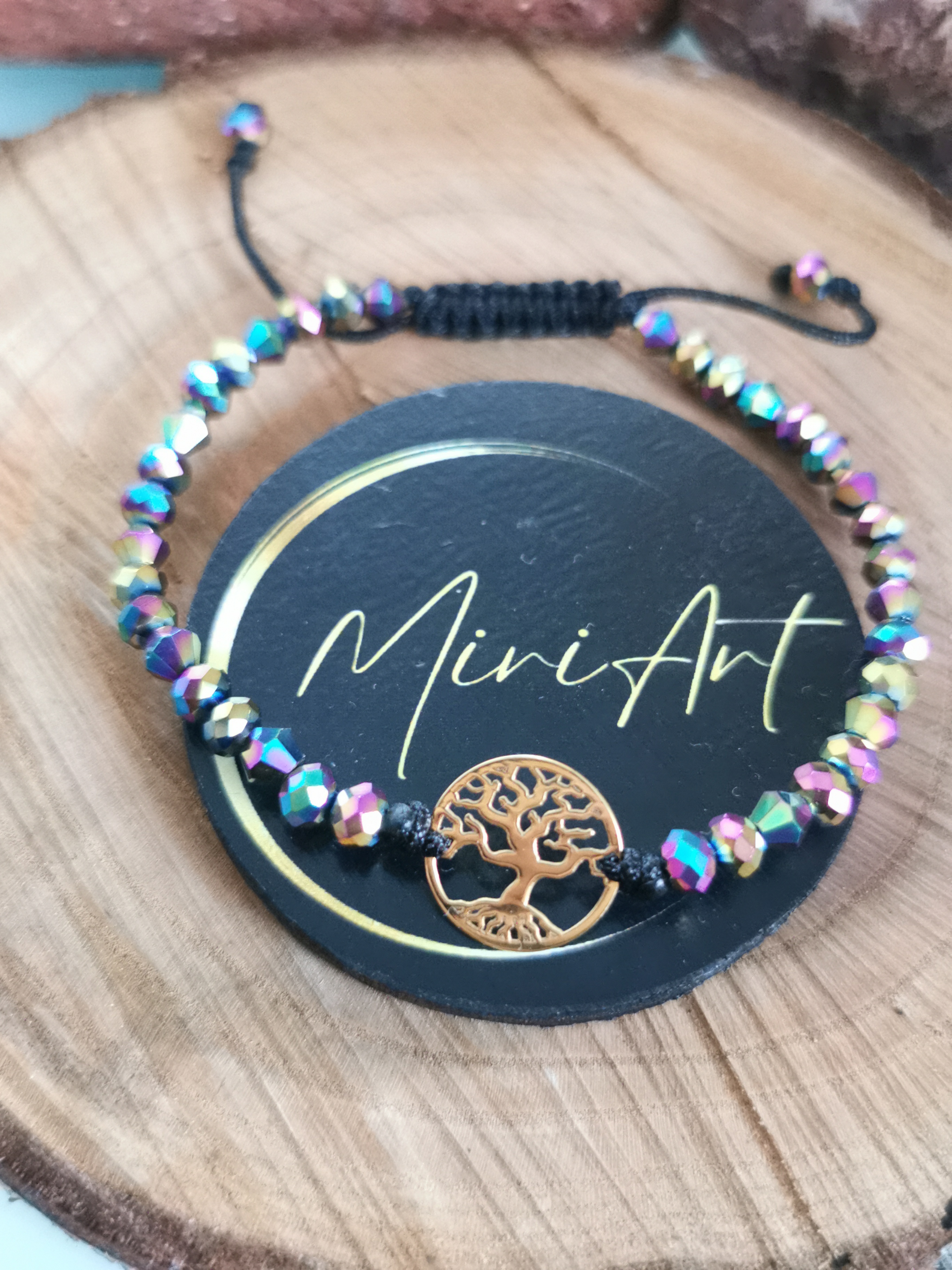 Brățară handmade cu pandantiv copacul vieții din aur 14k, cristale de sticlă și închidere împletită, reglabilă, ușor de ajustat și se potrivește oricărei încheieturi.