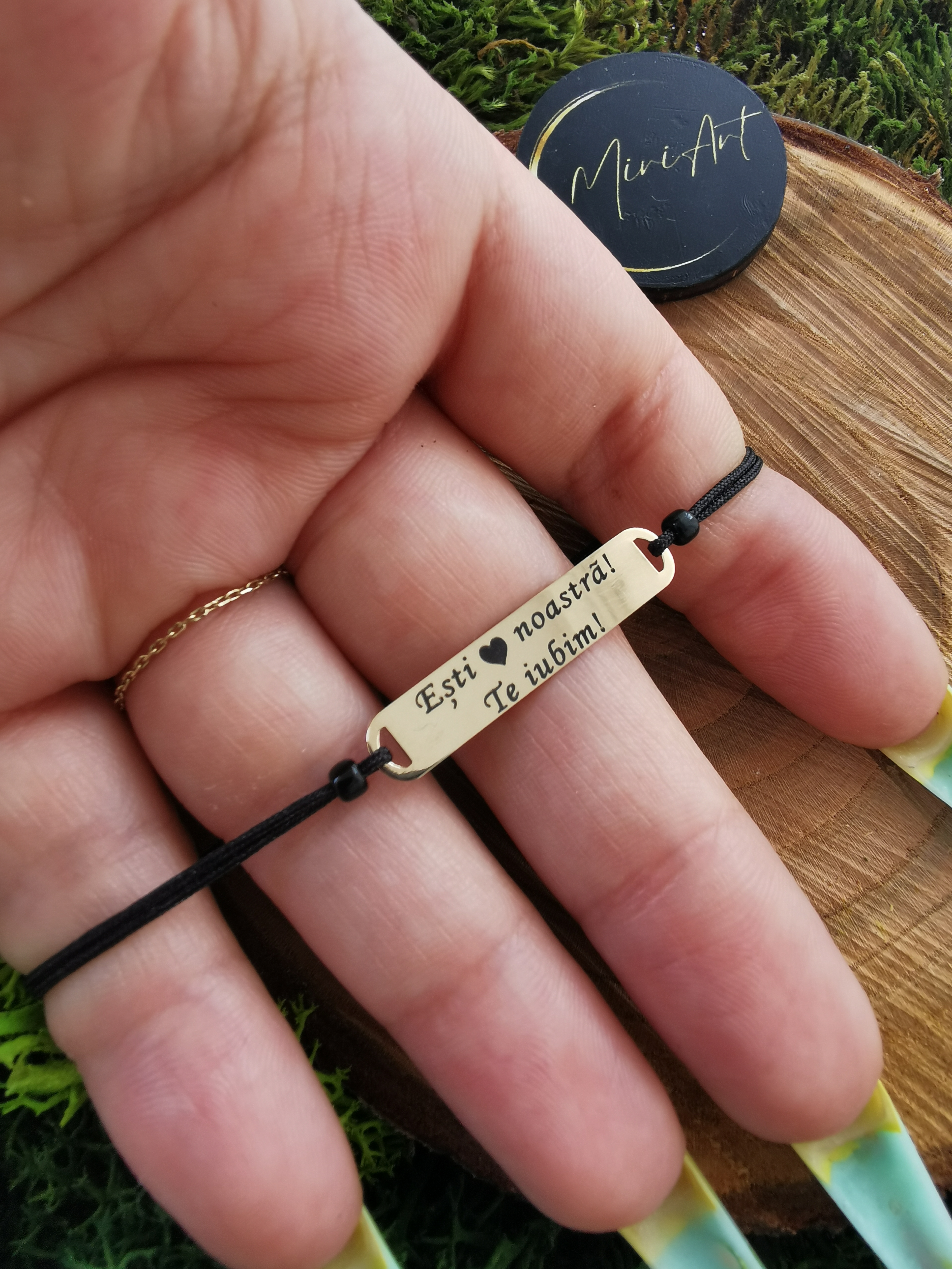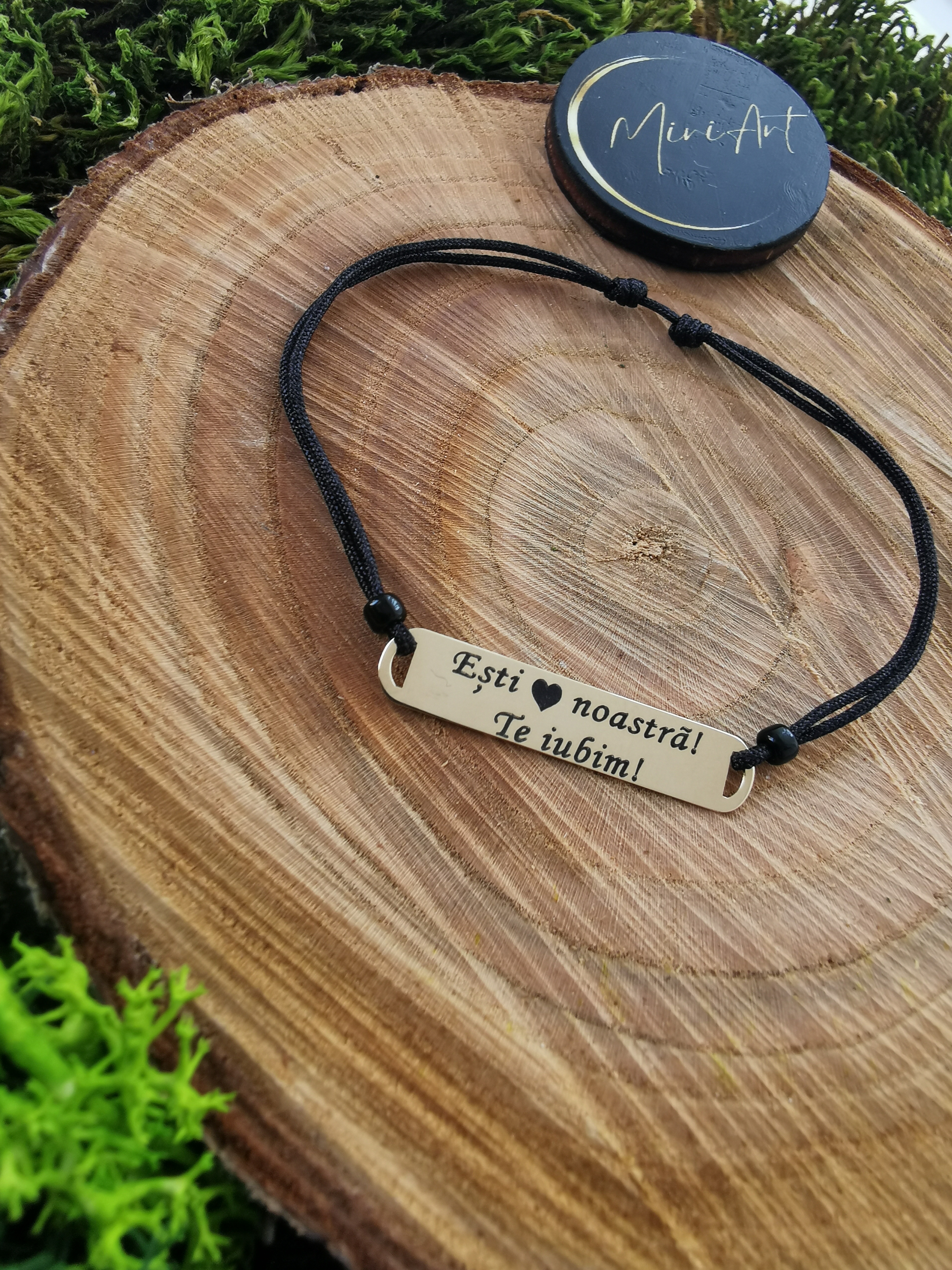 Brățară handmade cu pandantiv plăcuță de 30mm gravat cu mesajul Ești inima noastră! Te iubim! din aur 14k, montat pe un șnur rezistent, cu închidere reglabilă cu noduri, ușor de ajustat și se potrivește oricărei încheieturi.