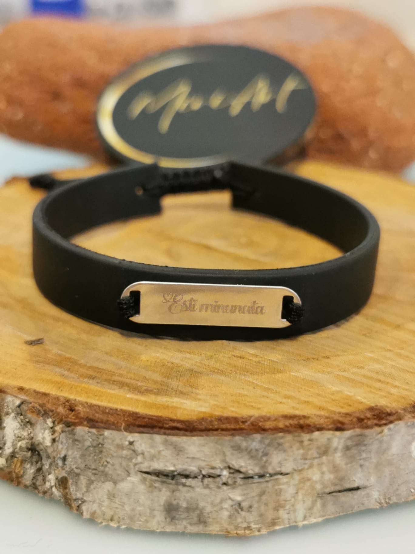 Brățară handmade cu pandantiv plăcuță de 23mm gravat cu mesajul Ești minunată din argint 925, montat pe curea din piele naturală, cu închidere împletită reglabilă, ușor de ajustat și se potrivește oricărei încheieturi.