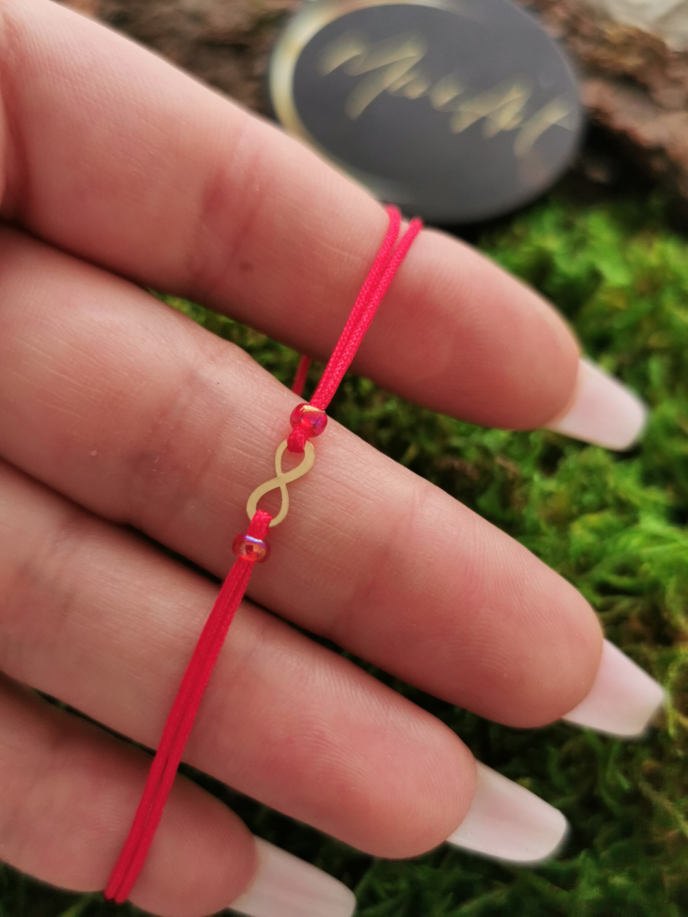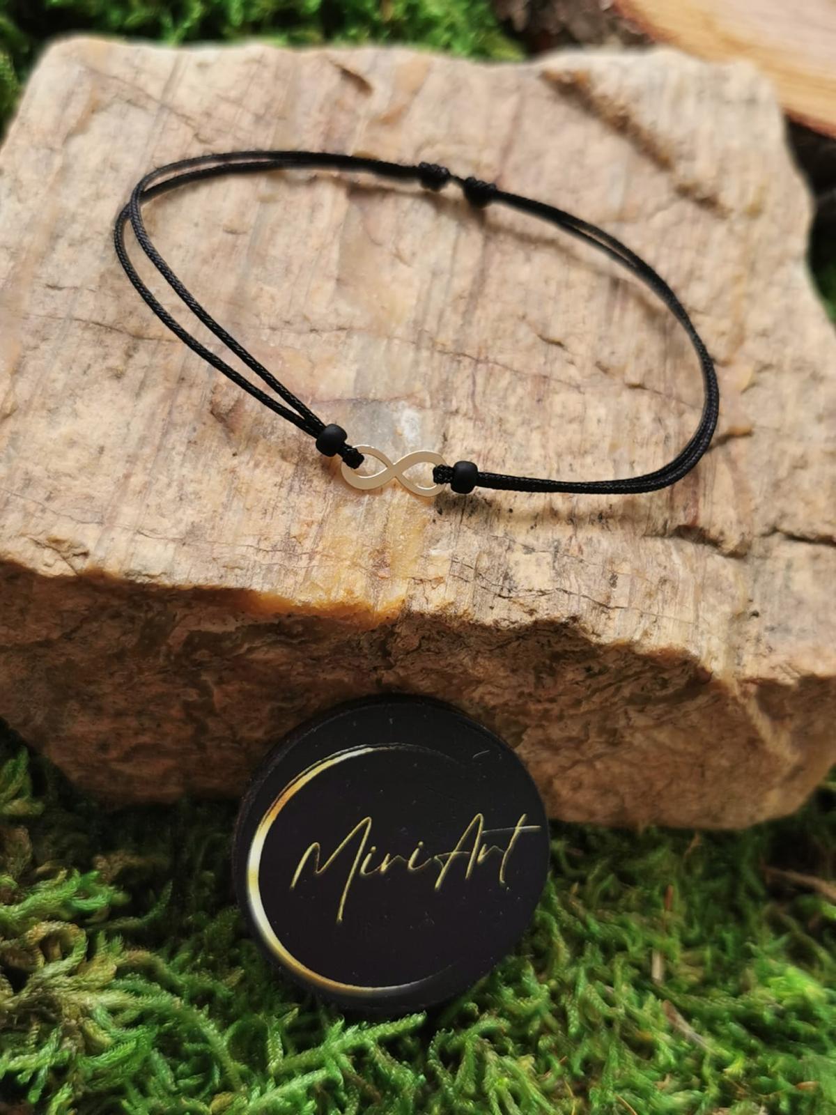 Brățară handmade cu pandantiv infinit din aur 14k, montat pe un șnur rezistent, cu închidere reglabilă cu noduri, ușor de ajustat și se potrivește oricărei încheieturi.