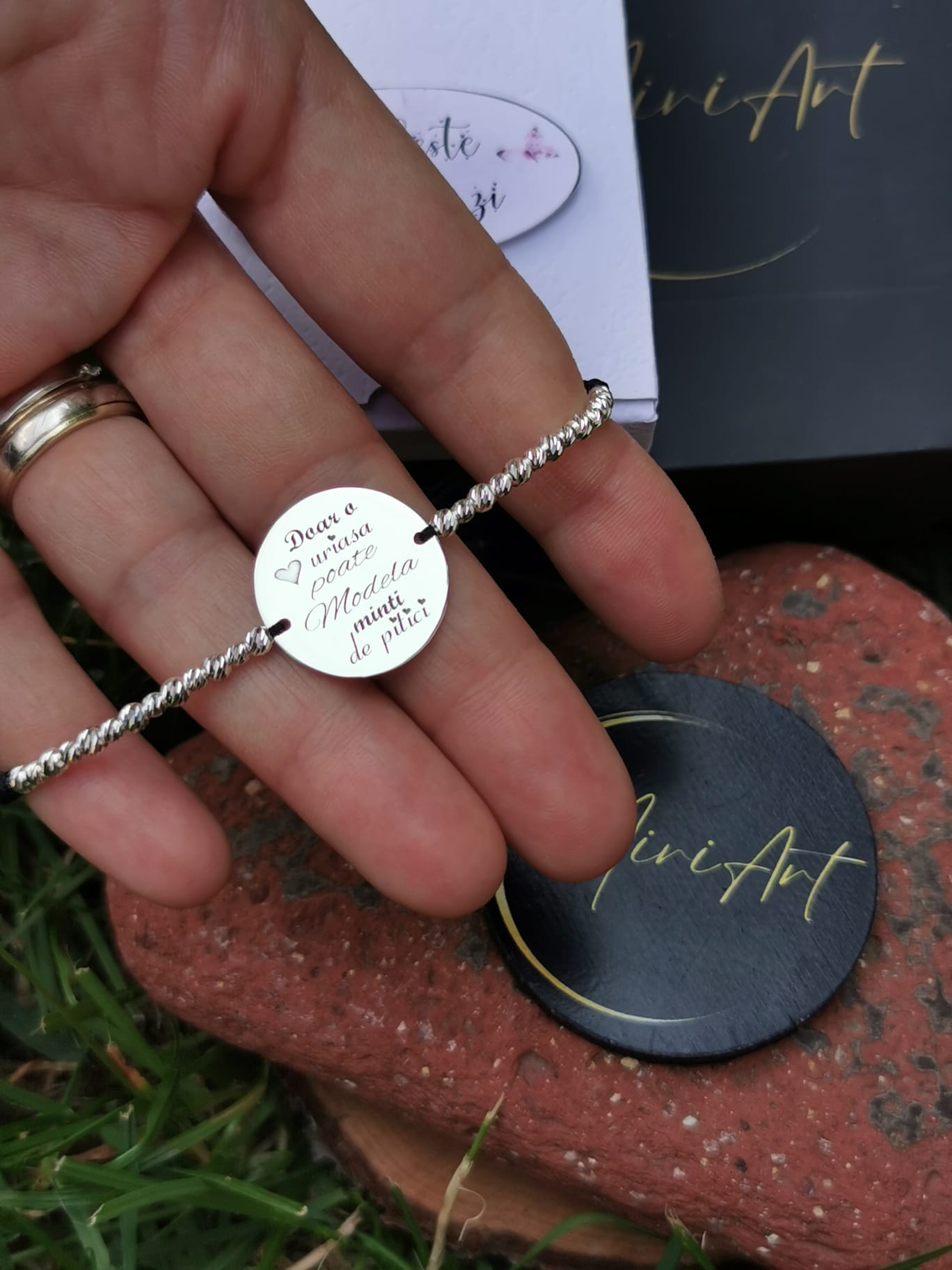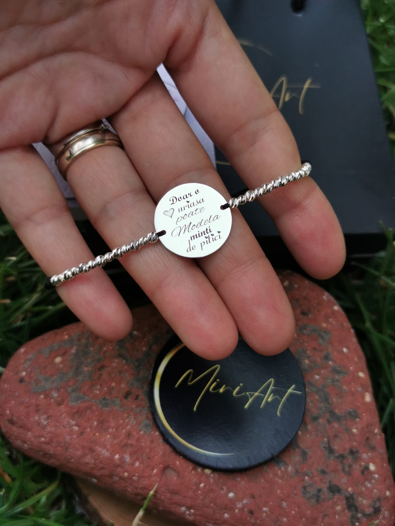 Brățară handmade cu pandantiv din argint925 gravat, 14 sfere de 3mm argint925, 2 sfere de 2,5mm argint925, 2 sfere de 2mm argint925 și închidere reglabilă, cu noduri.