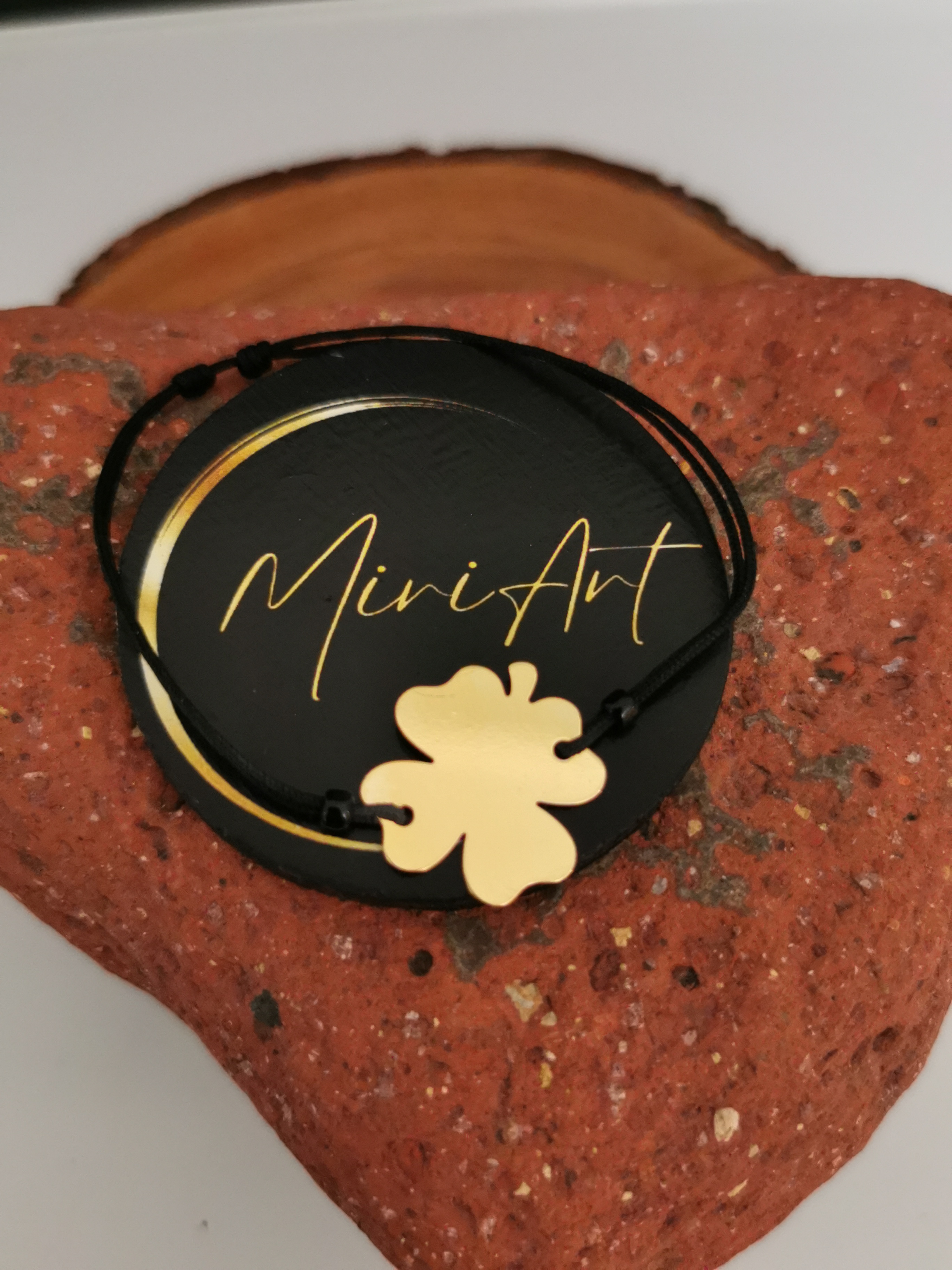 Brățară handmade cu pandantiv trifoi de argint 925 placat cu aur, montat pe un șnur rezistent, cu închidere reglabilă cu noduri, ușor de ajustat și se potrivește oricărei încheieturi.