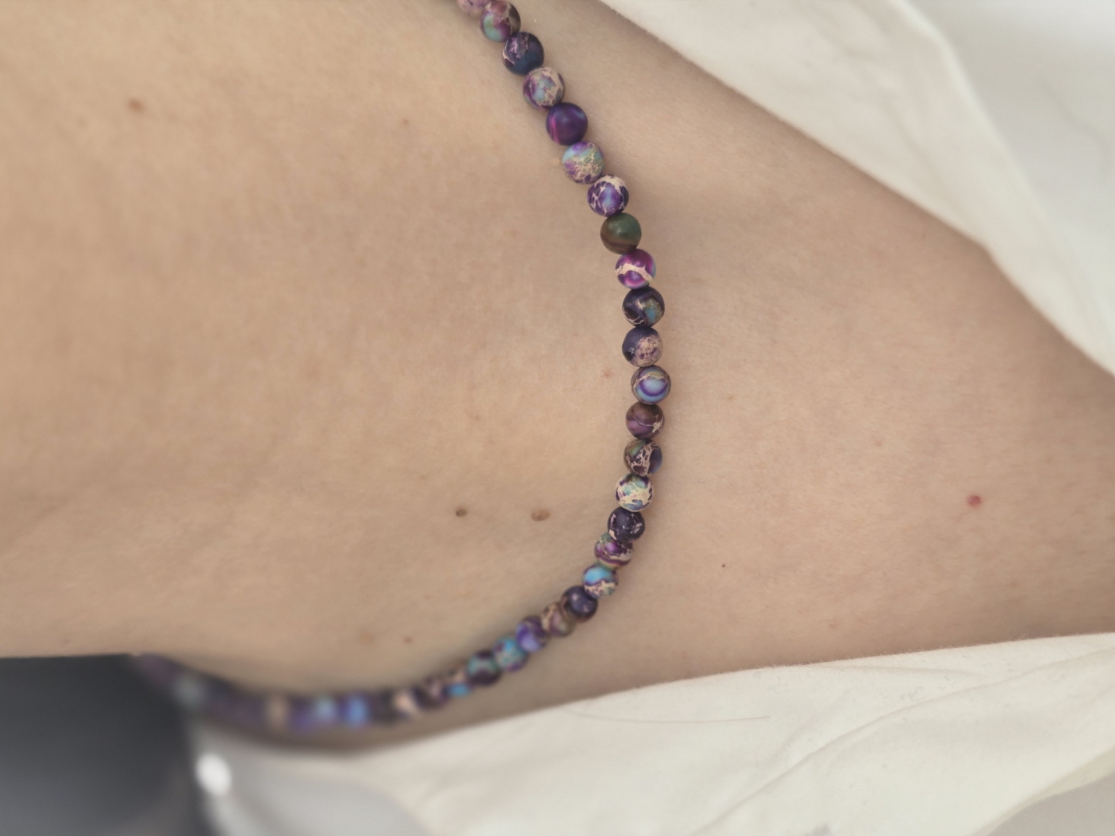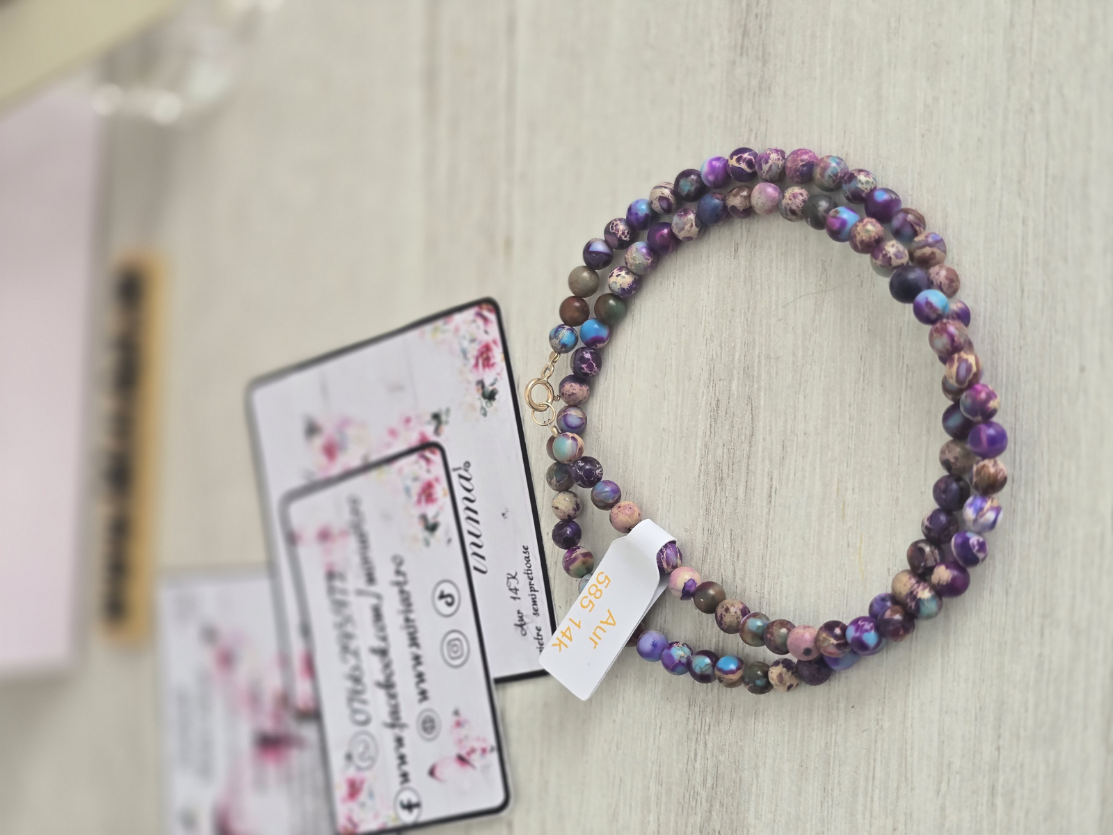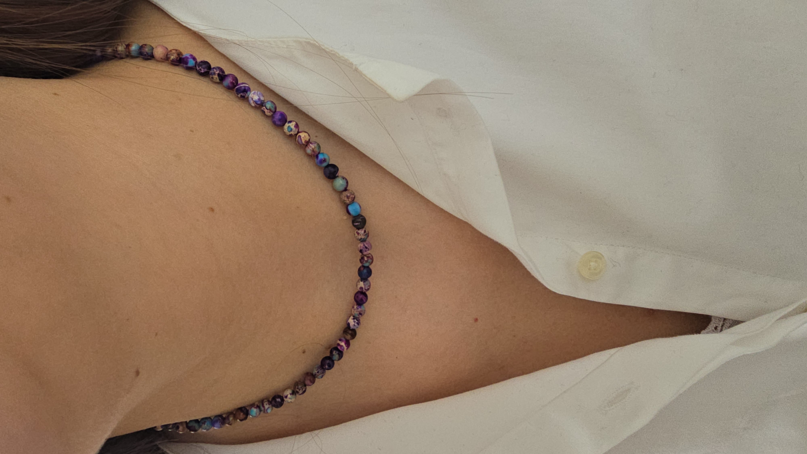 Acest colier din jasp imperial îmbină nuanțe de mov, albastru și alb într-un joc natural de culori, creat pentru echilibru, expresivitate și autenticitate.