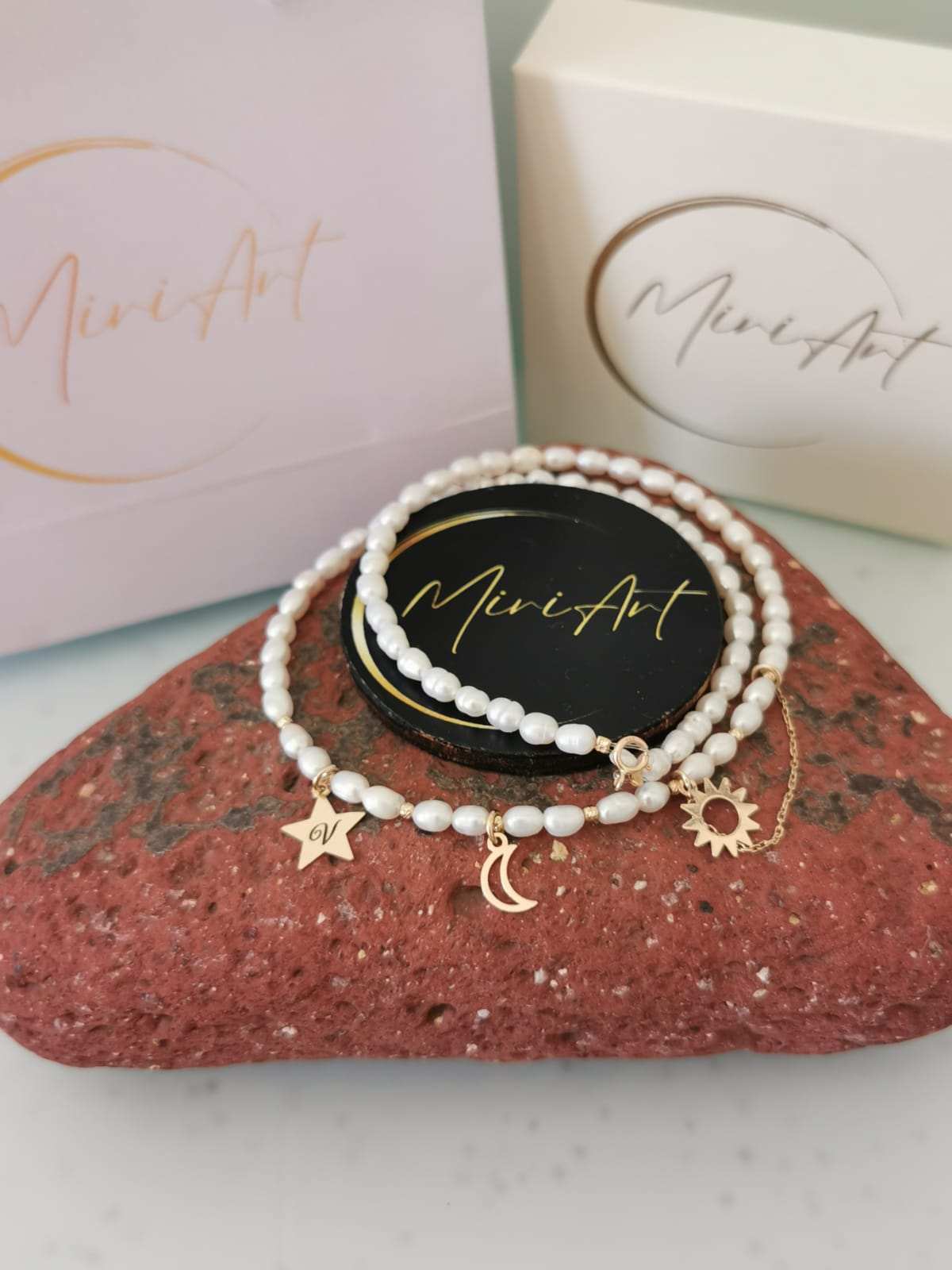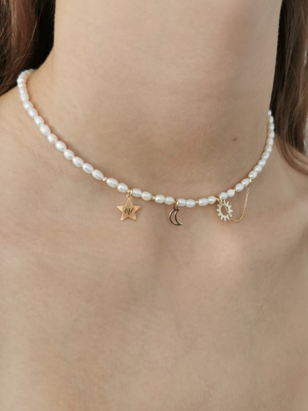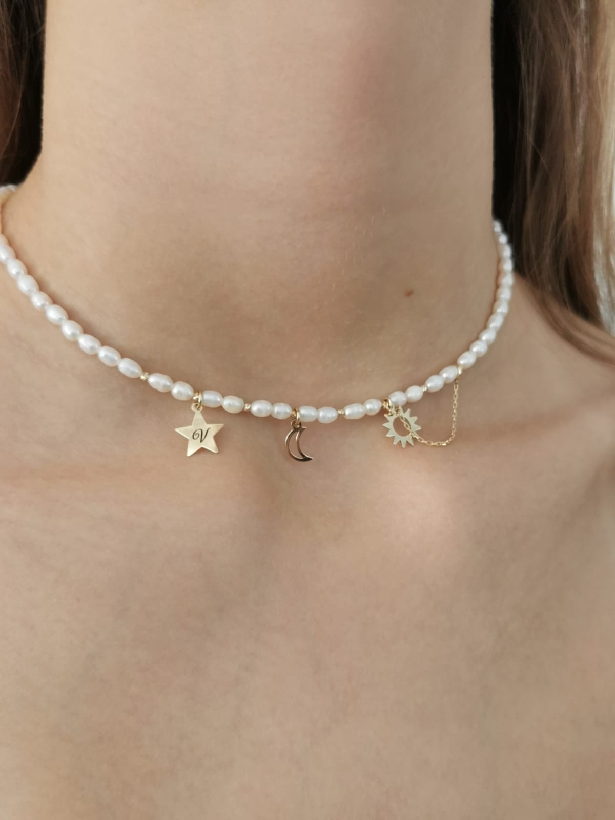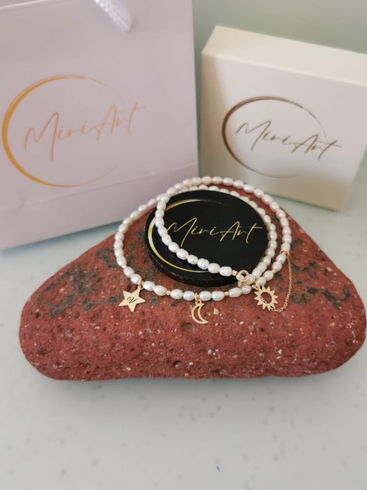 Perlele de cultură bob orez de 3–5 mm adaugă o strălucire naturală și o textură delicată, în timp ce pandantivele din aur 14K – soarele, luna și steaua personalizată cu inițială – transmit energie, protecție și unicitate.