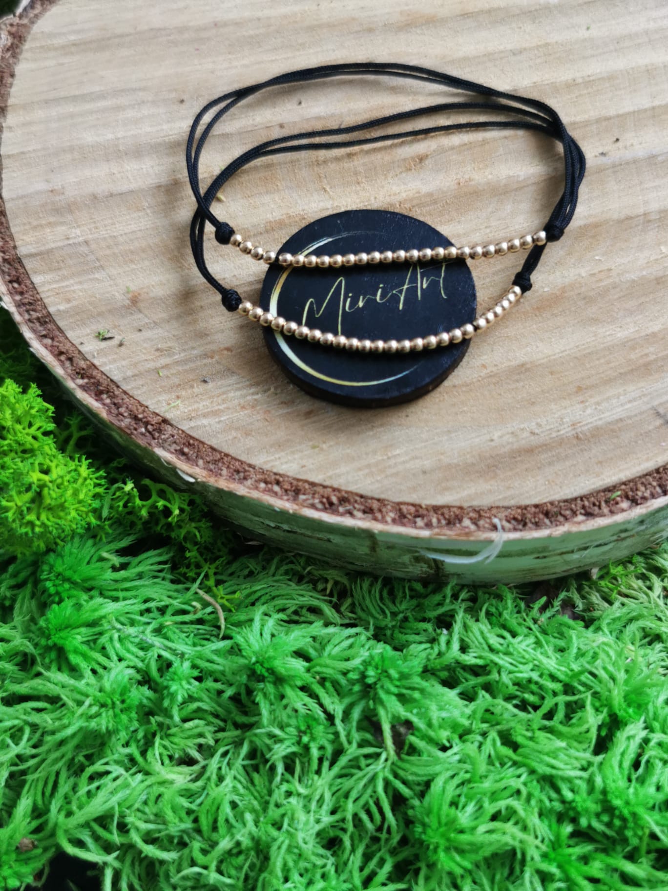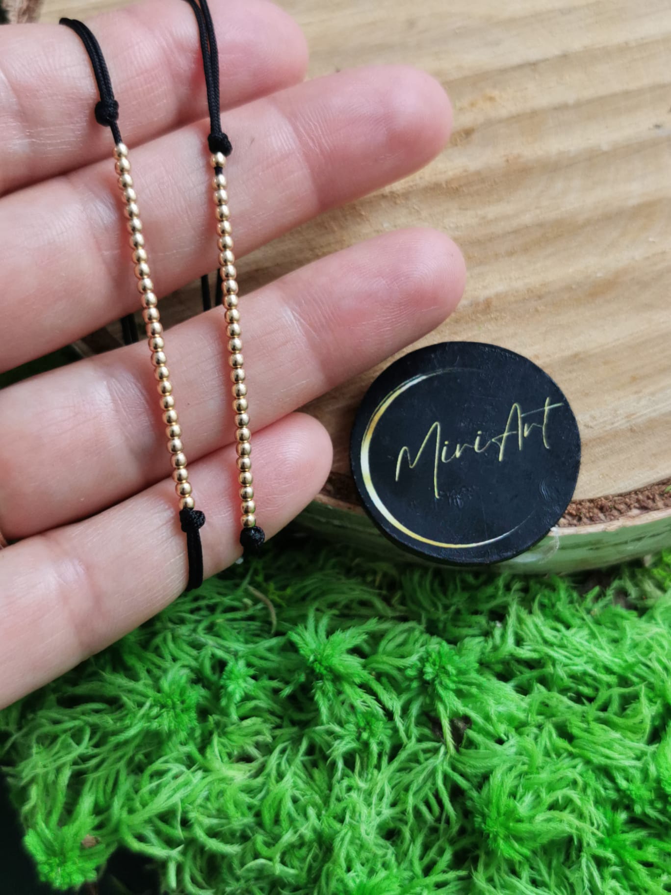 Brățară handmade cu 25 sfere de 2mm netede din aur 14k, montate pe un șnur rezistent, cu închidere reglabilă cu noduri, ușor de ajustat pentru orice încheietură.
