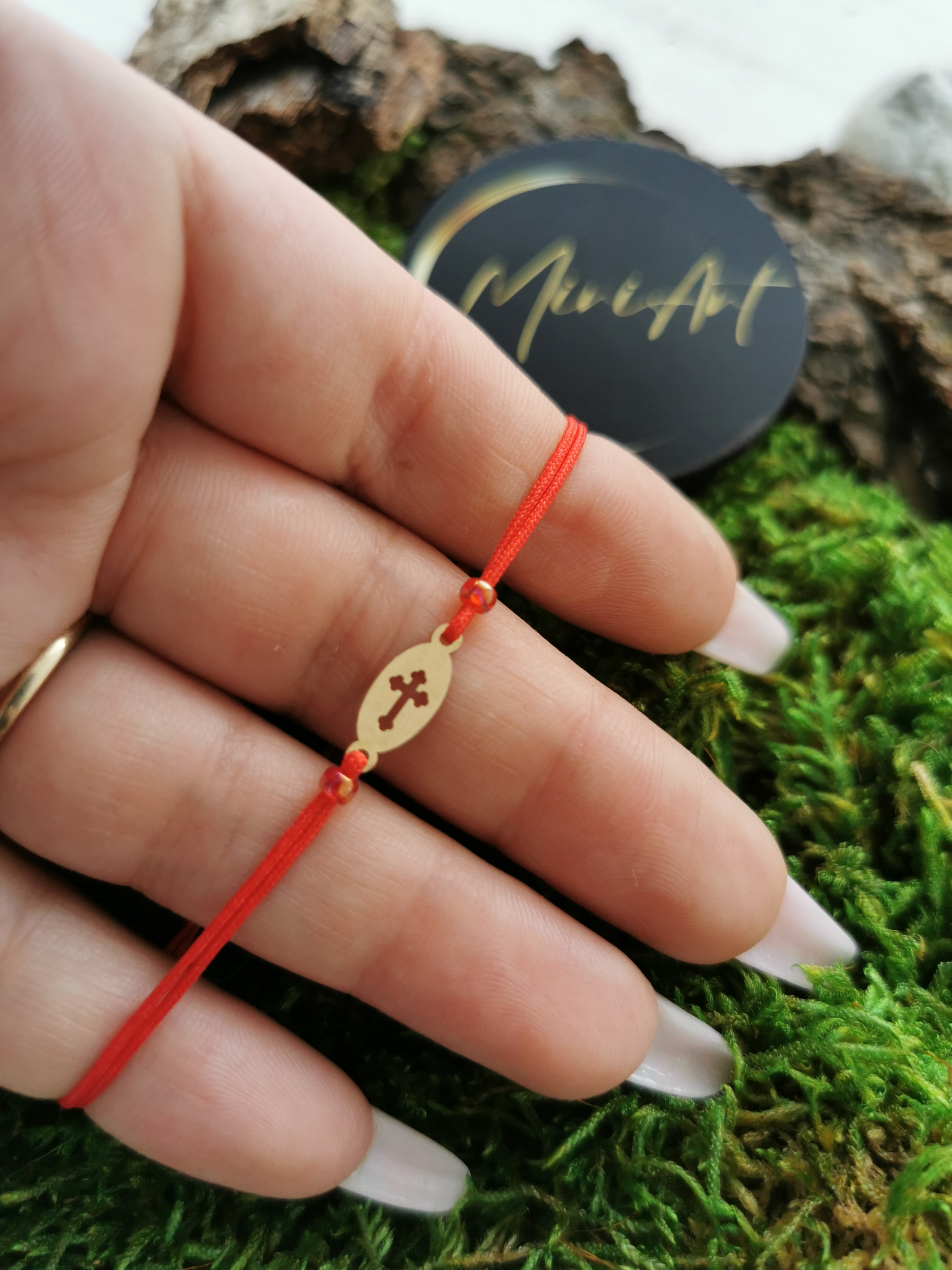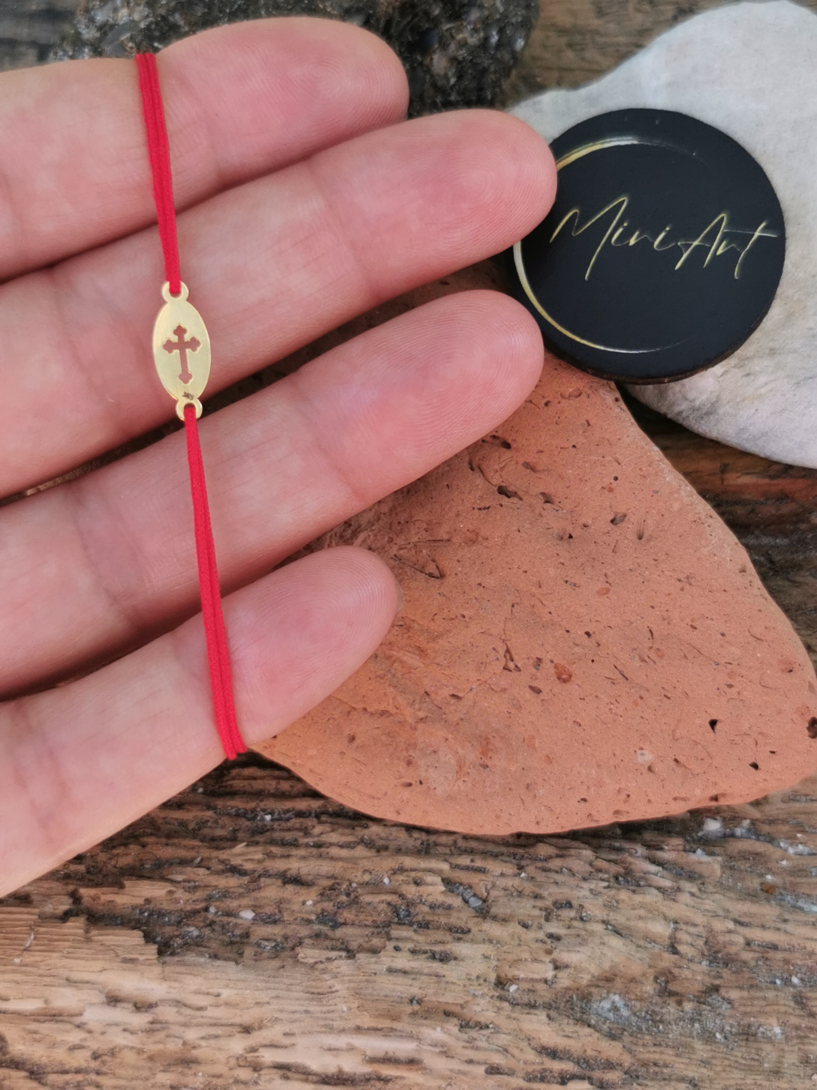 Brățară handmade cu pandantiv cruce în oval din aur 14k, montat pe un șnur rezistent, cu închidere reglabilă cu noduri, ușor de ajustat și se potrivește oricărei încheieturi.