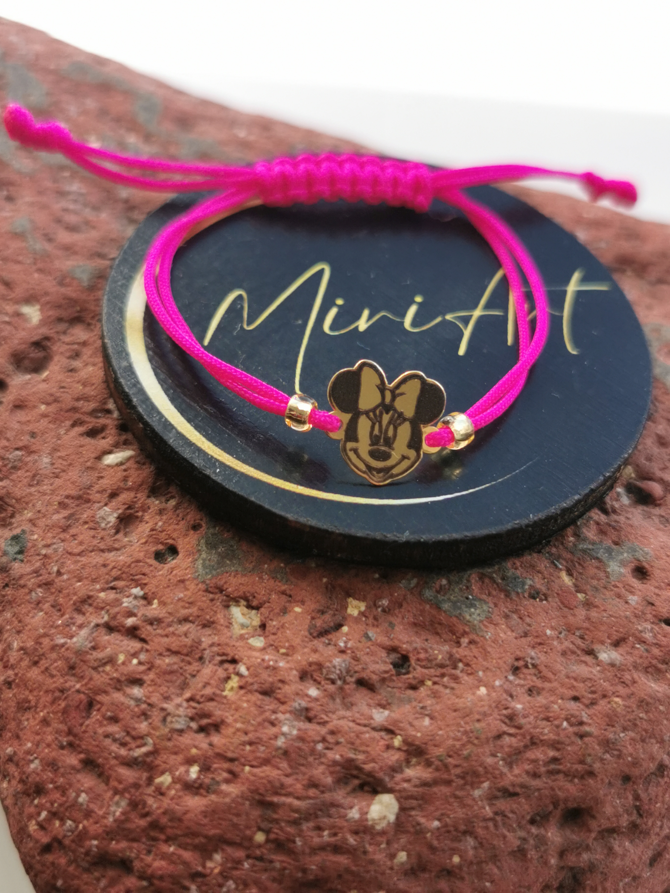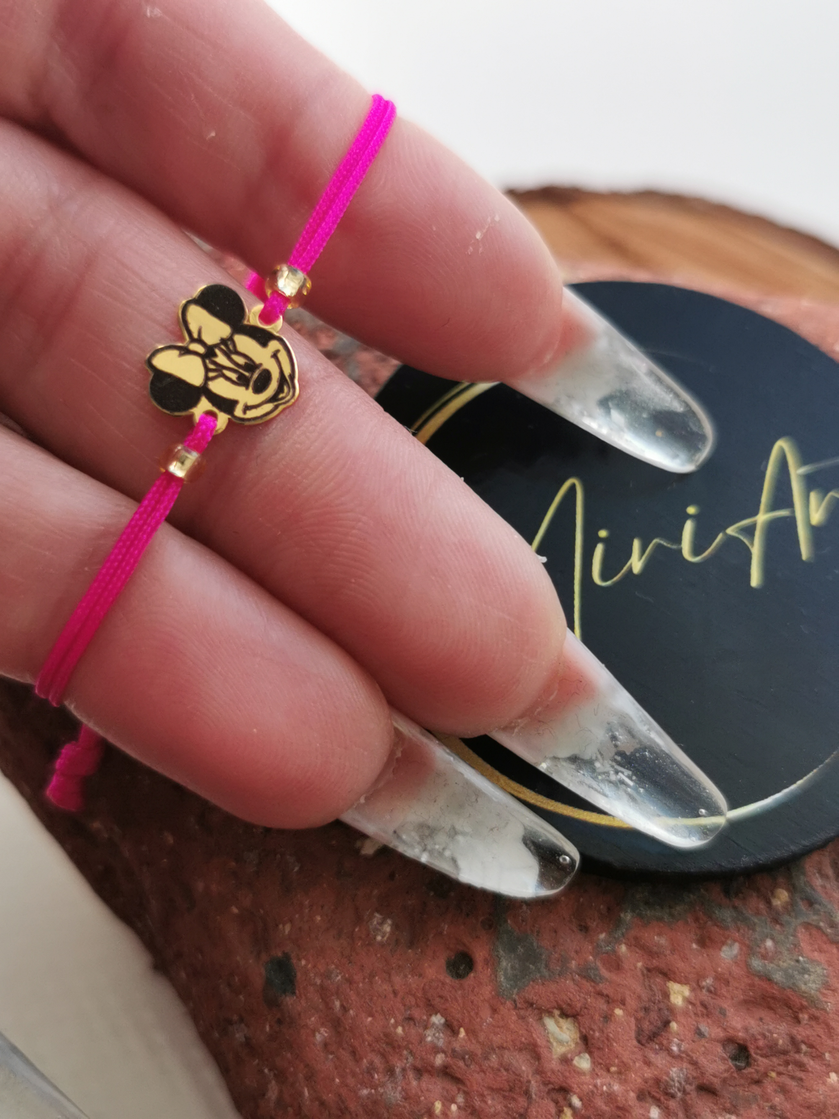 Brățară handmade cu pandantiv Minnie din aur 14k, montat pe un șnur rezistent, cu închidere împletită, reglabilă, ușor de ajustat și se potrivește oricărei încheieturi.