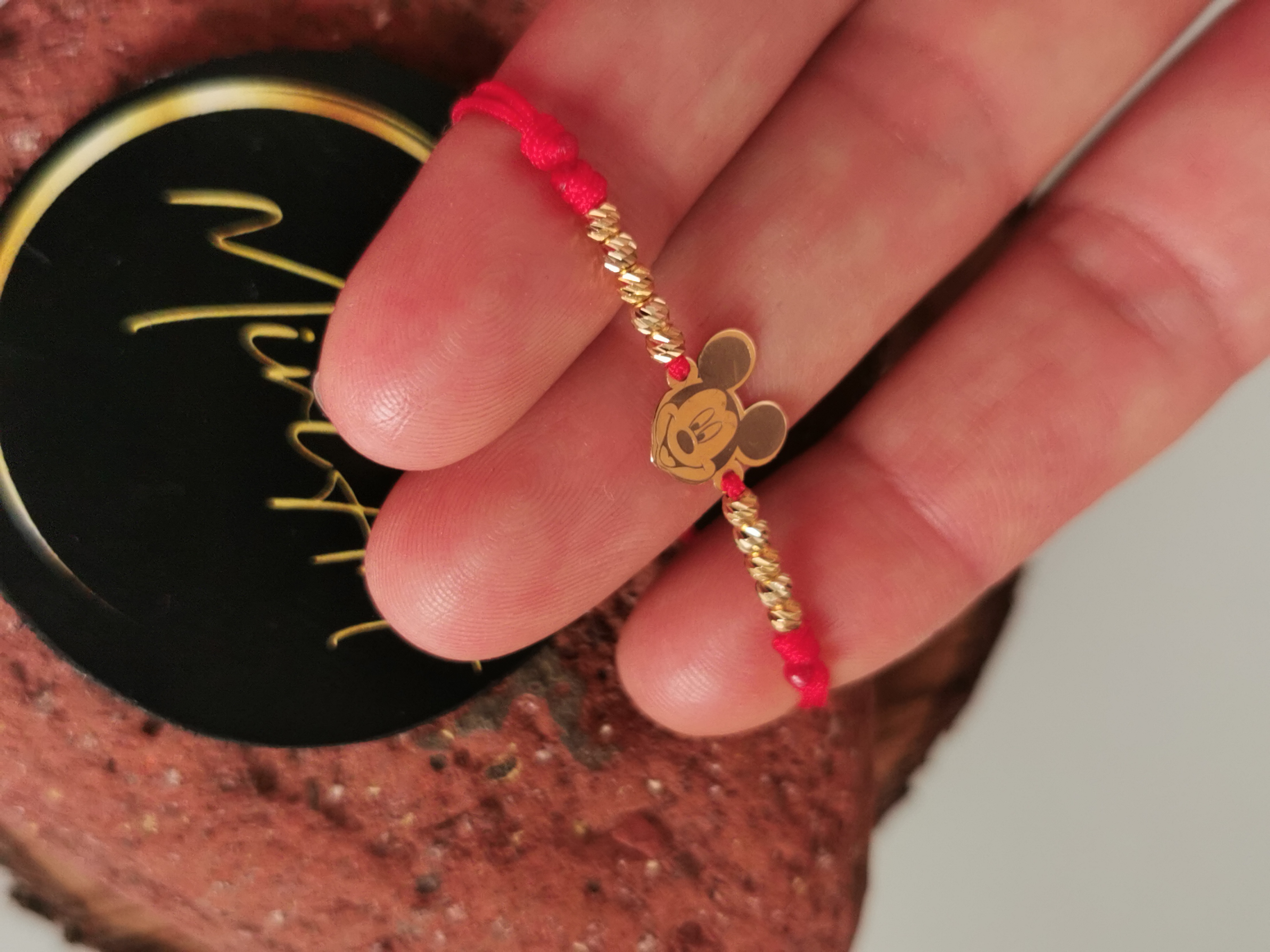 Brățară handmade cu 10 sfere de 2,5mm din aur 14k, pandantiv Mickey din aur 14k și închidere reglabilă cu noduri, ușor de ajustat și potrivită oricărei încheieturi.