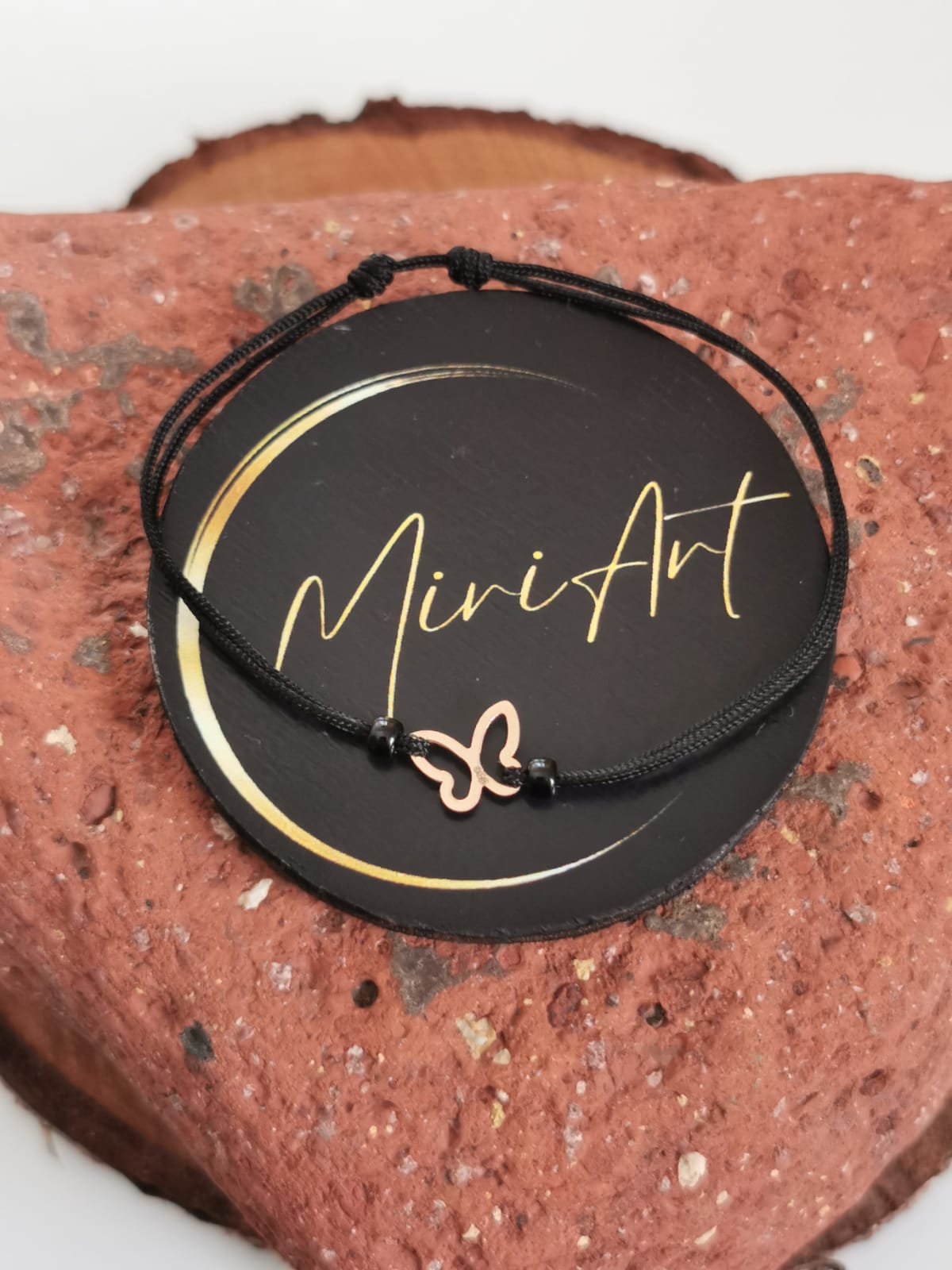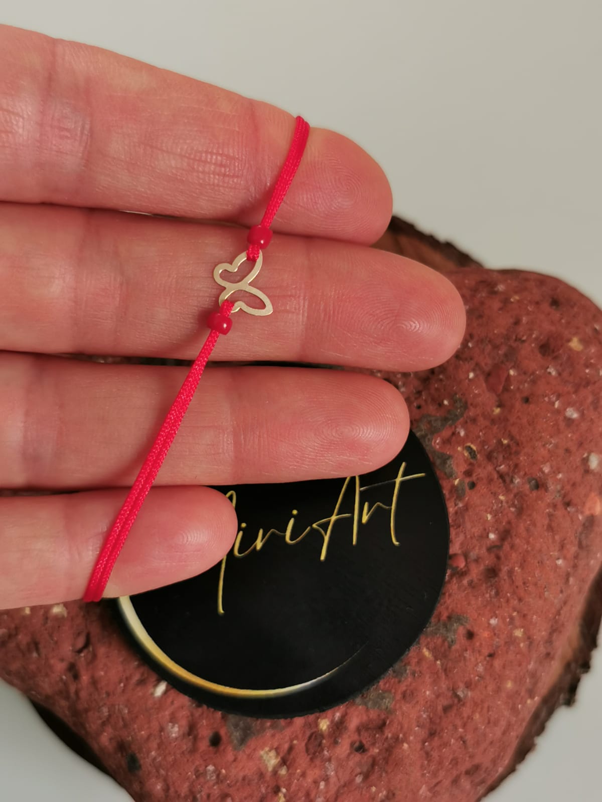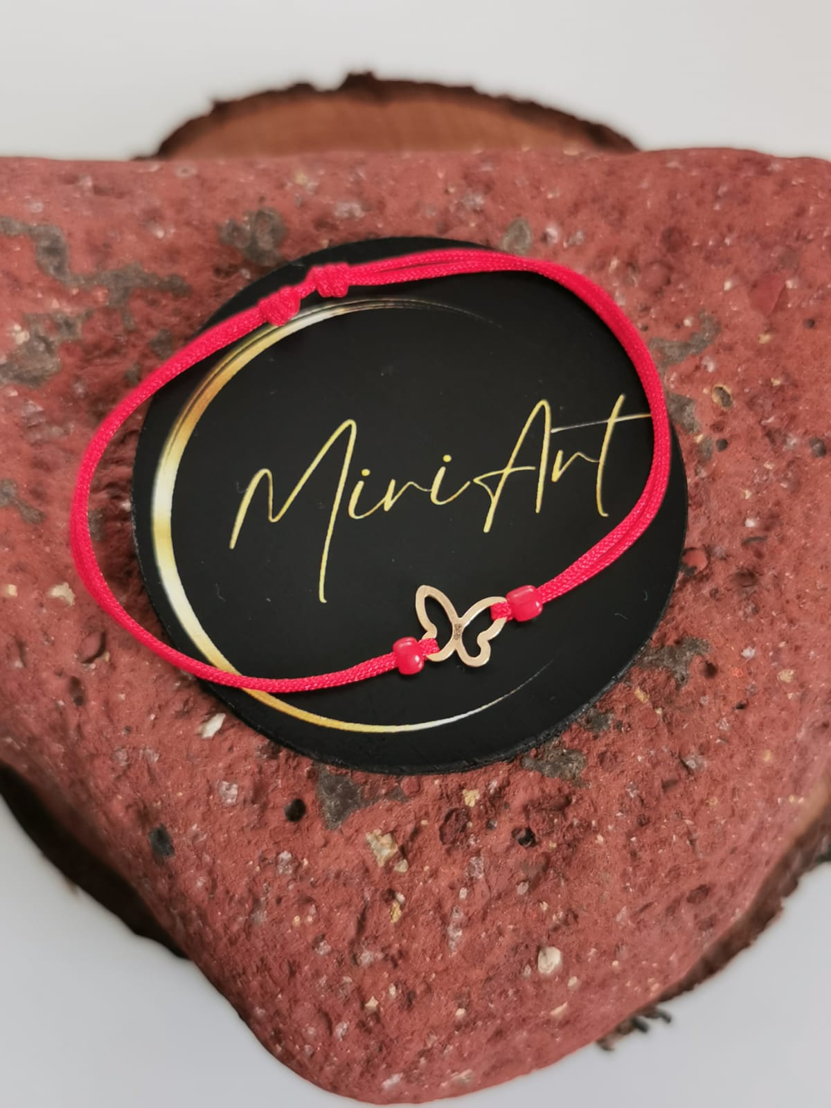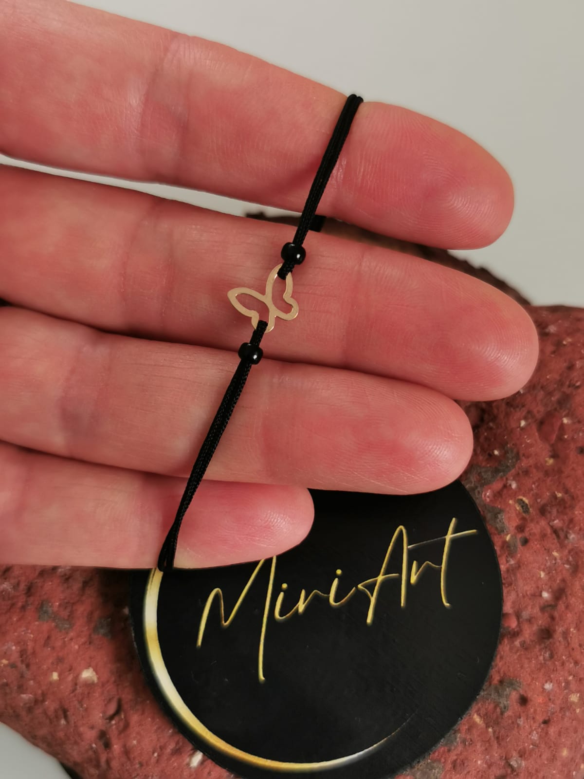 Brățară handmade cu pandantiv fluturaș contur din aur 14k, montat pe un șnur rezistent, cu închidere reglabilă cu noduri, ușor de ajustat și se potrivește oricărei încheieturi.