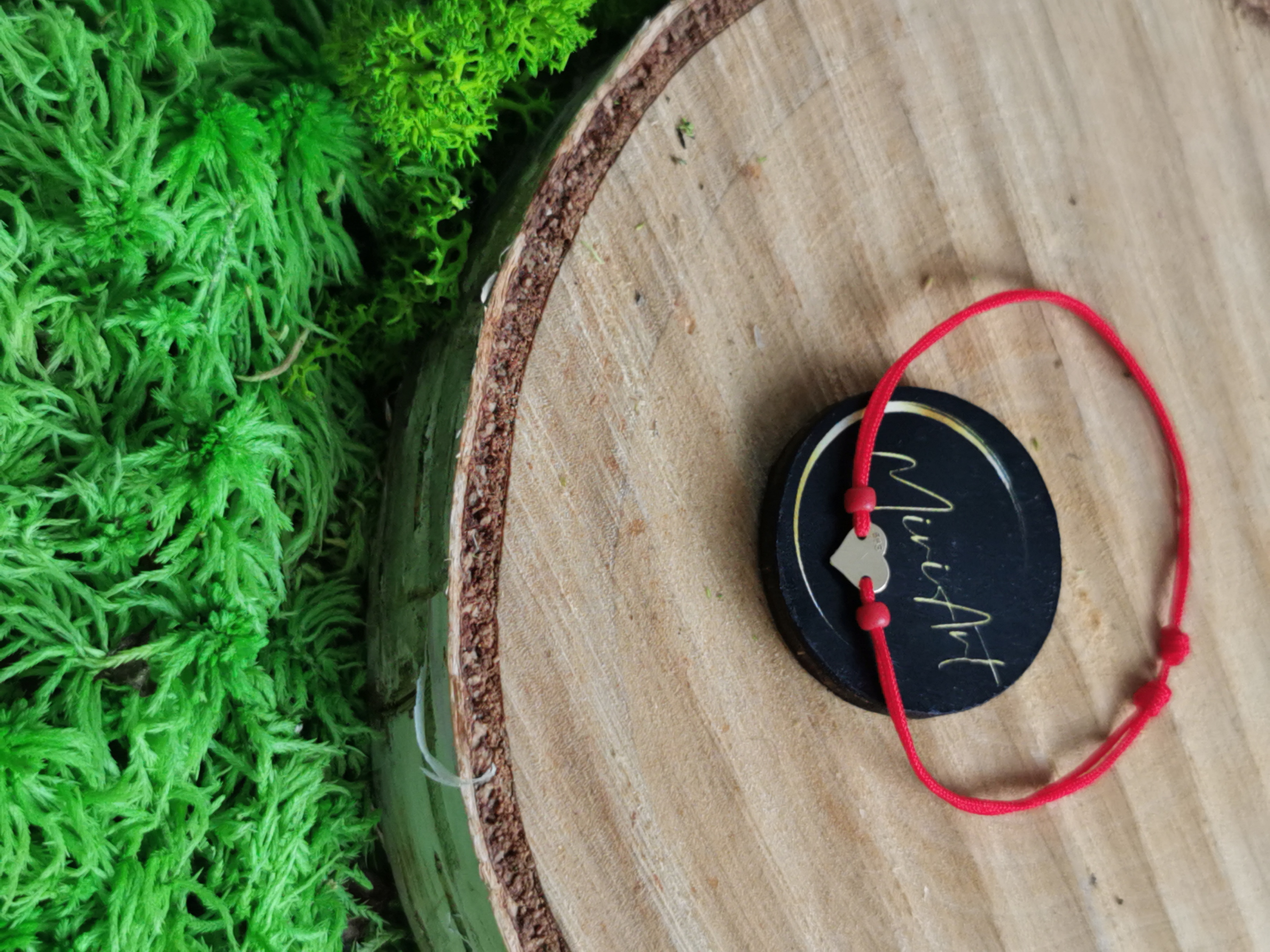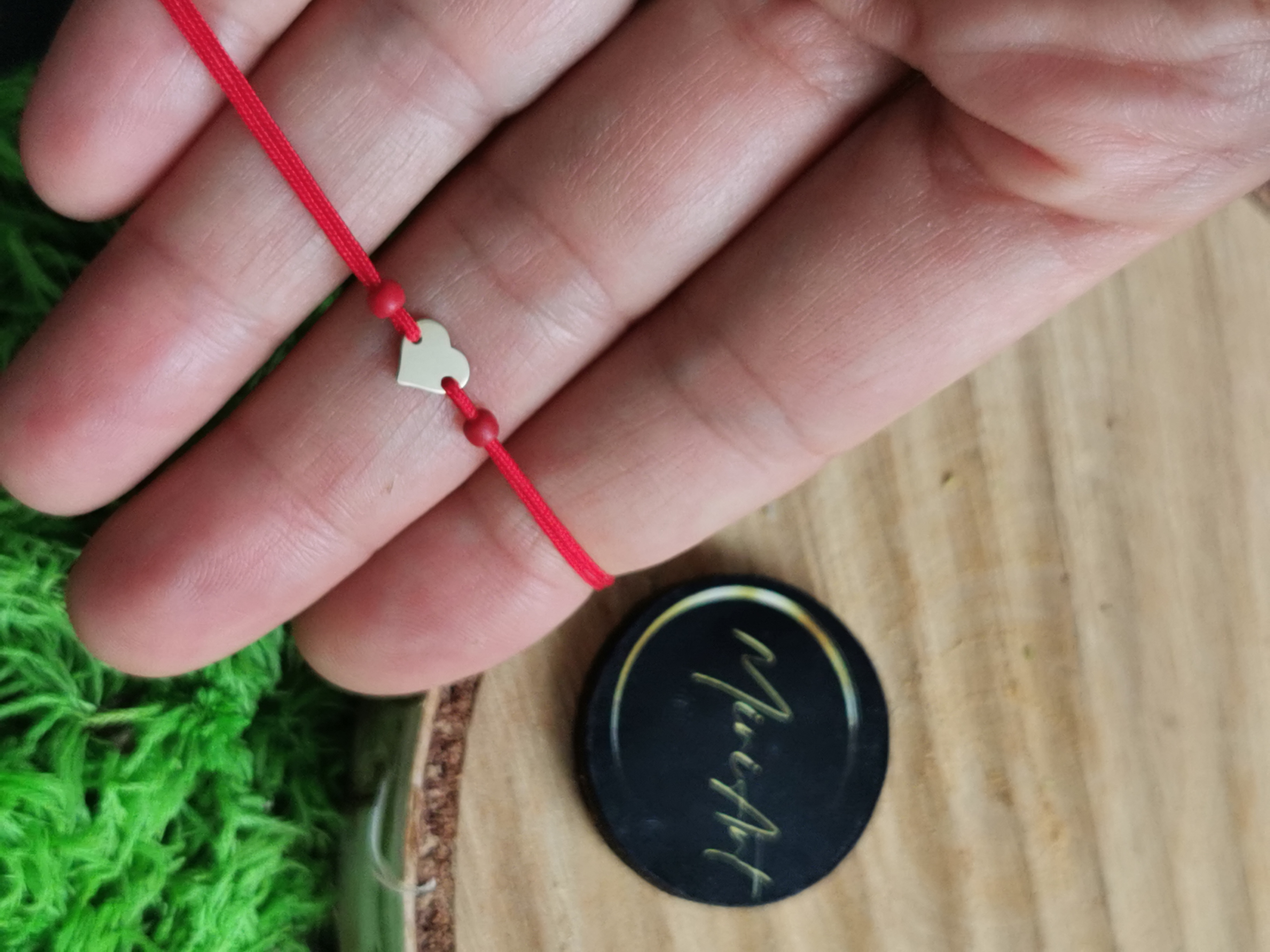 Brățară handmade cu pandantiv inimă din aur 14k, montat pe un șnur rezistent, cu închidere reglabilă cu noduri, ușor de ajustat și se potrivește oricărei încheieturi.