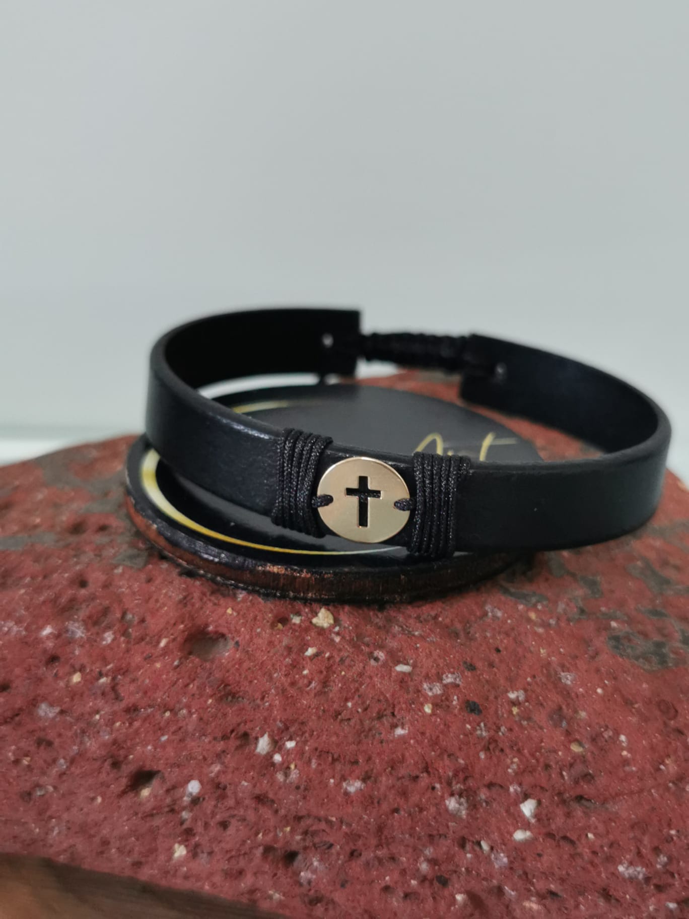 Brățară handmade cu pandantiv bănuț cruce din aur 14k, montat pe curea din piele naturală, cu închidere împletită, reglabilă, ușor de ajustat și se potrivește oricărei încheieturi.