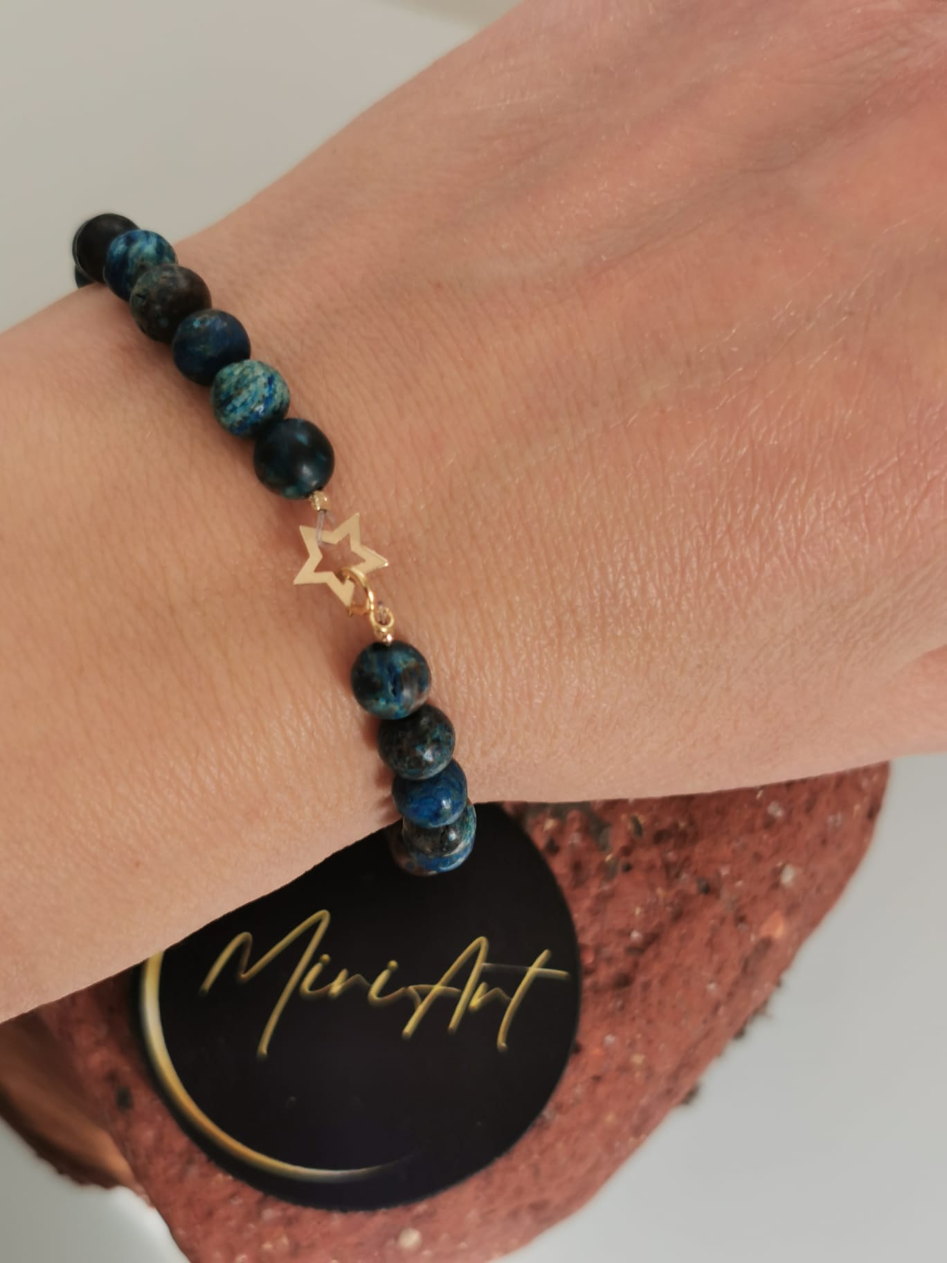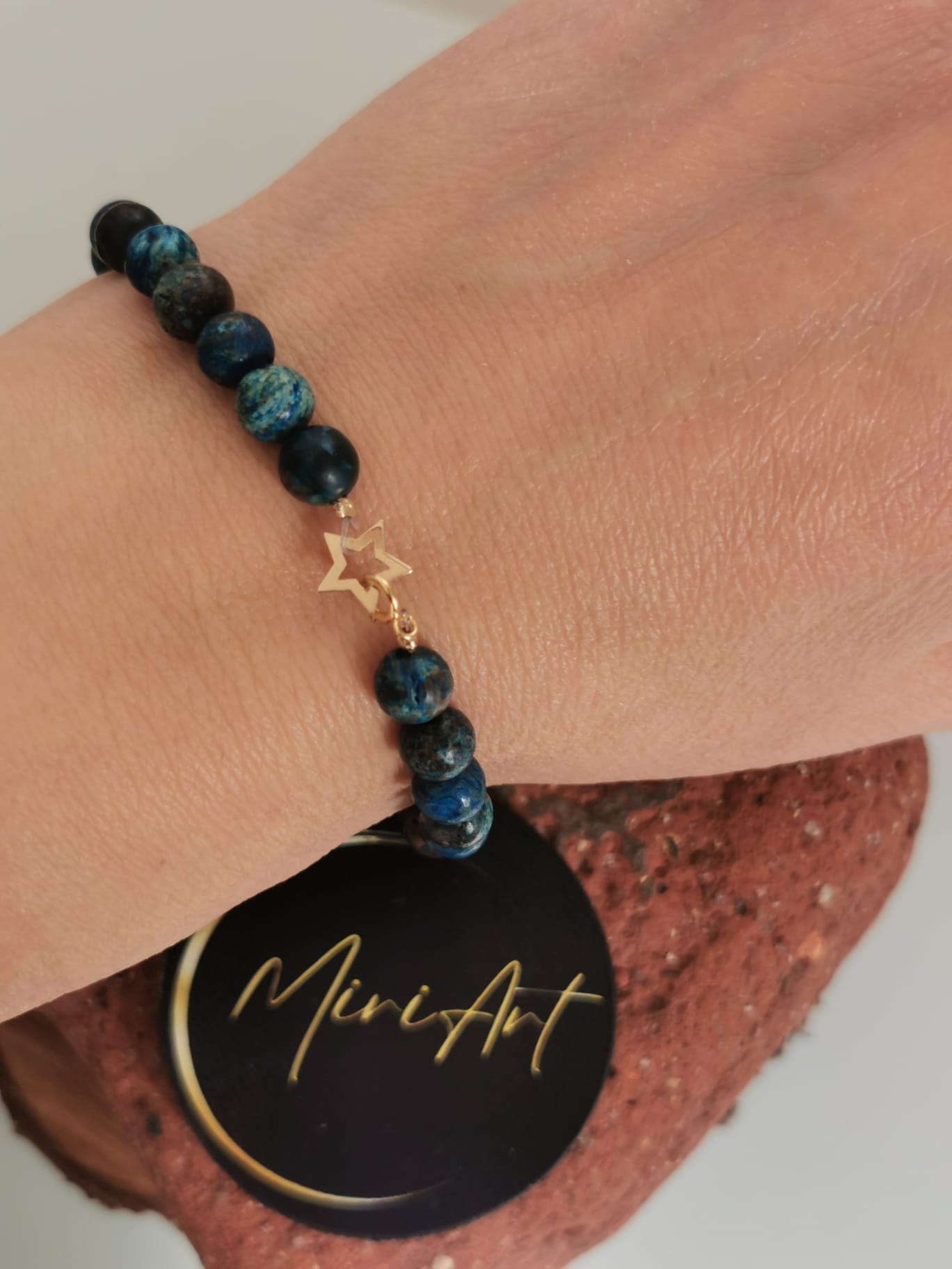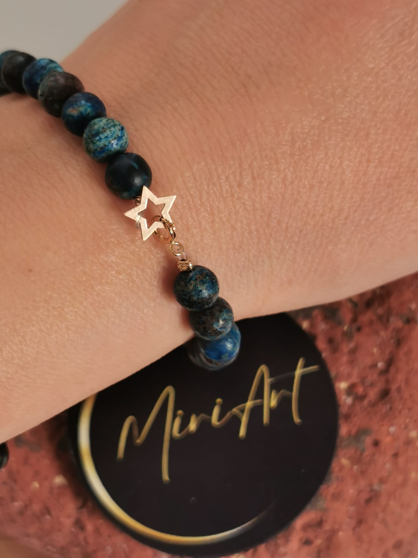 Brățară handmade cu 6 sfere de 2,5mm aur 14k, pandantiv stea din aur 14k, pietre semiprețioase și închidere de aur 14k.