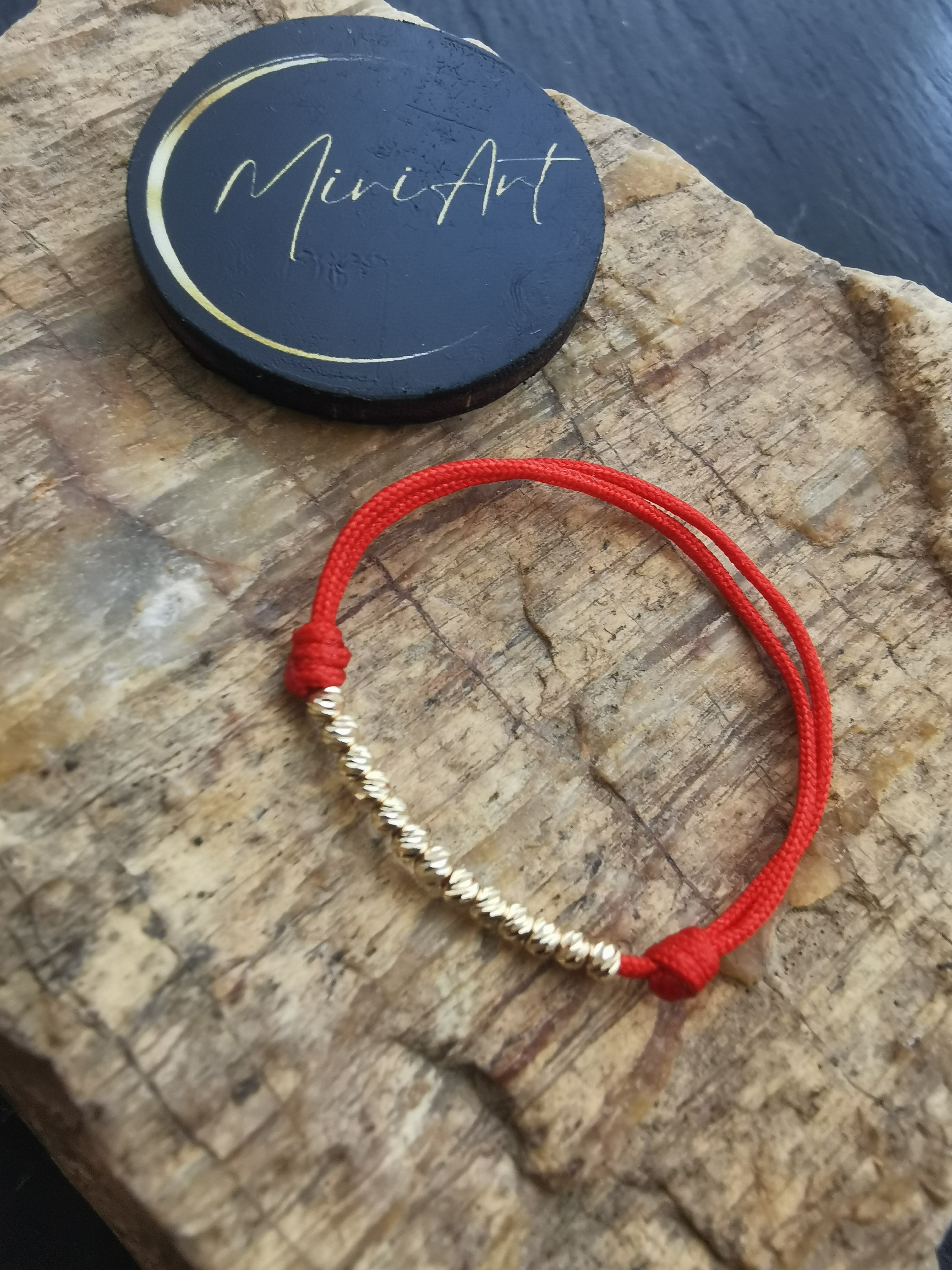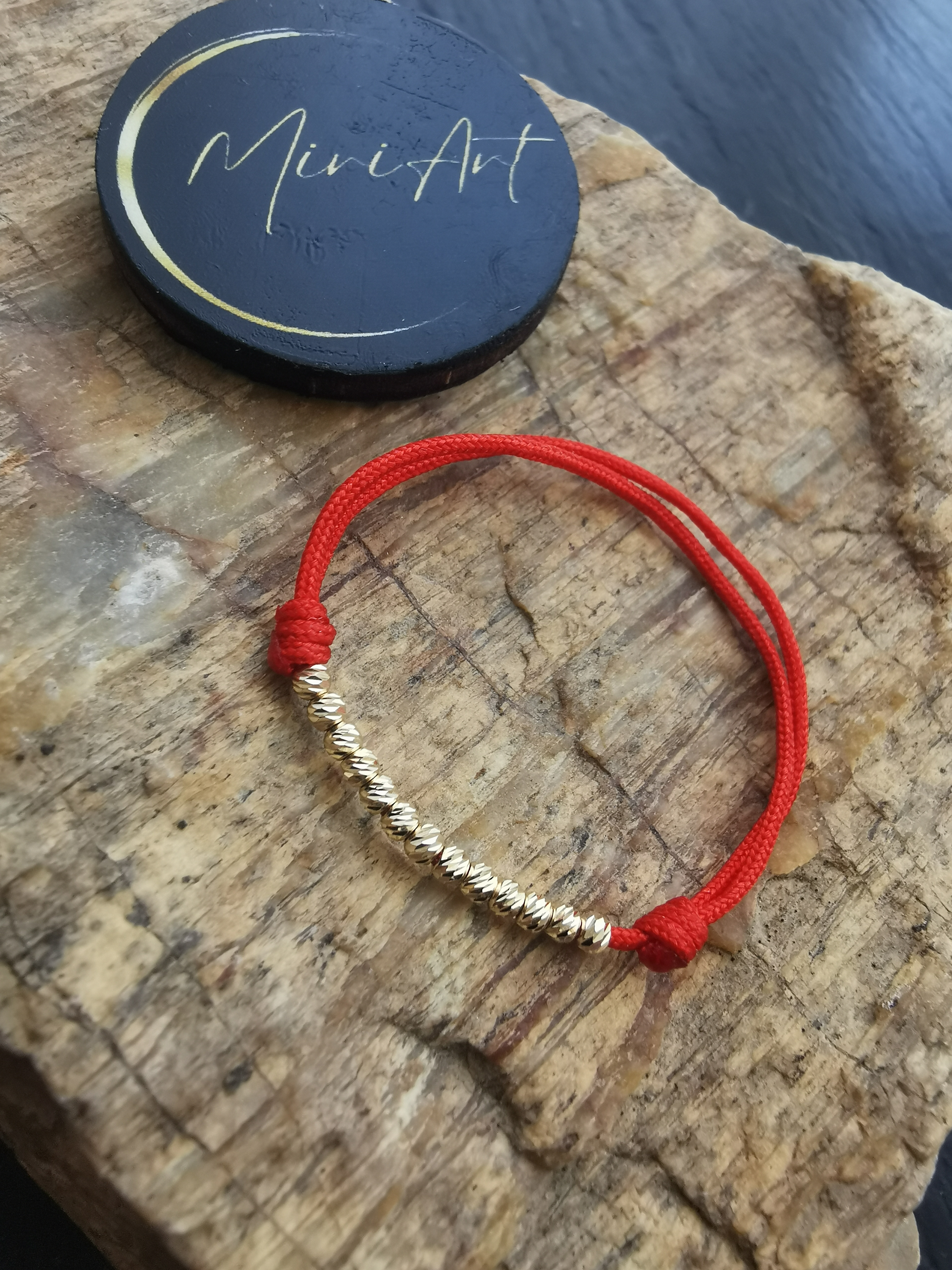 Brățară handmade cu 13 sfere de 2,5mm din aur 14k, montate pe un șnur rezistent, cu închidere reglabilă cu noduri, ușor de ajustat pentru orice încheietură.