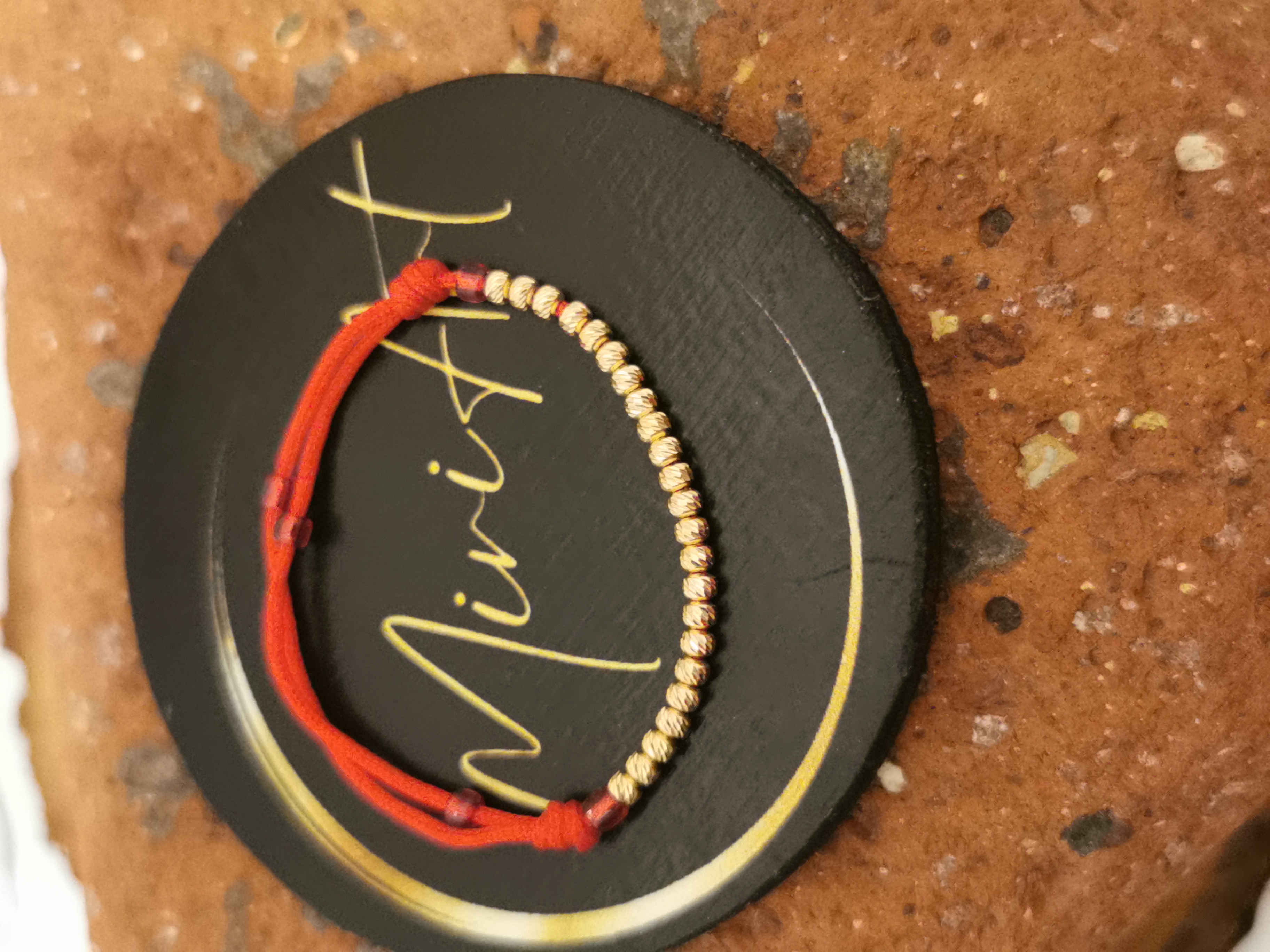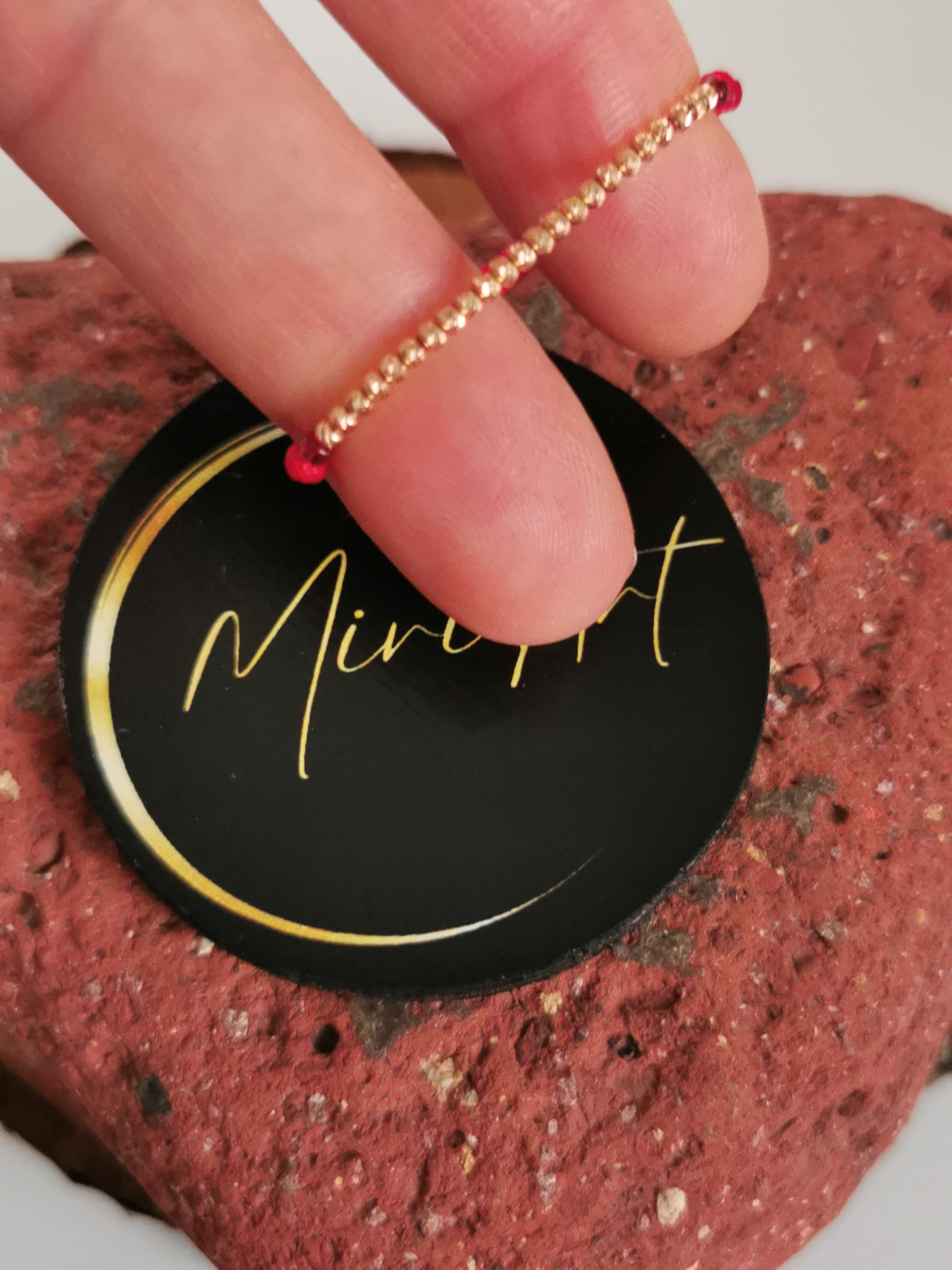 Brățară handmade cu 23 sfere de 2mm din aur 14k, mărgele Toho, montate pe un șnur rezistent, cu închidere reglabilă cu noduri, ușor de ajustat pentru orice încheietură.